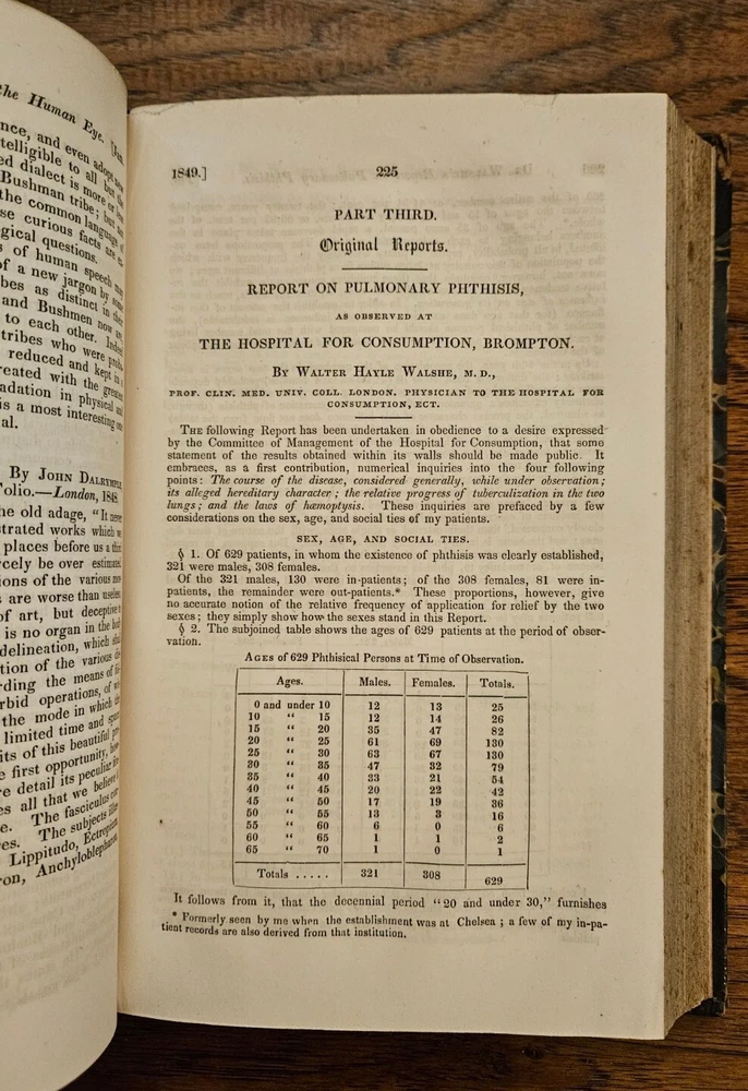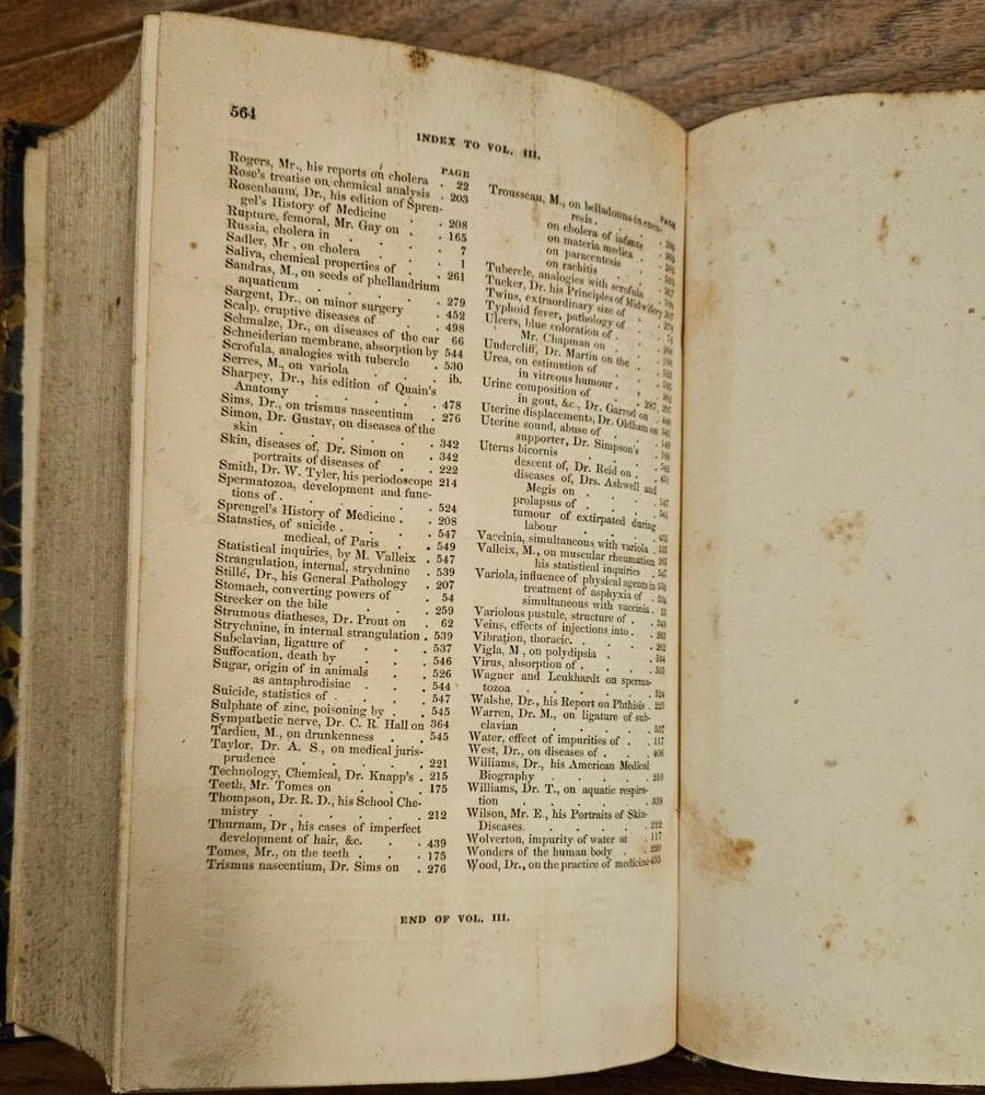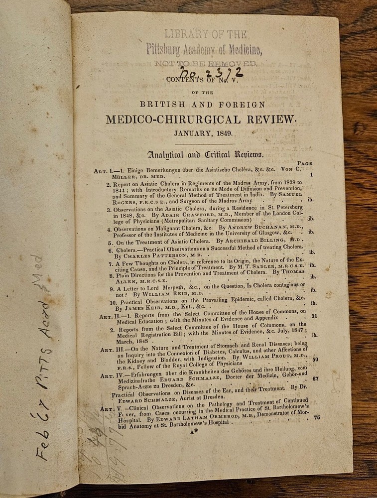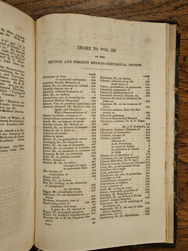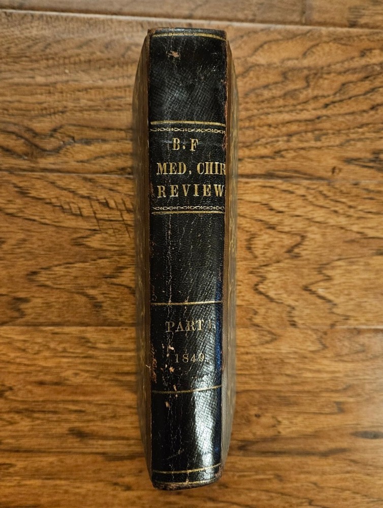 Original 1849 The British and Foreign Medico-Chirurgical Review And Journal of Practical Medicine Quarterly January 1849 and April 1849 bound together Volume III. Very Good Condition, very little foxing on pages clear, a few pencil notes, Massachusetts Medical Center Label inside front cover and stamps, leather and marbled paper bound 5.5" x 8.5" tall with 564 pages Some authors of Medical Articles: Von C. Muller, Samuel Rogers, Adair Crawford, Andrew Buchanan, Archibald Billing, Charles Patterson (Dublin), M. T. Sadler, Thomas Allen, William Reid, James Keir, William Prout, Eduard Schmalze, Edward Schmalze, Edward Latham Ormerod, William Henry Robertson, Charles D. Meigs, Samuel Ashwell, John Gay, R. Christison, John Tomes, John Quekett, S. T. Coleridge, Henry Freke, H. T. Chapman, A. Normandy, Emile Blanchard, Golding Bird, John Reid, Gustav Simon, John Boggie, C. Radclyffe, Georges Cuvier Included are Variety of topics including, Lectures, Medical Case Studies short and longer, reports, papers & book reviews, during or before 1849. Some Contents: Cholera Female Diseases Diet and Regimen, Dispensatory (Drugs) Microscope Theory of Life from S. T. Coleridge by Seth Watson -- Atomic Theory by Henry Freke -- Reflections on Organization, or Suggestions for the Construction of an Organic Atomic Theory- Leg Ulcers Chemical Analysis Pulmonary Phthisis with many charts Consumption (Tuberculosis) Circulation in Insects by Emile Blanchard Injection into the Veins (Intravenous therapy) by Manzolini and Quaglino of Milan Surgery for Hair Lip Pregnant Women Colomel by M. Michea Lupus and Cod Liver Oil by M. Emery Gangrene War diseases Skin Diseases Sympathetic Nerve Galvanism Electricity Therapeutics 6 publications Fractures and Dislocations Diseases of Children Petit's Operation on Hernia Cancer of the Peritoneum Elements of Anatomy by Jones Quain Diseases of Old Age by G. E. Day with charts of most common etc Animal Kingdom by Baron Georges Cuvier Ozone and Influenza by Dr. Spengler Hospital Statistics charts Alphabetical Index