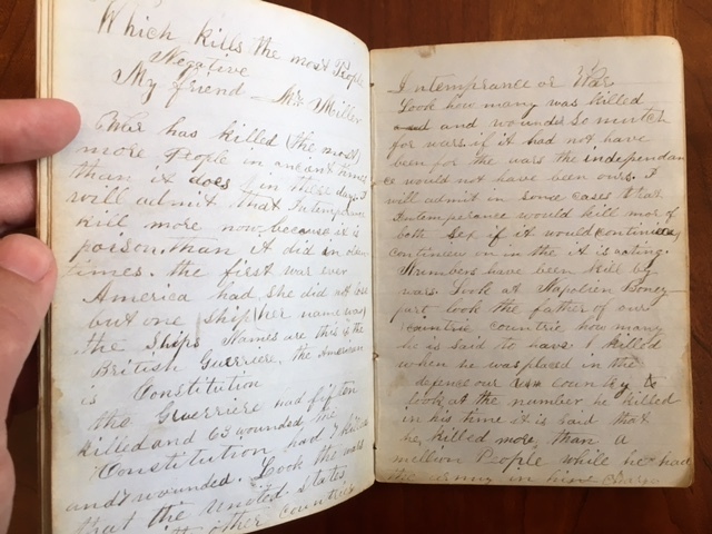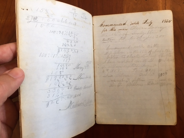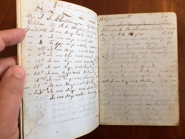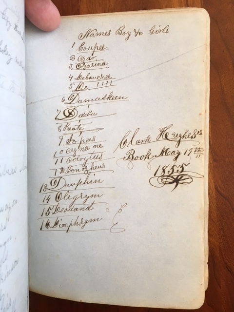 1850's Ledger of C. Hughes Madison College, Uniontown, Pennsylvania and later from Clinton, Dewitt County, Illinois. By C. Hughes Published: Uniontown, Pennsylvania; Clinton, Illinois, 1859 . Approx. 7" x 5" ledger book. Brown leather covers. Spine is perished. Covers very loose and barely attached to the binding. J. C. Hughes name etched on the rear cover. 77 lined blue paper pages. Ledger mostly used with a couple of blank pages. One page is torn in half. Inscription - "C R Hughes Book Madison College Uniontown May 6th, 1855" written on the front paste down. C. Hughes name also written on a few of the early pages. The first pages of ledger consist of notes, work, and an 8 page manuscript section of essays/lectures. 14 pages of listed subjects: Testament, Arithmetic, Reader, Spelling, and Geography with names of students and numbers follows the manuscript section. A list of work dates (no year specified) from Feb. 28th to August 27 is recorded on the next 8 pages. Another 14 pages of hand written lectures and essays (possibly from 1855) are recorded towards the back of the ledger. At some point the ledger and/or owner of the ledger locate to Clinton, Dewitt County, Illinois. A date of 1859 is written on a couple of the entries. The next to last page contains a first name list of boys and girls. The page is inscribed - "Clark Hughes 1855". John C. Hughes Uniontown, Fayette County, Pennsylvania name is written on the next to last page in the book. Madison College, Uniontown, Pennsylvania was a Methodist School operating from 1851-1858. "Clark Huges" name is listed in 1855-56 class at Madison College according to a History of Uniontown, Pennsylvania by James Hadden, 1913 Not Ex-Lib. I've done my best to describe the book, but if you have additional questions, please don't hesitate to send me an e-mail.