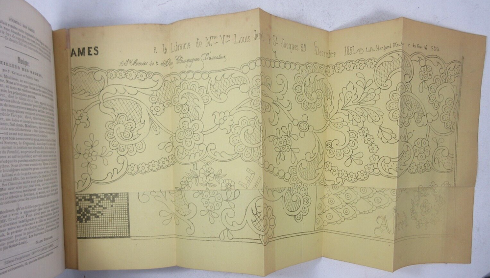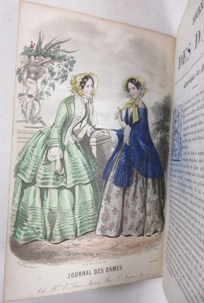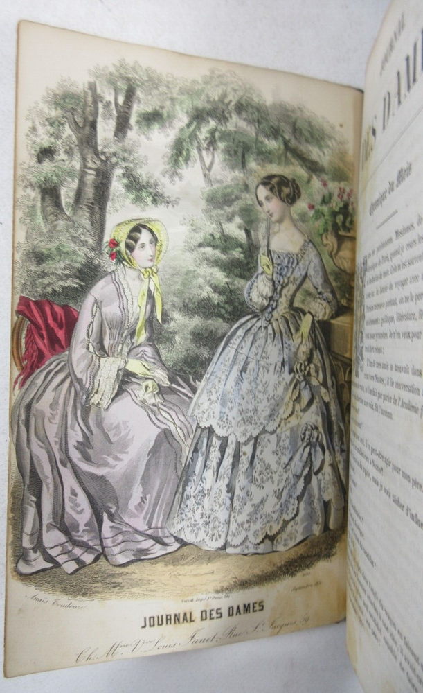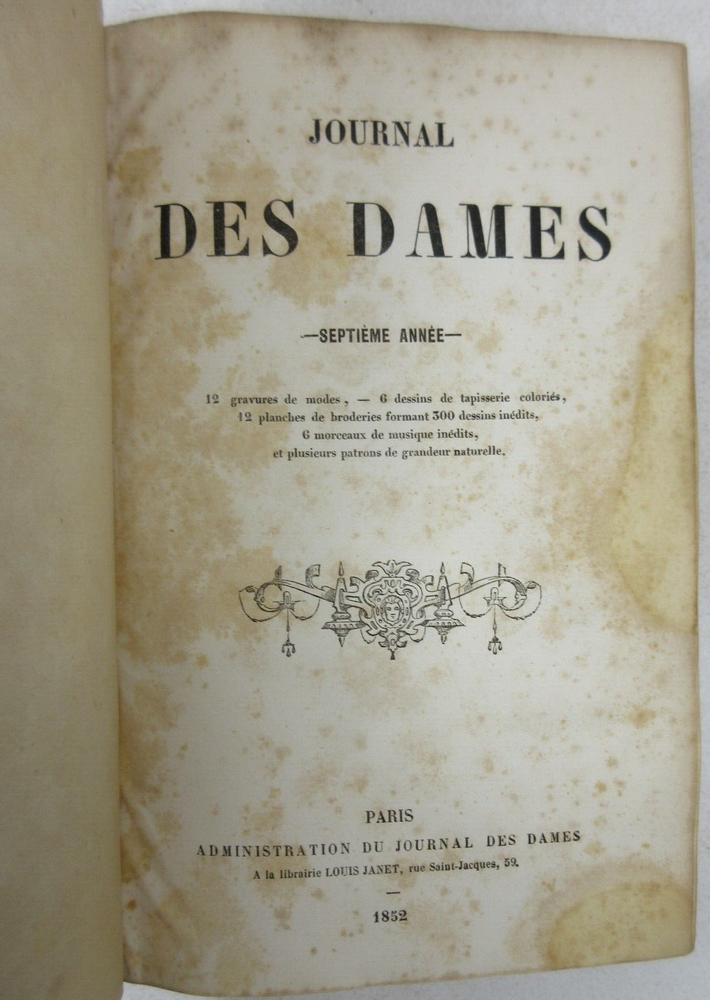 For sale is a Good condition hardcover copy of Journal Des Dames: Septieme Annee published by Louis Janet. Illustrated with dozens of full-color plates and various fold out designs. Text is in French language. Binding is sound and pages are unmarked, with the exception of age toning and foxing throughout, as well as the previous owner's name written on the front free endpaper. Boards show minor shelf wear with scuffing on front and back covers, as well as chipping along the spine. The boards also have light bumping and chipping to the corners. Please see photos for condition detail. Shelf Reference #L-1557