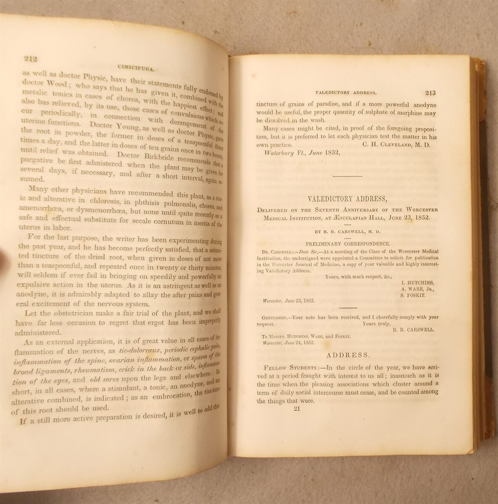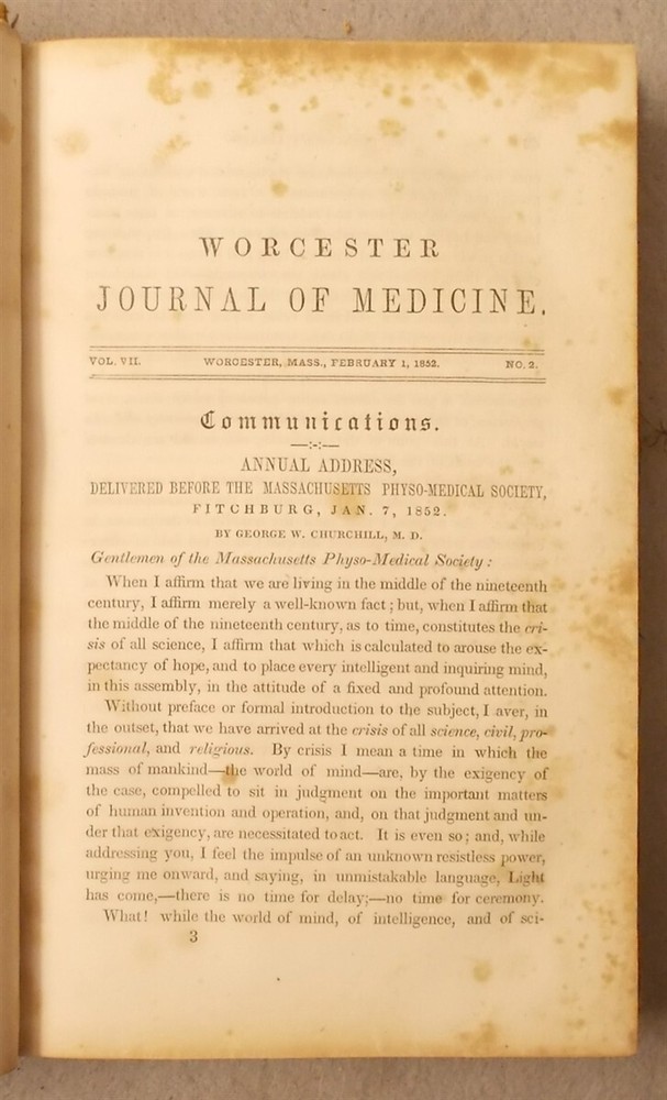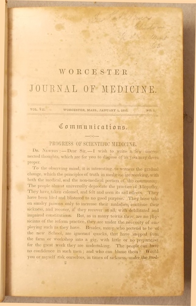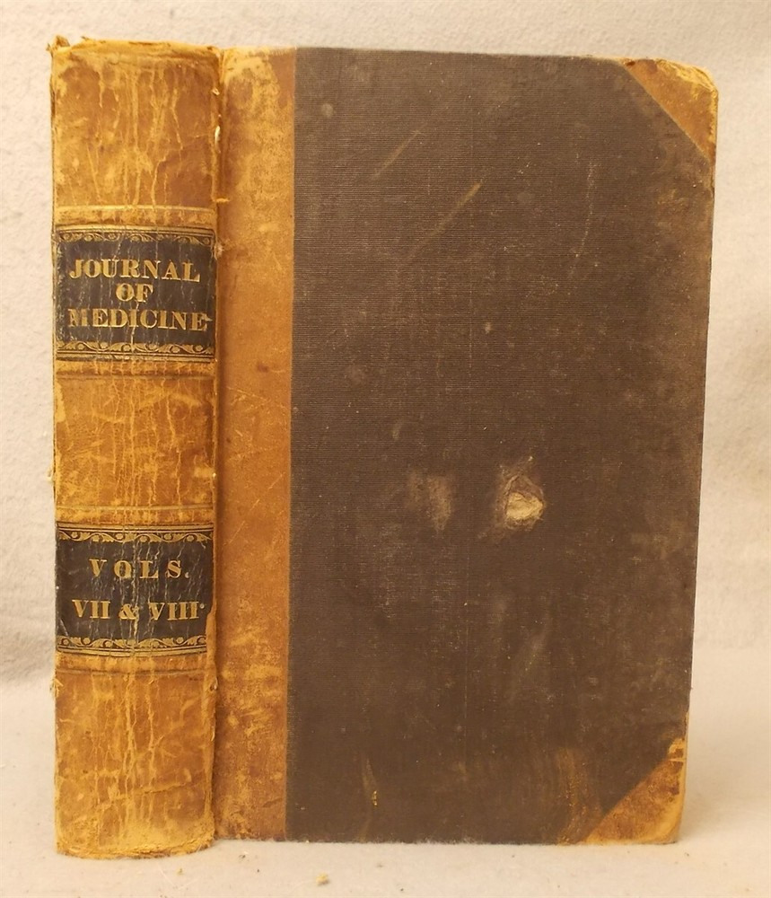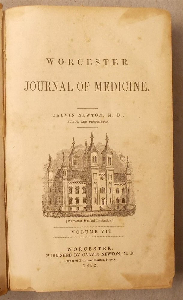 Newton, Calvin. Worcester Journal of Medicine, 24 Issues (Volume VII: January-December 1852 and Volume VIII: January-December 1853) [Massachusetts, MA]. Worcester, MA: Calvin Newton and Henry Howland, 1852. Leather: Fair 9" x 6", 384pp. & 384pp, bound in half leather over cloth boards. The joints are split and the hinges cracked, the leather is worn. The contents are in good condition with some foxing and occasional tanning to the leaves; the final leaf has a chip in the