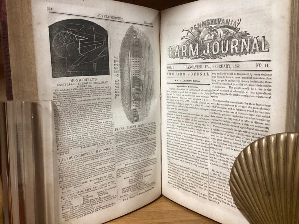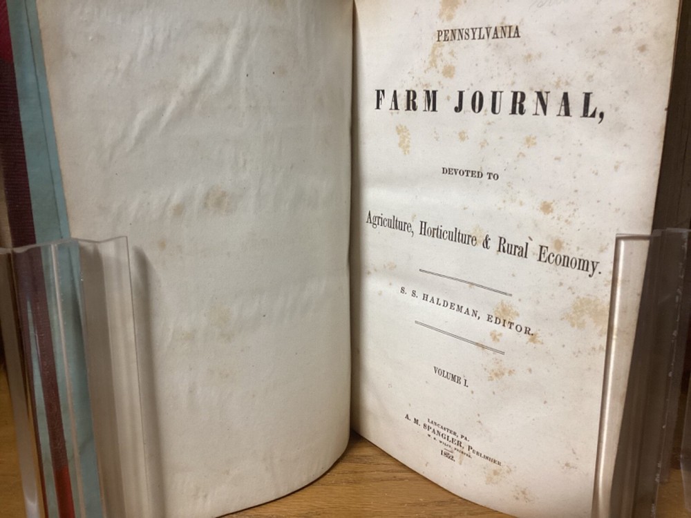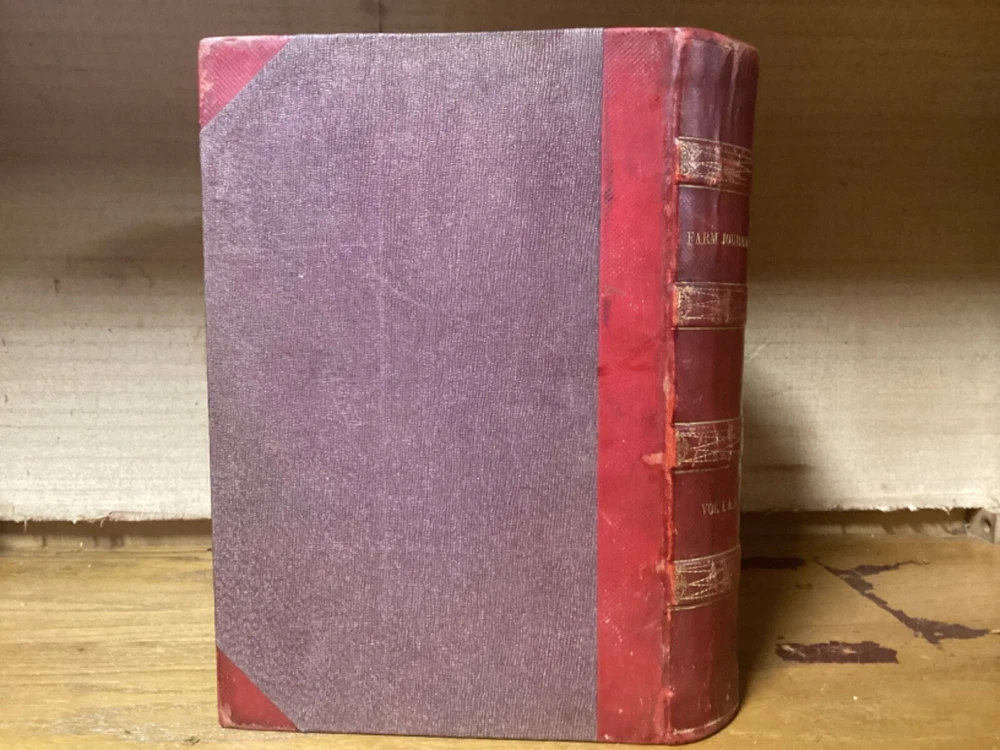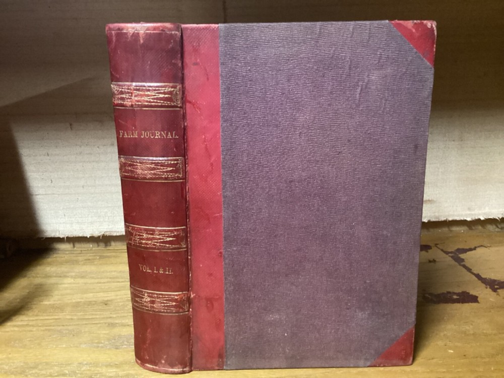 Pennsylvania Farm Journal, Devoted to Agriculture, Horticulture, and Rural Economy. Edited by S.S. Haldeman and printed in Lancaster, Pennsylvania by A.M. Spangler. 1852 and 1853, two volumes in one, 380 and 384 pp, 10.5” x 7.25”, 8vo, hardcover 3/4 leather. In good condition, with superficial rubbing and wear to exterior, primarily along edges and corners. Hinges remain in good condition and text block remains bound well. Bookplate and small inscriptions at front. Nicely illustrated with black-and-white sketches of animals and more. General age-related toning to pages, along with periodic foxing and wear. Please see photographs and ask any questions prior to purchasing. A scarce 1st and 2nd yearly volumes of Pennsylvania agricultural news, bound as part of a larger set. COLN1852BHKD-0724-aj1768