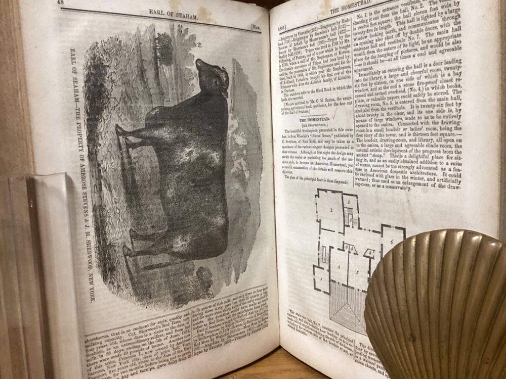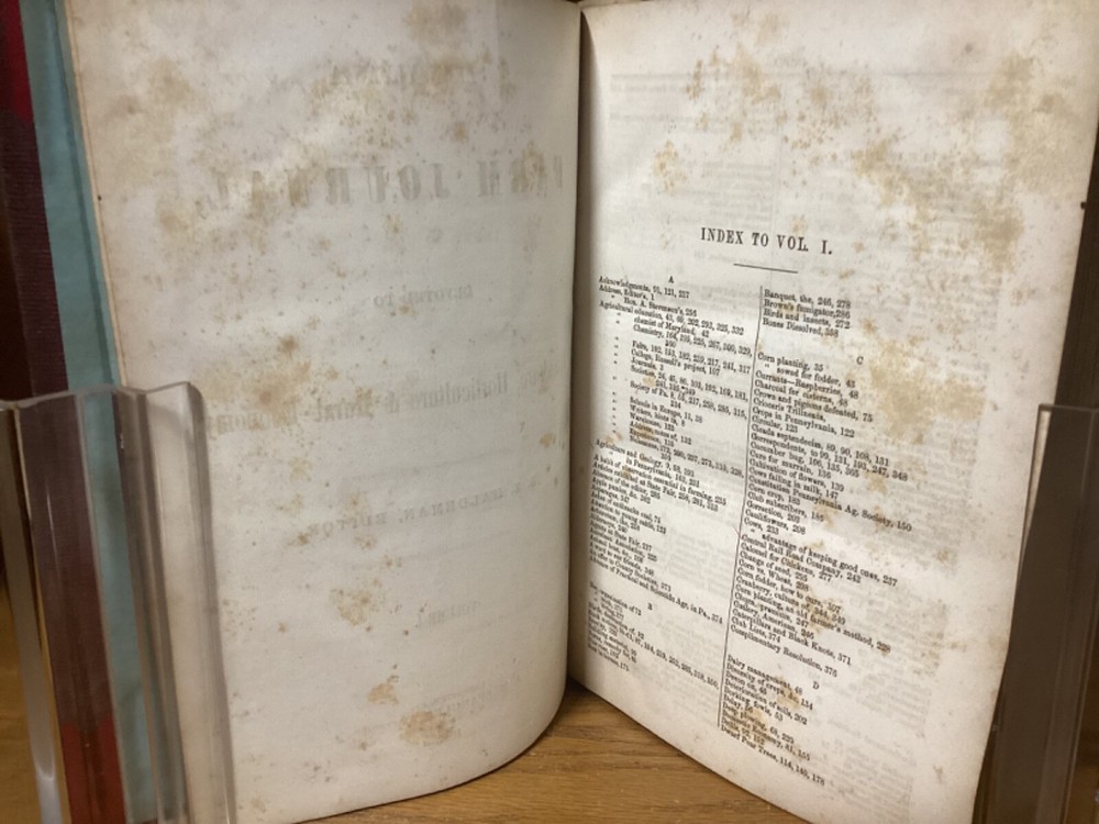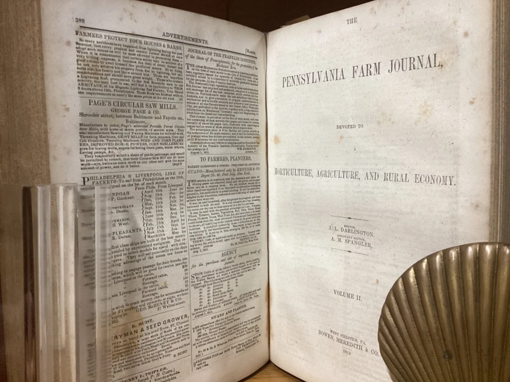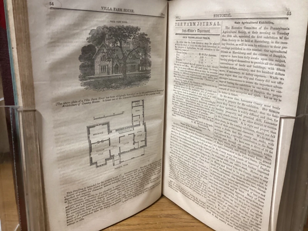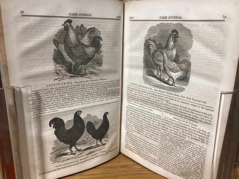 Pennsylvania Farm Journal, Devoted to Agriculture, Horticulture, and Rural Economy. Edited by S.S. Haldeman and printed in Lancaster, Pennsylvania by A.M. Spangler. 1852 and 1853, two volumes in one, 380 and 384 pp, 10.5” x 7.25”, 8vo, hardcover 3/4 leather. In good condition, with superficial rubbing and wear to exterior, primarily along edges and corners. Hinges remain in good condition and text block remains bound well. Bookplate and small inscriptions at front. Nicely illustrated with black-and-white sketches of animals and more. General age-related toning to pages, along with periodic foxing and wear. Please see photographs and ask any questions prior to purchasing. A scarce 1st and 2nd yearly volumes of Pennsylvania agricultural news, bound as part of a larger set. COLN1852BHKD-0724-aj1768