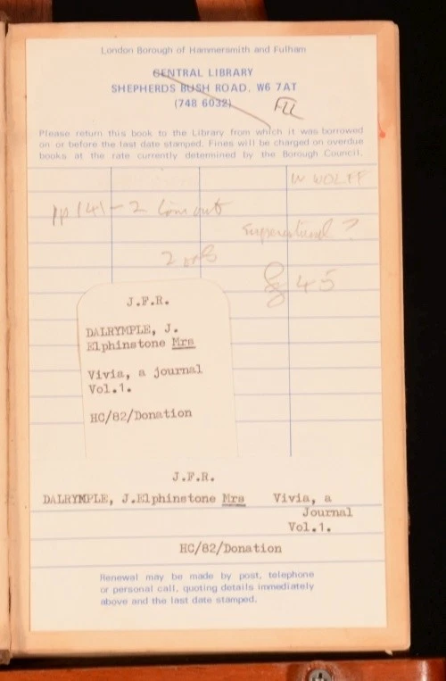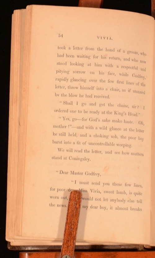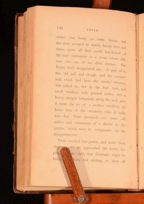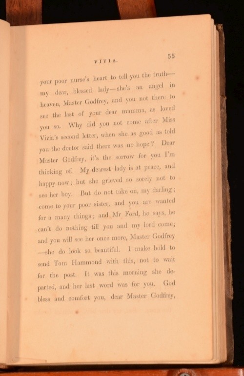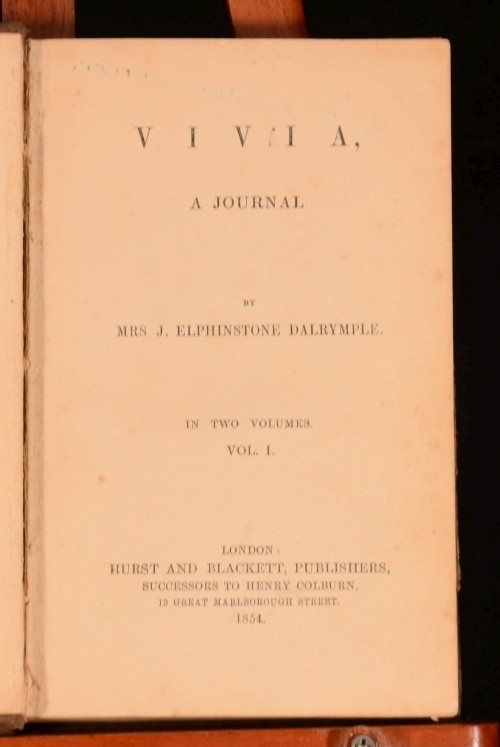 Click here to see our other books! Vivia A Journal Mrs J Elphinstone Dalrymple 1854 Hurst and Blackett Publishers : London 7.5" by 4.5" 321pp; 325pp SUMMARY A very scarce novel from the mid-nineteenth century. First Edition,Leather Binding Overall Condition: Fair This book weighs 1 KG when packed UK Postage: £ 3.99 US Postage: £ 22.99 EU Postage : £ 16.99 European Postage: £ 17.99 Asia Postage: £ 22.99 Worldwide Postage: £ 28.99 DESCRIPTION First edition. Complete in two volumes. CONDITION In half-calf bindings. Externally sound, though rubbed, with marks to the boards. Hinges are slightly strained. Internally, generally firmly bound although slightly strained in places. Library labels to front free-endpaper. Ink signatures to front pastedowns. Loss to page 141-42, affecting the text. Pages are marginally age-toned, with some spotting throughout. Overall Condition: Fair GLOSSARY OF TERMS Overall Condition (Dustwrapper condition rating is shown after that for the book itself, where a dustwrapper is present) Fine - Very well preserved copy showing very little wear Very Good Indeed - Only one or two minor faults, really a very attractive copy Very Good - Quite a wide term meaning no major faults but probably several smaller ones often expected given the age of the book, but still a respectable copy Good - Meaning not very good. Some more serious faults as will be described in the condition report under 'condition' Good Only - Meaning one or more faults that could really do with repair Fair - As with good only above but with other faults leaving a compromised copy even after repair Poor - Really bad and possibly seriously incomplete. We only sell books in this condition where their rarity or value makes them attractive none the less. Major defects will be described. GUARANTEE We offer a full money back guarantee on our descriptions. Please ask for details and conditions. We prefer PAYPAL. If you pay via PAYPAL we will post the item off the same or the next working day with the postage you have selected. Please note we cannot accept USD cheques