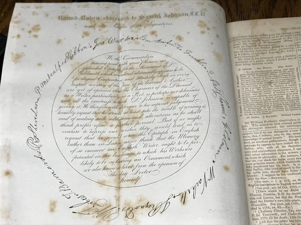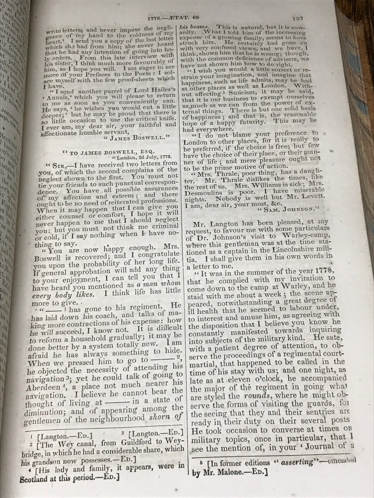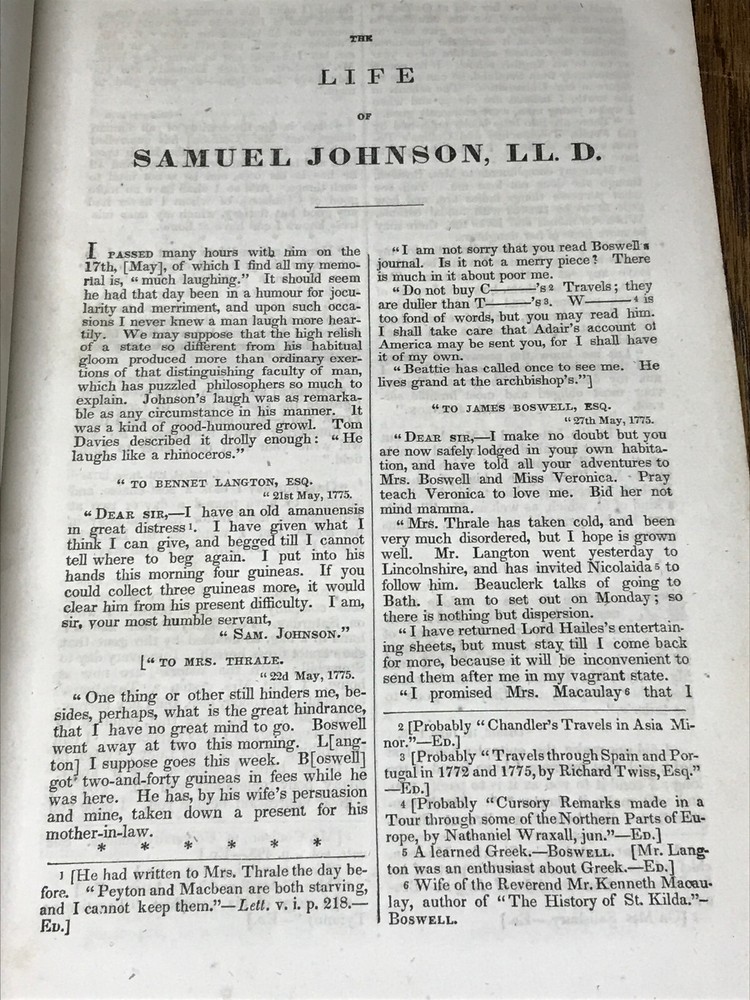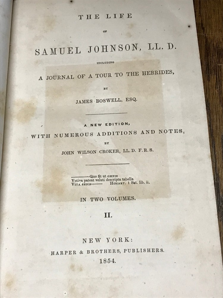 The Life Of Samuel Johnson, LL.D. Including A Journal Of A Tour To The Hebrides, By James Boswell, Esq. A New Addition, With Numerous Additions And Notes. Volume II only of Two Volumes. New York: Harper & Brothers, Publishers, 1854. Publisher's full leather covered boards, 4 raised bands on spine, black morocco labels with gilt titles. 566 pages, marbled edges. Illustrated with a frontispiece portrait engraving, a fold-out plate. Measures 9 1/4" x 6 1/4".