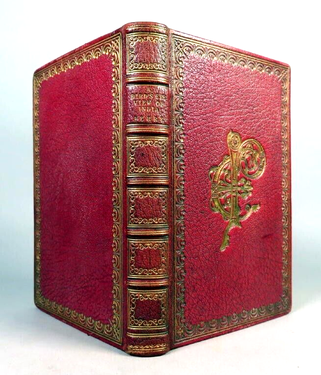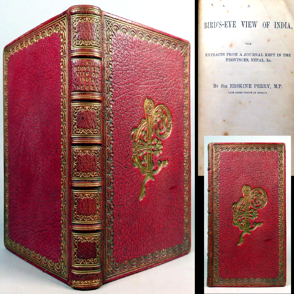 A BIRD'S EYE VIEW OF INDIA WITH EXTRACTS FROM A JOURNAL KEPT IN THE PROVINCES, NEPAL, &C. 1855; Thomas Erskine Perry (Inscribed); 1st Edition; London, John Murray; Full Leather ; 8/277 Pages; w4.3"xh6.6"; Very Rare! ATTRIBUTES: Beautiful full red morocco leather cover design with gold decorative borders, pretty gold centerpiece to front (India Symbol?), matching lovely gold binding, gold gilded cover/inner cover edges, gold gilded page edges, Inscribed verso first end page "From the Author March 1857", and a Great Travel/History Read! SUMMARY: Thomas Erskine Perry became a judge of the Supreme Court of Bombay in 1840, taking up office the following year and remaining in India for the next eleven years. The present work, written after his return to Britain, contains a first part devoted to an overview of Indian geography, society, natural history, and the like. The second part comprises Erskine s Journal of a Vacation Trip in India, through Rajputana, the North-West Provinces, and Nepal , the high-point of which is his visit to Katmandu. Sir Thomas Erskine Perry (20 July 1806 – 22 April 1882) was a British Liberal politician and judge in India . After serving as chief justice of the supreme court in Bombay and as a Member of Parliament in Britain, he served as a member of the Council of India for 21 years. CONDITION: Good. IMPORTANT READ If any problems with product, email me and we will work out a solution. Must have payment arrangements within 7 days or will relist item. If purchasing more than one item, hold payment so I can deduct shipping. I like to send off after a week or so. Bubble wrapped and then wrapped in cardboard and mailed in a bubble wrapped envelope in most cases. Will Ship Worldwide. Flat Domestic Shipping Fee of $4.99. Click on Tab for International Rate Above My Title, typically $32.99, Canada $27.99, but depends on size/weight. Additional shipping services/rates can be applied. Tracking Number will be on your invoice details page. We typically ship daily. We accept paypal, c.c., m.o. !!Thanks for Viewing!!