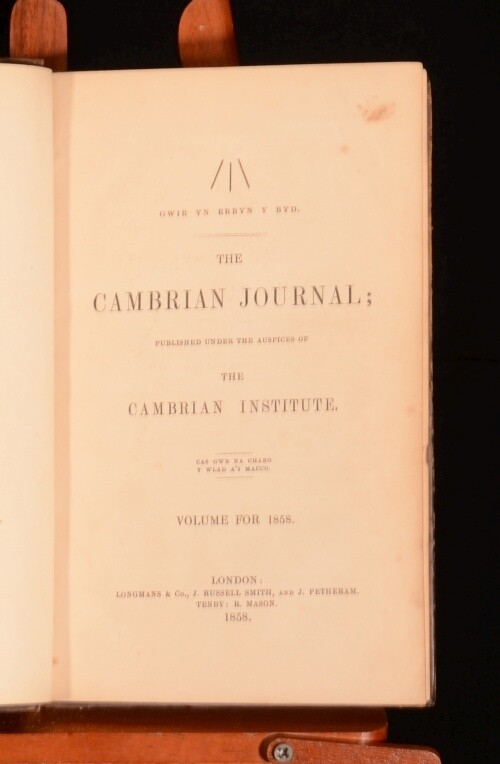 Click here to see our other books! The Cambrian Journal Volume for 1858 The Cambrian Institute 1858 Longmans and Co : London 8.5" by 5.5" iv, 384pp SUMMARY The Cambrian Journal; published under the auspices of The Cambrian Institute. Volume for 1858. Leather Binding Overall Condition: Good This book weighs 0.75 KG when packed UK Postage: £ 3.99 US Postage: £ 19.99 EU Postage : £ 15.99 European Postage: £ 16.99 Asia Postage: £ 21.99 Worldwide Postage: £ 25.99 DESCRIPTION A very early publication of the Welsh Triads (Knights of Arthur). A retrospective on the year 1858 discussing the developments for the nation of the Welsh people. 'One of the main features of this volume is the publication of the MS. fragments, which, though highly valuable in a historical point of view, would in a few years no doubt have fallen sacrifice to the bite of time, were they not thus rescued. We are in possession of a considerable store of these documents, which we shall from time to time bring to light.' Cambria is the classical name for Wales, being the Latinised form of the Welsh name Cymru (Wales). With previous owner's bookplate to front pastedown. CONDITION In a full long grain morocco binding. Externally, generally sound but with bumping and wear to extremities, marks to boards and an institutional label tipped-in to front board. Internally, firmly bound. Bright but with the odd spot and mark to pages. With an institutional label to front free endpaper. Overall Condition: Good GLOSSARY OF TERMS Overall Condition (Dustwrapper condition rating is shown after that for the book itself, where a dustwrapper is present) Fine - Very well preserved copy showing very little wear Very Good Indeed - Only one or two minor faults, really a very attractive copy Very Good - Quite a wide term meaning no major faults but probably several smaller ones often expected given the age of the book, but still a respectable copy Good - Meaning not very good. Some more serious faults as will be described in the condition report under 'condition' Good Only - Meaning one or more faults that could really do with repair Fair - As with good only above but with other faults leaving a compromised copy even after repair Poor - Really bad and possibly seriously incomplete. We only sell books in this condition where their rarity or value makes them attractive none the less. Major defects will be described. GUARANTEE We offer a full money back guarantee on our descriptions. Please ask for details and conditions. We prefer PAYPAL. If you pay via PAYPAL we will post the item off the same or the next working day with the postage you have selected. Please note we cannot accept USD cheques