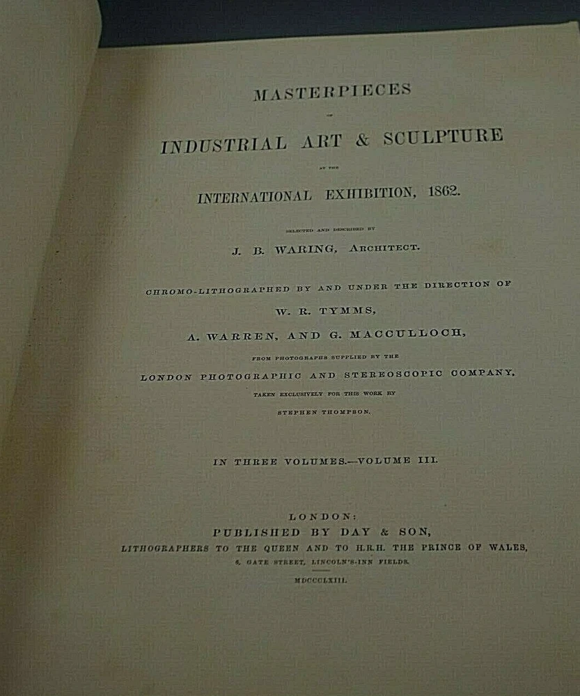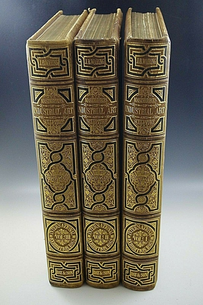 HELLO AND WELCOME TO MY STORE FOR SALE A SET OF THREE LEATHER BOUND VOLUMES OF 'MASTERPIECES OF INDUSTRIAL ART AND SCULPTURE AT THE INTERNATIONAL EXHIBITION, 1862' BY J.B. WARING, PUBLISHED BY DAY & SON, LONDON VERY LARGE Each volume 17in. x 12in. Bearing hundreds of chromolithographs. Leather bound with gilt embellishments IT WILL COME WITH COSTUME MADE PROTECTIVE CLEAR BOX WITH WOOD BOTTOM 20'' x 15'' x 12'' BOOKS AND BOX ARE VERY HEAVY I DO INSPECT MY ITEMS CAREFULLY PRIOR TO SHIPPING. THE PACKING PROCESS ( TO AVOID CONFUSION IS VIDEO TAPED) We are experienced packers of breakable items. We use new box's, bubble wrap and peanuts We don't used boxes from the grocery store and wrap a couple of pieces of newspaper around it. I am not a collector or grader, so please inspect the pictures carefully to determine the condition, and if you have any questions please ask them before placing your bid Feedback: It is very important to us to have a Positive & 5 Star eBay Transaction. So if possible please leave POSITIVE FEEDBACK for us. We leave our customers Positive Feedback right after they do it for us. I am HONEST person, I ship quickly, wrap my items carefully. I guarantee authenticity of my items. Please leave feedback and I will do the same. WE ARE A FAMILY RUN BUSINESS THANK YOU FOR LOOKING gora