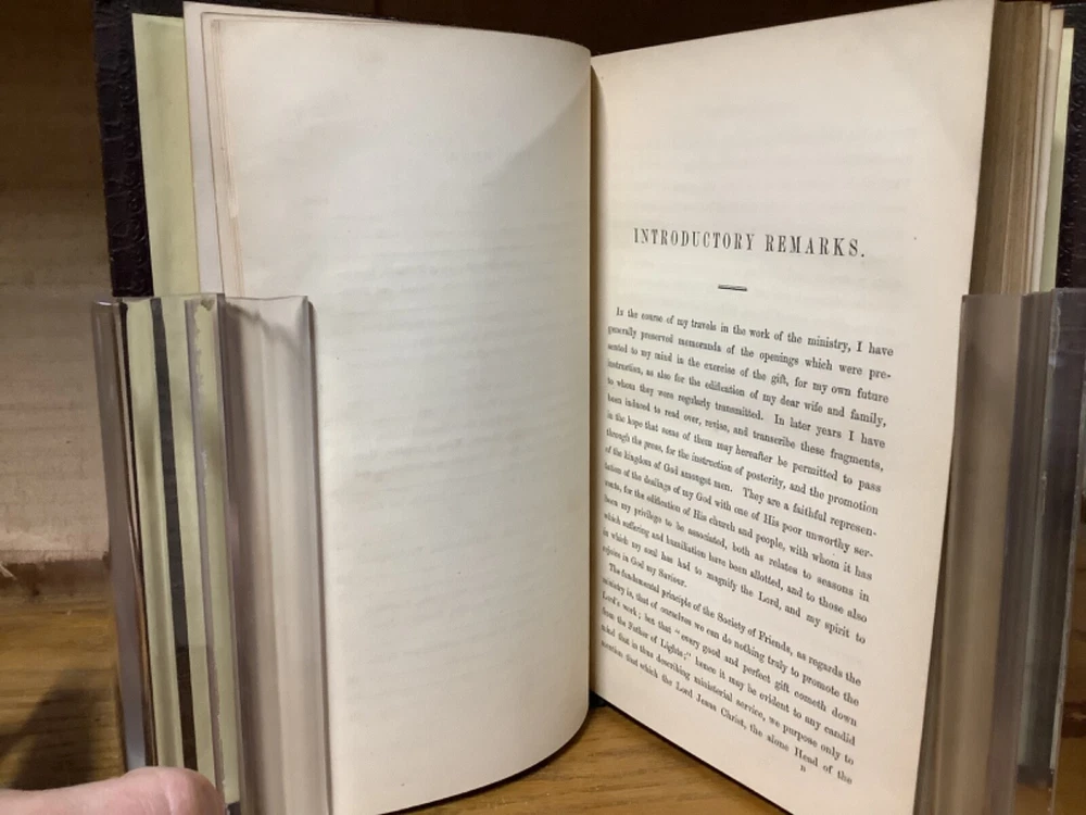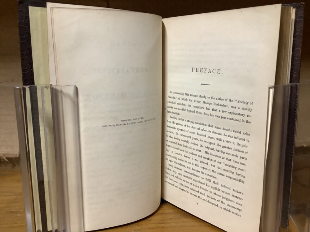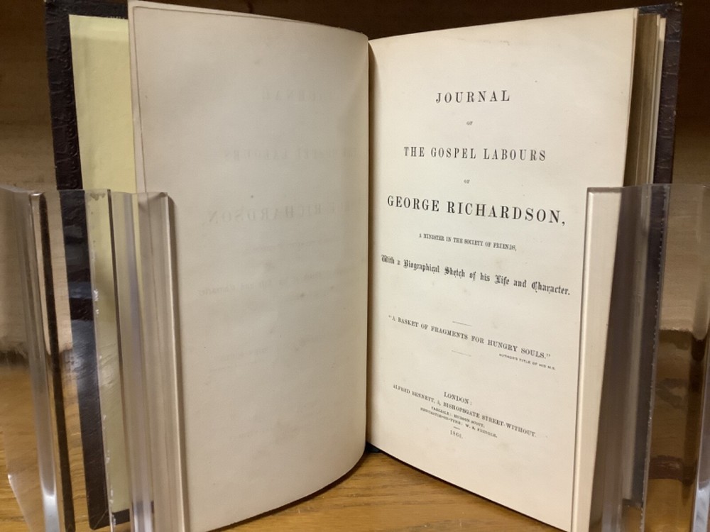 Journal of the Gospel Labours of George Richardson, a Minister in the Society of Friends, with a Biographical Sketch of his Life and Character. Printed in London by Alfred Bennett. 1864, 8.75” x 6”, 8vo, hardcover full leather. Overall very good. Light rubbing and wear to boards and spine. Hinges remain in good condition and text block remains bound well. 1864 inscription by “G.R.”, presumably Robinson, on first end page. General age-related toning to pages, along with periodic foxing and wear. Please see photographs and ask any questions prior to purchasing. A scarce and extremely attractive copy of the life, travels, and character of British Quaker George Richardson. COLR1864BEFG-0224-aj0979