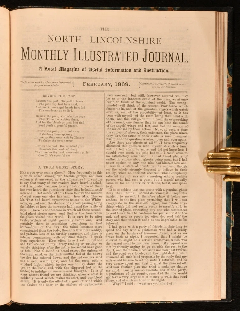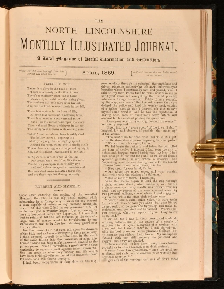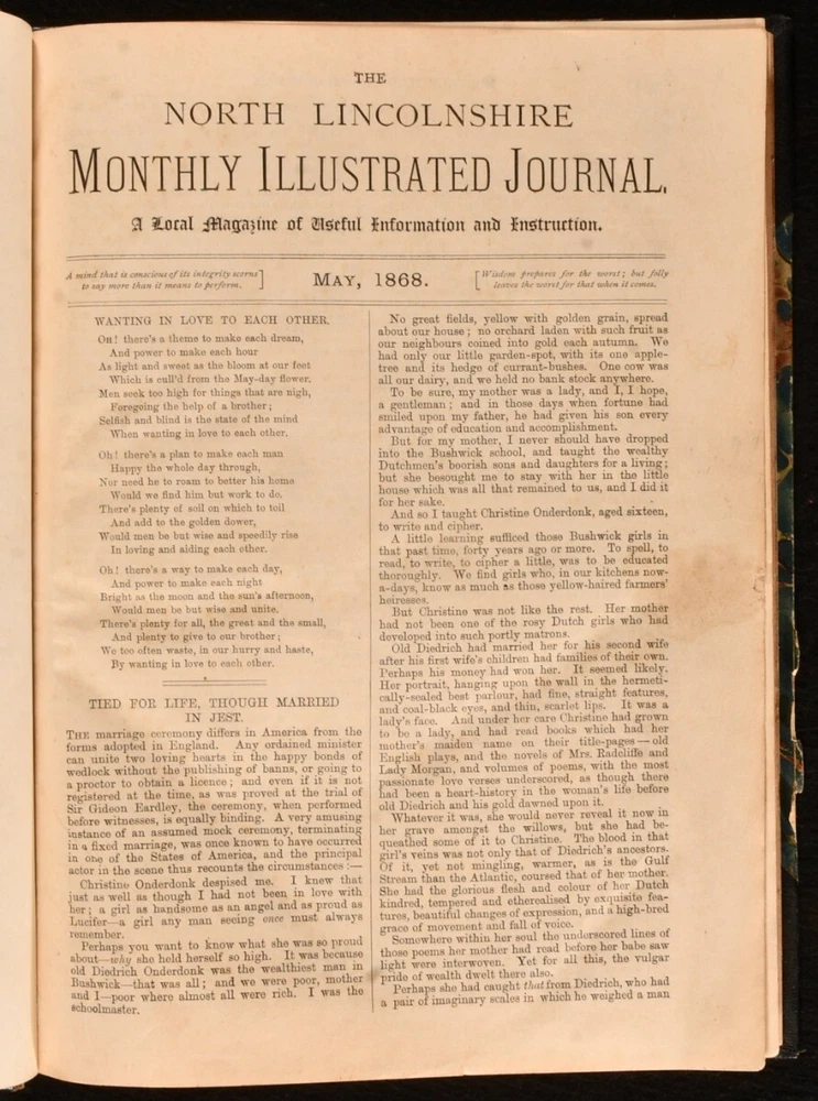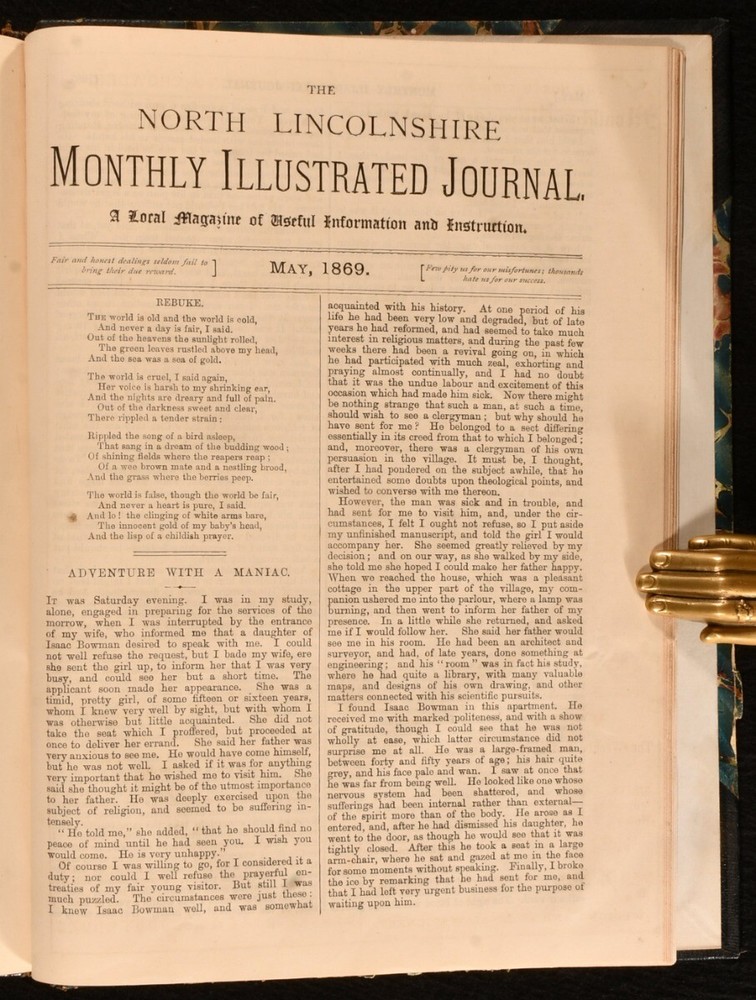 Click here to see our other books! The North Lincolnshire Monthly Illustrated Journal Anonymous 1868-1869 The North Lincolnshire Monthly Illustrated Journal : North Lincolnshire 11" by 8" 20; 20; 20; 20; 20; 20; 20; 20; 20; 20; 20; 20pp SUMMARY Twelve consecutive issues of the vanishingly scarce periodical 'The North Lincolnshire Monthly Illustrated Journal'. Illustrated,Leather Binding,Very Scarce Overall Condition: Very Good This book weighs 1 KG when packed UK Postage: £ 3.99 US Postage: £ 22.99 EU Postage : £ 16.99 European Postage: £ 17.99 Asia Postage: £ 22.99 Worldwide Postage: £ 28.99 DESCRIPTION A very scarce periodical described as 'a local magazine of useful information and instruction'. Present here are twelve consecutive monthly issues, from May 1868 to May 1869. Featuring articles on international travel, short pieces of fiction and poetry, and works on local history, including discussion of 'History of the Old Church of Gainsbrough', 'Early Methodism of Gainsborough', 'Lincolnshire in the Olden Times', and 'The History and Restoration of Alford Church'. With charming vignette illustrations throughout. With advertisements to the final leaf of each issue. Pencil inscriptions by a prior owner to the front free endpaper. Bound together in a smart half morocco binding. CONDITION In half morocco bindings, with marbled paper covered boards. Rubbing and minor loss to back strip heads and tails, otherwise externally smart. Pencil inscriptions to front free endpaper. Internally, firmly bound. Pages exceptionally clean and bright. Overall Condition: Very Good GLOSSARY OF TERMS Overall Condition (Dustwrapper condition rating is shown after that for the book itself, where a dustwrapper is present) Fine - Very well preserved copy showing very little wear Very Good Indeed - Only one or two minor faults, really a very attractive copy Very Good - Quite a wide term meaning no major faults but probably several smaller ones often expected given the age of the book, but still a respectable copy Good - Meaning not very good. Some more serious faults as will be described in the condition report under 'condition' Good Only - Meaning one or more faults that could really do with repair Fair - As with good only above but with other faults leaving a compromised copy even after repair Poor - Really bad and possibly seriously incomplete. We only sell books in this condition where their rarity or value makes them attractive none the less. Major defects will be described. GUARANTEE We offer a full money back guarantee on our descriptions. Please ask for details and conditions. We prefer PAYPAL. If you pay via PAYPAL we will post the item off the same or the next working day with the postage you have selected. Please note we cannot accept USD cheques