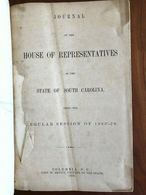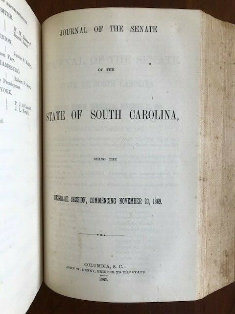 Journal of the House of Representatives of the state of South Carolina, Being the Regular Session of 1869-1870. Published Columbia, S.C. : John W. Denny, Printer to the State, 1870. 523, 96, 4 pp. Hardcover with leather spine and gilt lettering. BOUND WITH. Journal of the Senate of the state of South Carolina, Being the Regular Session Commencing November 23, 1869. Published Columbia, S.C. : John W. Denny, Printer to the State, 1869. 531, 83, 1 pp. Various pieces of ephemera laid in throughout. I've done my best to describe the book, but if you have questions, please don't hesitate to send me an e-mail.