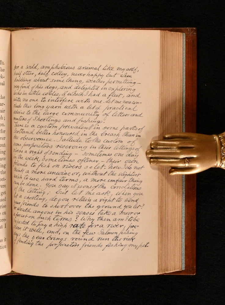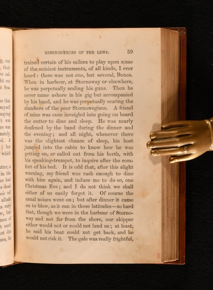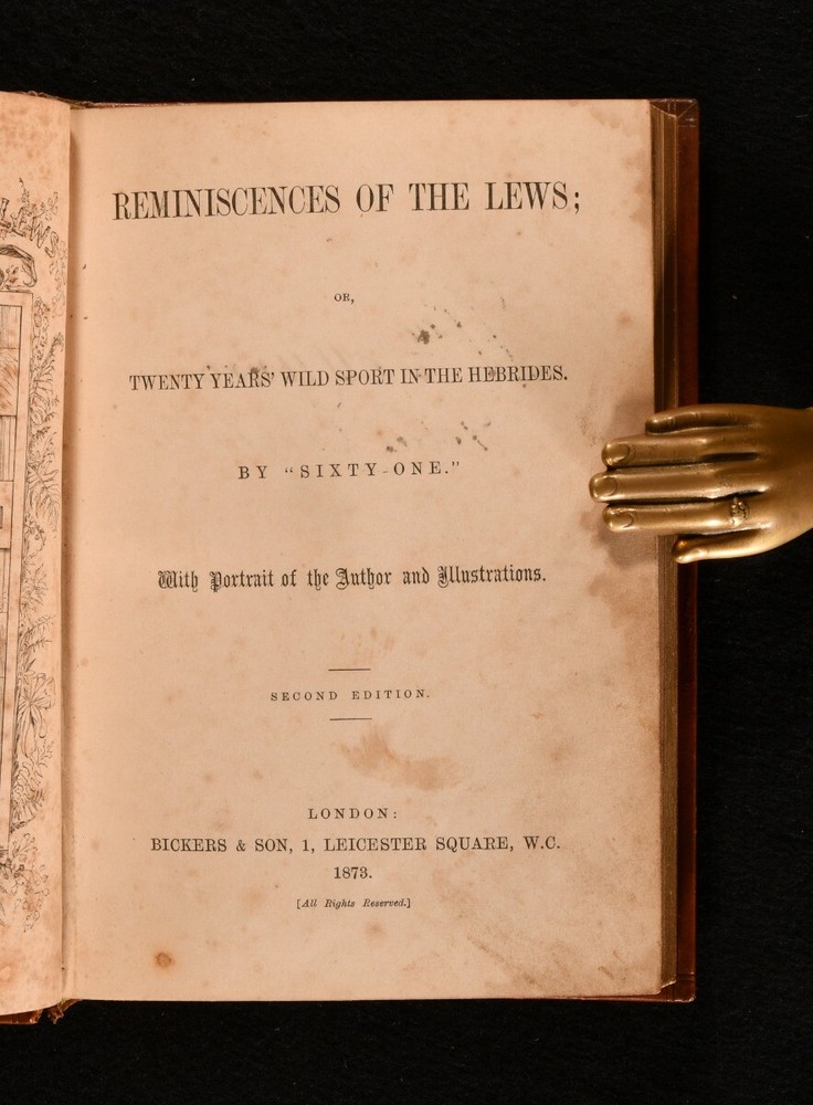 Click here to see our other books! Reminiscences of the Lews - Or, twenty years' wild sport in the Hebrides G. W. Hely-Hutchinson 1873 Bickers and Son : London 7.5" by 5" [5], vi-vii, [2], 272pp SUMMARY A very smart second edition of this scarce work from G. W. Hely-Hutchinson. Leather bound by John Trotter. Illustrated,Leather Binding,Signed Binding,Very Scarce Overall Condition: Very Good Indeed This book weighs 0.5 KG when packed UK Postage: £ 3.99 US Postage: £ 15.99 EU Postage : £ 13.99 European Postage: £ 14.99 Asia Postage: £ 18.99 Worldwide Postage: £ 19.99 DESCRIPTION A very smart second edition of ‘Reminiscences of the Lews - Or, twenty years' wild sport in the Hebrides’. Published under the pseudonym “Sixty-One”. A very scarce work from by G. W. Hely-Hutchinson, depicting the author’s reminiscences of 20 years taken from his journal on the sporting quarters he had rented for shooting, stalking, and fishing Beautifully leather bound by John Trotter. With a portrait of the author as frontispiece and further illustrations. Previous owner’s signature to verso of title page, dated 1898. CONDITION In a full calf leather binding by John Trotter. With gilt title and decoration to the boards and spine. Externally, very smart. Very light rubbing to the extremities. John Trotter bookplate to front pastedown. ‘Alan Thornton Whitney, Oxon’ bookplate to recto of front endpaper. Internally, firmly bound. Foxing to frontispiece and spotting throughout. Overall Condition: Very Good Indeed GLOSSARY OF TERMS Overall Condition (Dustwrapper condition rating is shown after that for the book itself, where a dustwrapper is present) Fine - Very well preserved copy showing very little wear Very Good Indeed - Only one or two minor faults, really a very attractive copy Very Good - Quite a wide term meaning no major faults but probably several smaller ones often expected given the age of the book, but still a respectable copy Good - Meaning not very good. Some more serious faults as will be described in the condition report under 'condition' Good Only - Meaning one or more faults that could really do with repair Fair - As with good only above but with other faults leaving a compromised copy even after repair Poor - Really bad and possibly seriously incomplete. We only sell books in this condition where their rarity or value makes them attractive none the less. Major defects will be described. GUARANTEE We offer a full money back guarantee on our descriptions. Please ask for details and conditions. We prefer PAYPAL. If you pay via PAYPAL we will post the item off the same or the next working day with the postage you have selected. Please note we cannot accept USD cheques