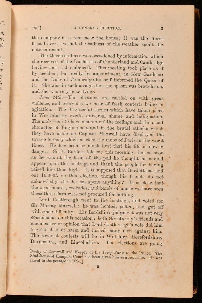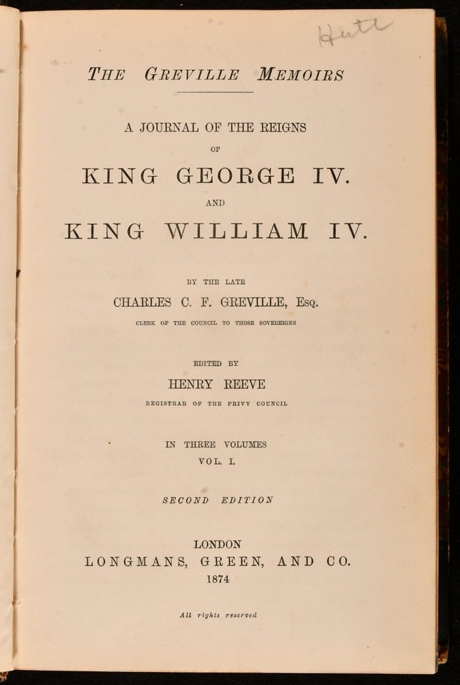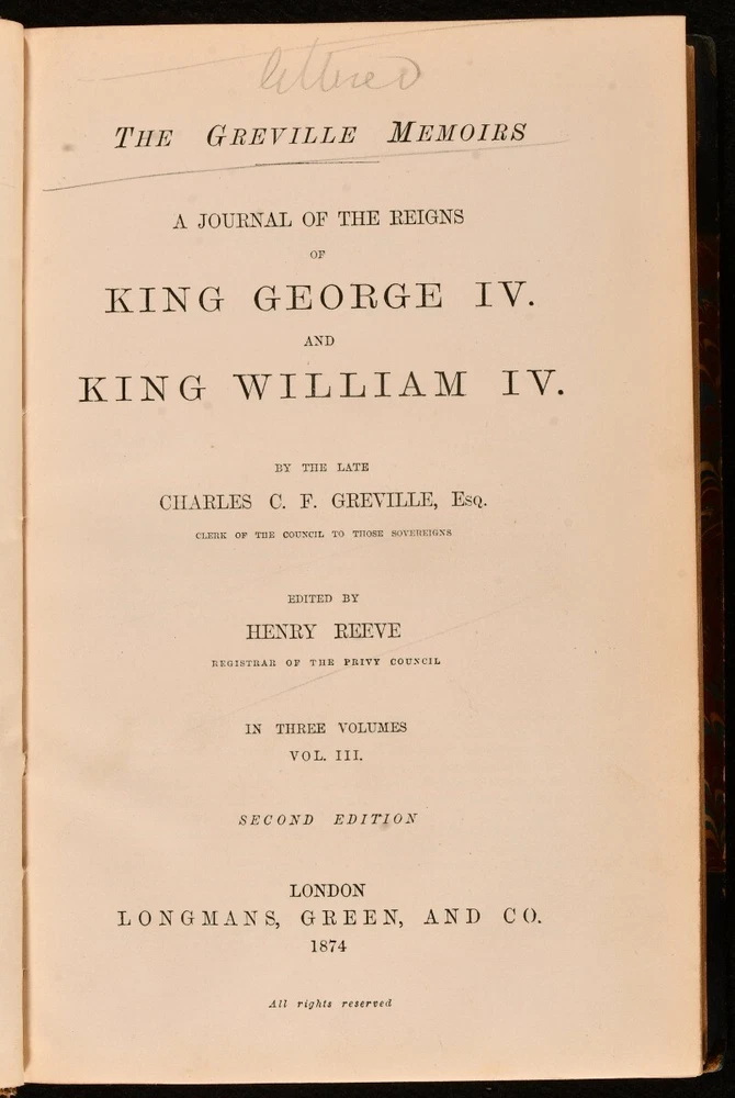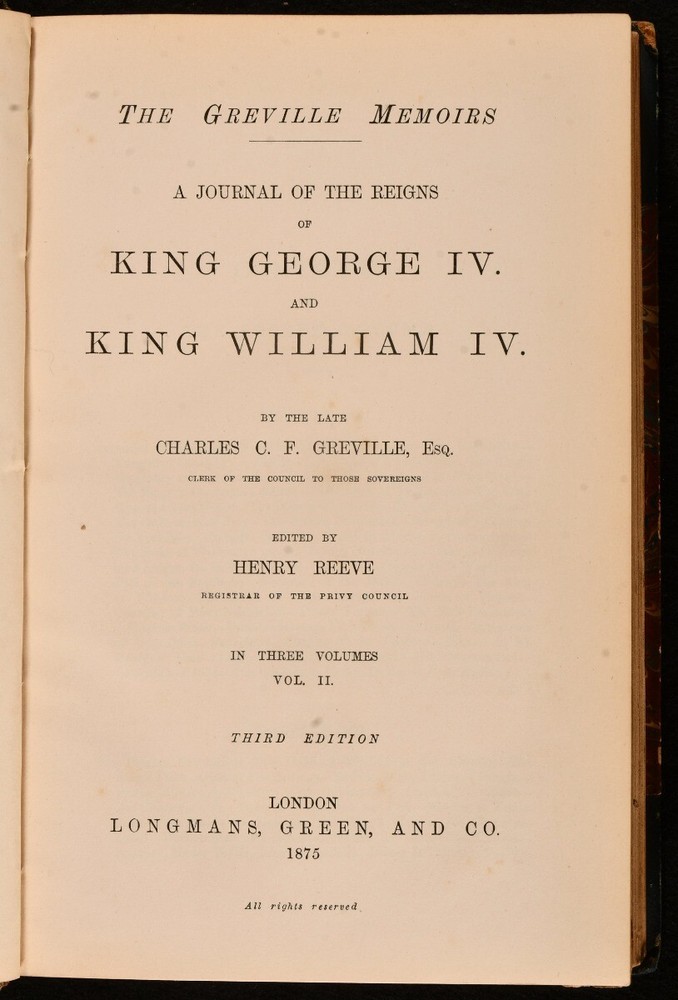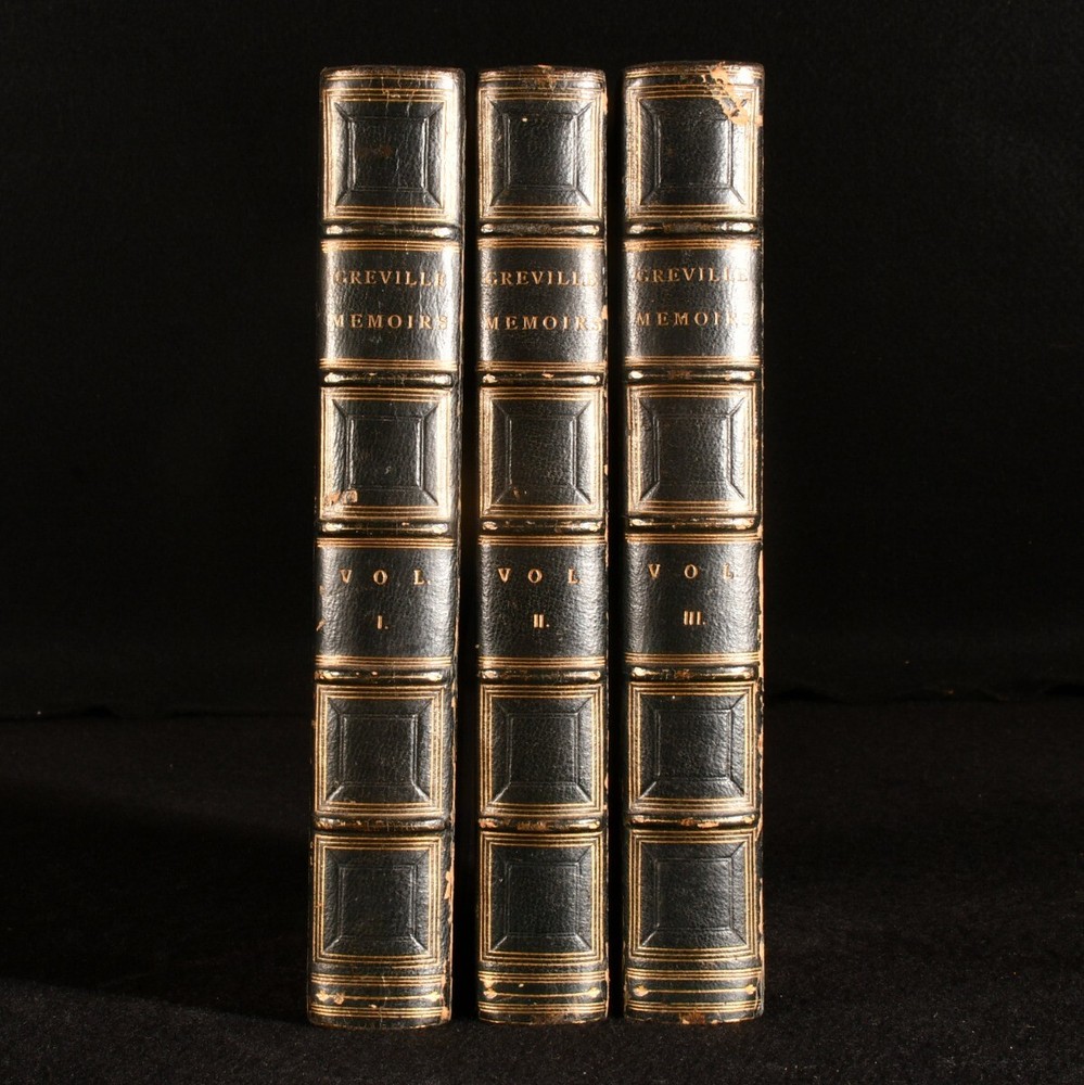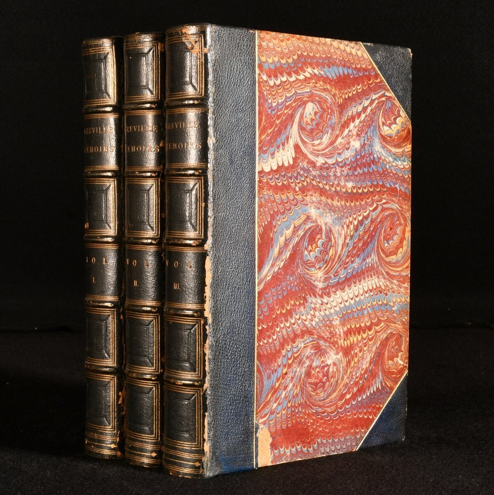 Click here to see our other books! The Greville Memoirs A Journal of the Reigns of King George IV and King William IV Charles C. F. Greville; Henry Reeve 1874-1875 Longmans, Green and Co. : London 8.5" by 6" xvii, 424; ix, 384; x, 432pp SUMMARY A leather bound complete three volume set of The Greville Memoirs. Leather Binding Overall Condition: Very Good This book weighs 3 KG when packed UK Postage: £ 3.99 US Postage: £ 36.99 EU Postage : £ 25.99 European Postage: £ 27.99 Asia Postage: £ 47.99 Worldwide Postage: £ 69.99 DESCRIPTION Complete in three volumes, the first and third volumes being second edition published in 1874 and the second volume being a copy of the third edition published in 1875. The Greville Memoirs is A Journal of the Reigns of King George IV and King William IV by the late Charles C. F. Greville and edited by Henry Reeve. Three fascinating volumes exploring the reigns of King George IV and King William IV. George IV was King of the United Kingdom until 1830 when King William IV took over until 1837 becoming the last king and penultimate monarch of Britain's House of Hanover. CONDITION In half morocco with marbled covered boards. Externally, very smart with some light rubbing to the spines, more to vol iii. Pencil owner inscription to the title page of vol, i and iii. Internally, firmly bound with bright and clean pages. Overall Condition: Very Good GLOSSARY OF TERMS Overall Condition (Dustwrapper condition rating is shown after that for the book itself, where a dustwrapper is present) Fine - Very well preserved copy showing very little wear Very Good Indeed - Only one or two minor faults, really a very attractive copy Very Good - Quite a wide term meaning no major faults but probably several smaller ones often expected given the age of the book, but still a respectable copy Good - Meaning not very good. Some more serious faults as will be described in the condition report under 'condition' Good Only - Meaning one or more faults that could really do with repair Fair - As with good only above but with other faults leaving a compromised copy even after repair Poor - Really bad and possibly seriously incomplete. We only sell books in this condition where their rarity or value makes them attractive none the less. Major defects will be described. GUARANTEE We offer a full money back guarantee on our descriptions. Please ask for details and conditions. We prefer PAYPAL. If you pay via PAYPAL we will post the item off the same or the next working day with the postage you have selected. Please note we cannot accept USD cheques