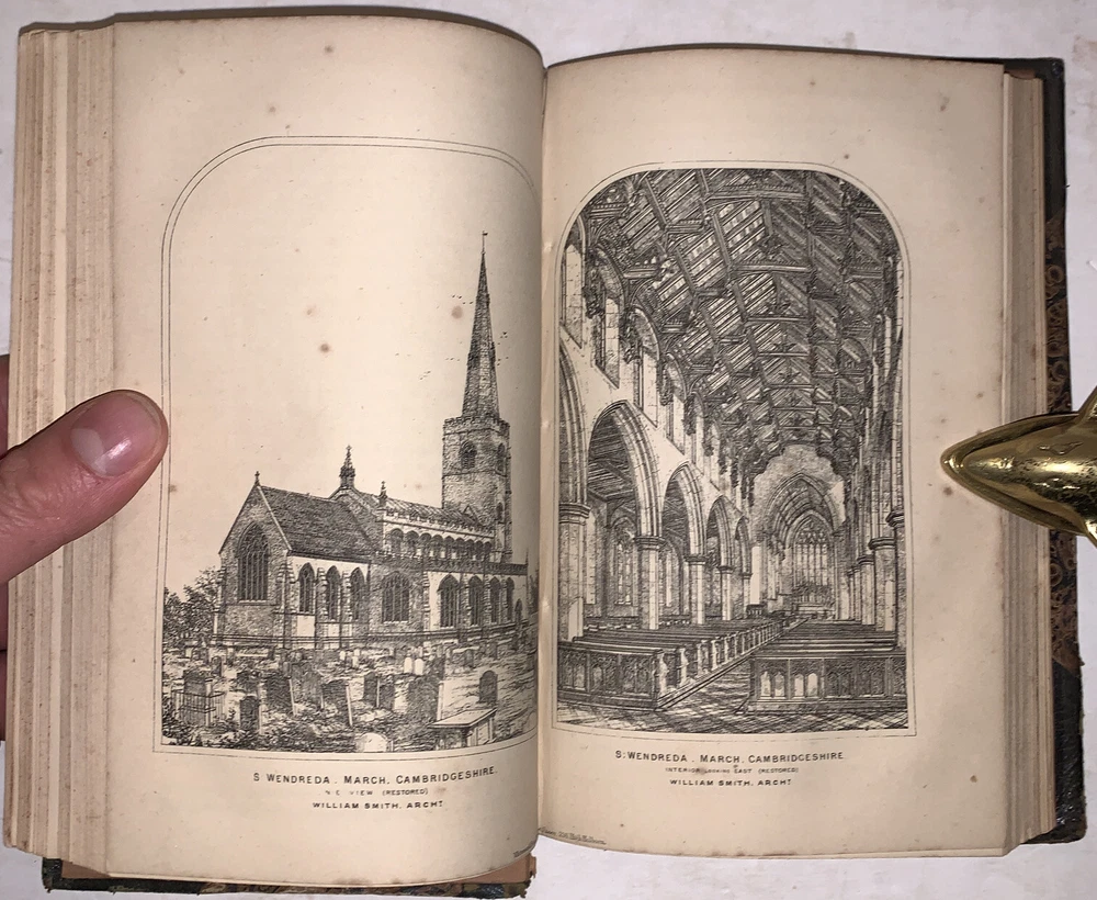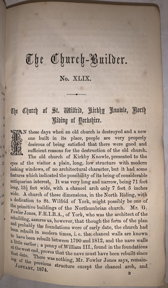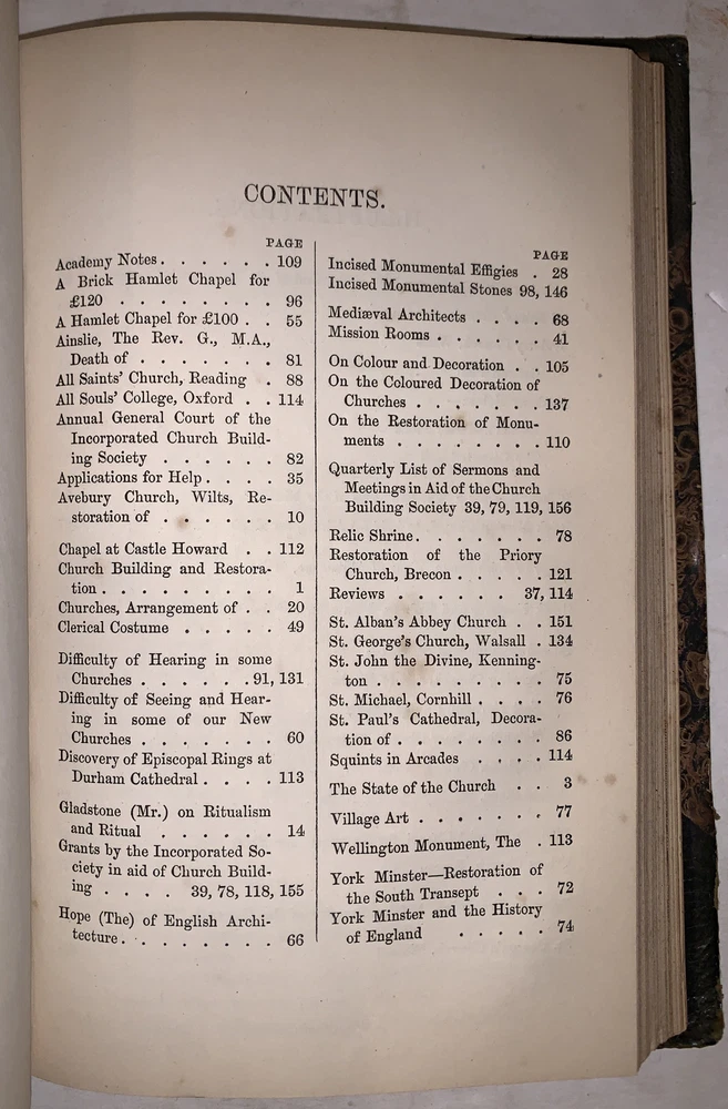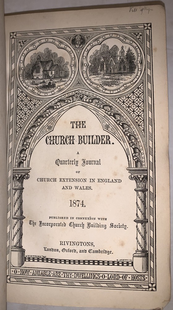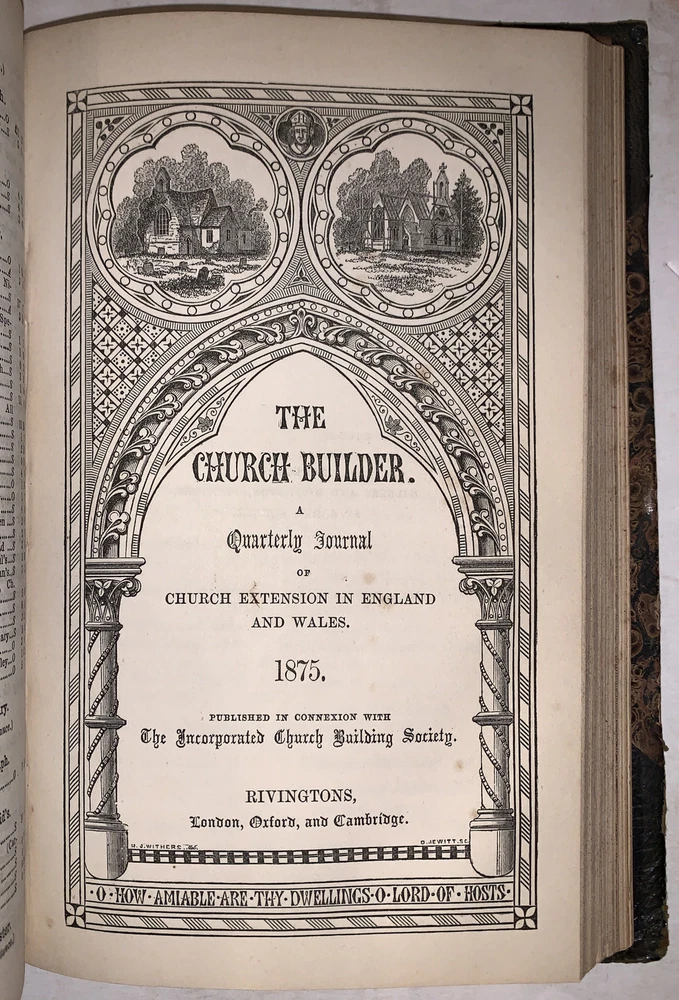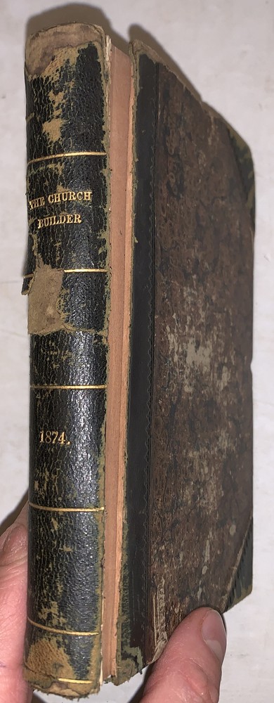 The Church Builder A Quarterly Journal of Church Extension in England and Wales. 1874 & 1875 Bound in one volume Published in Connection with The Incorporated Church Building Society London, Oxford, and Cambridge First Edition Contains issues: XLIX through LVI 12mo, 154, 156 pages, period three quarter leather over marbled boards. Illustrated throughout in black and white including fold out plate. Top board detached, damage to spine, rubbing and wear. Scuffs, some discoloration and foxing, else in good + condition. If you have any questions feel free to ask and don't forget to check out my other listings.