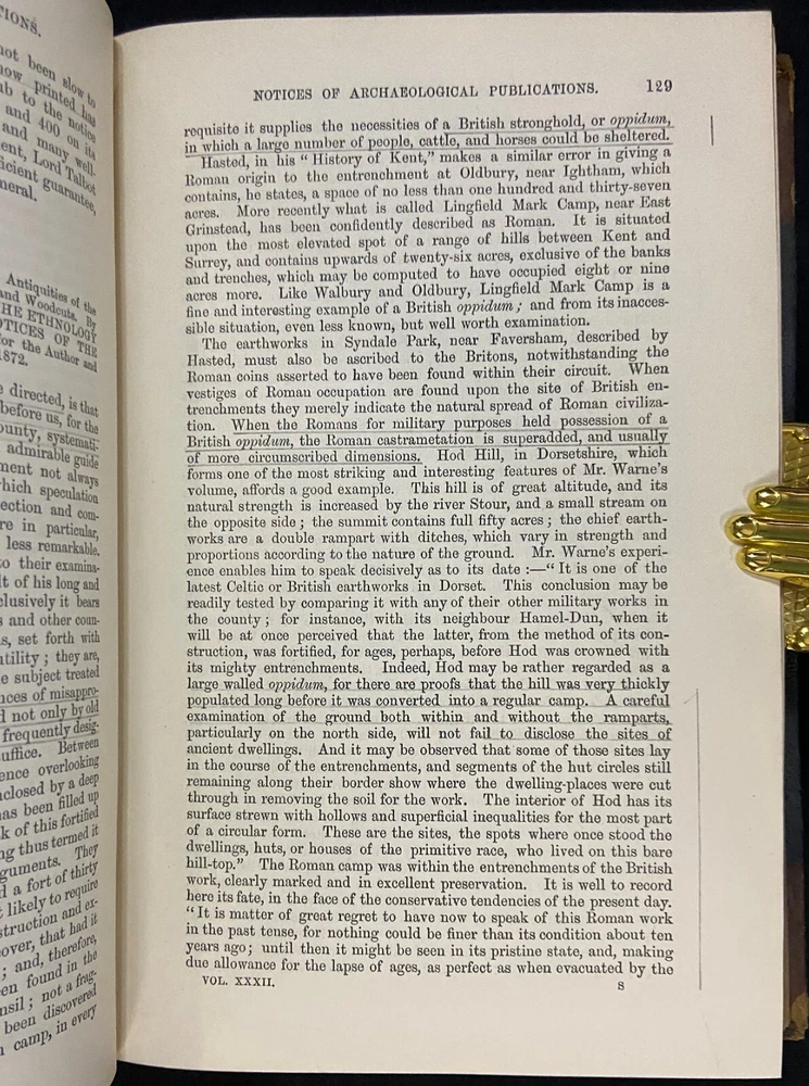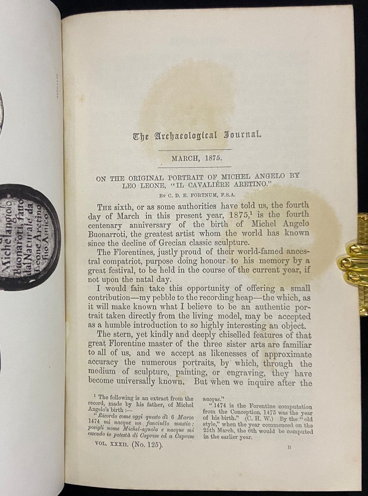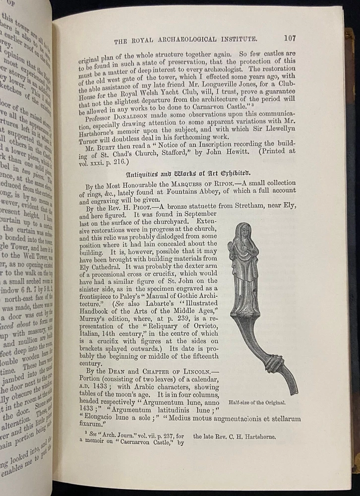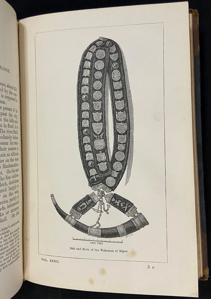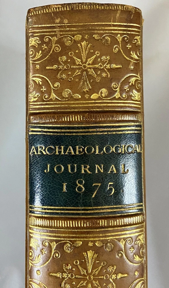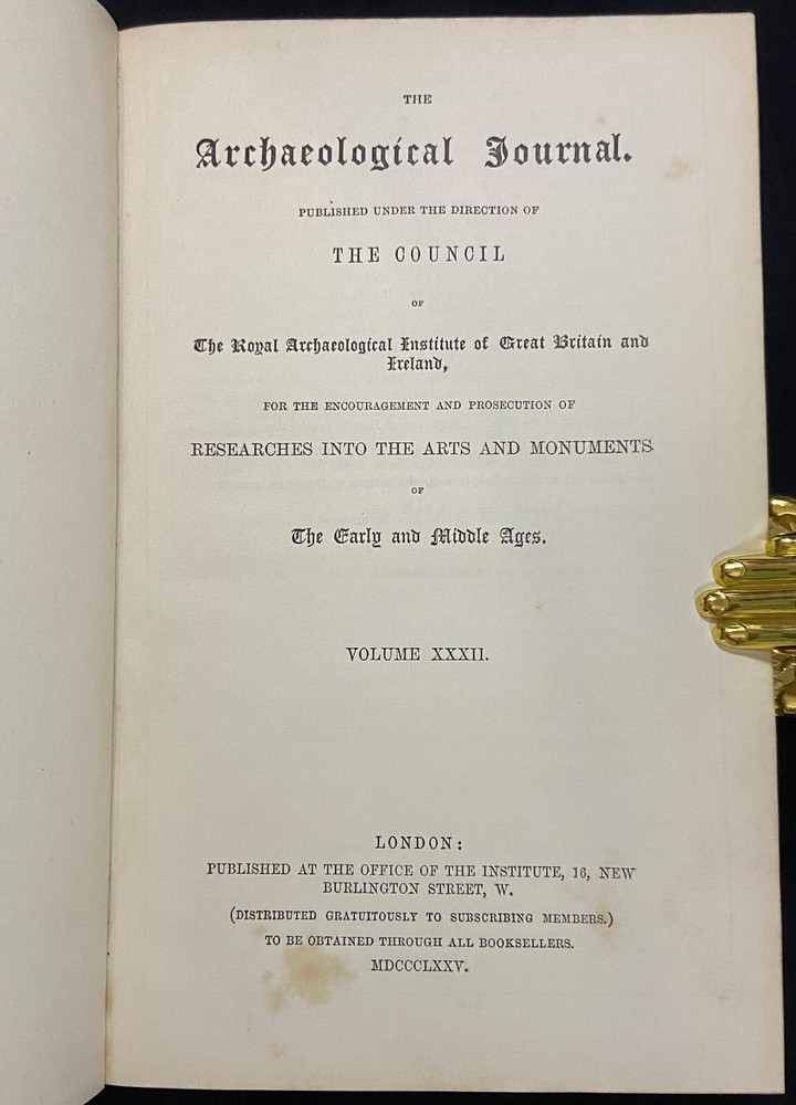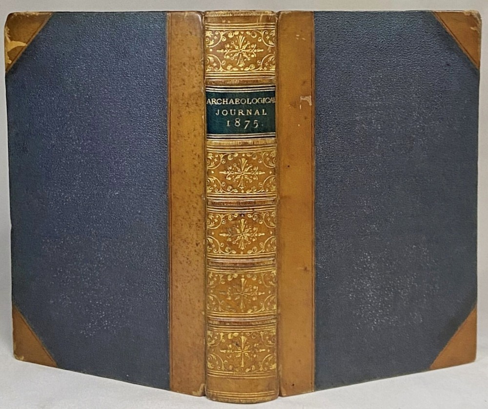 Rare antique 1875 nicely bound volume of "The Archeological Journal published under the direction of the Central Committe of the Archeological Institute of Great Britain and Ireland, for the Encouragement and Prosecution of Researches into the Arts and Monuments of the Early and Middle Ages." The book is overall in very good condition with some minor signs of wear and age. The covers have some mild scuffing and wear. The binding is good and sound. There is a nice old small oval bookplate adhered to the front pastedown. A very few pages have some neatly penciled underlining and bracketing. The interior is lightly toned from age with some scattered light foxing. Along with that there is likely the occasional page with some kind of other minor imperfection such as a minor spot of soiling or grubbiness, tiny chip, small tear, creased page corner, etc. Generally though, it's a nice copy. The book measures approximately 8 7/8 inches by 5 7/8 inches and is 532 pages long with several black and white illustrations. Please look at all of the photos to further note the condition.