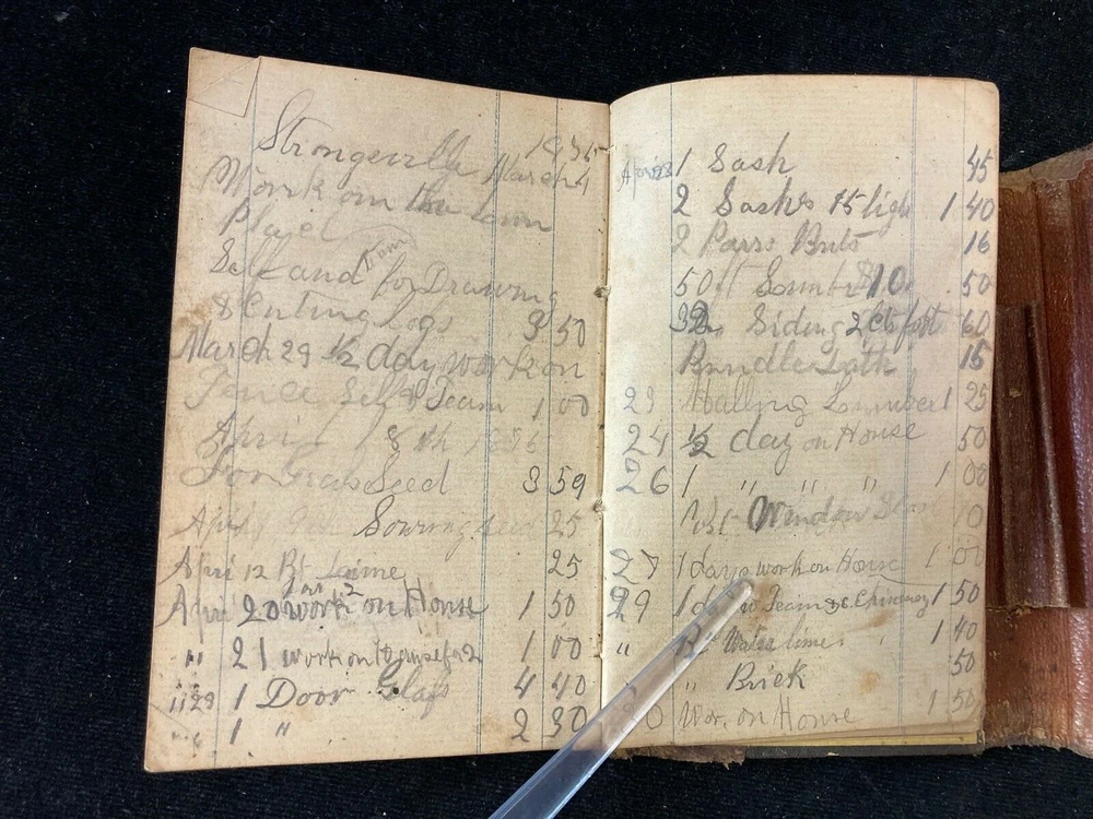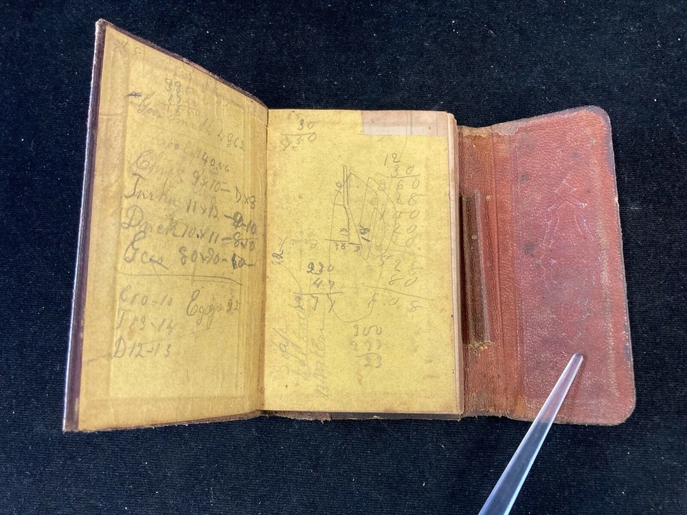 1875-1894 LEATHER PURCHASE ACCOUNTING NOTEBOOK AND DIARY FULL OF ENTRIES. GOOD CONDITION FOR 145 YEARS OLD. ENJOY!!! (CABINET 4, SHELF 2)