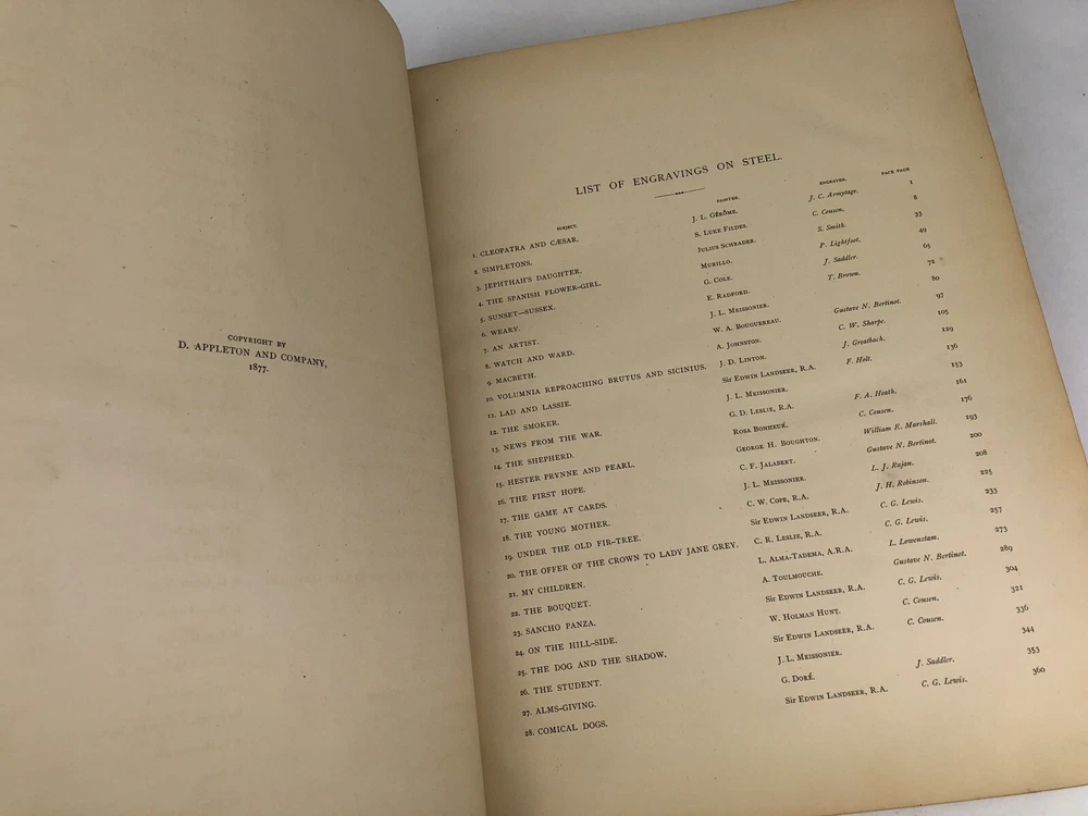 Antique, 1877 Complete, Excellent Condition! THE ART JOURNAL FOR 1877 VOLUME 3 D. Appleton & Co; New York Large, Antique, Original 1877 Volume, with Gilt Design cover and leather spine and corners, amazing illustrations throughout and 36 plates. 28 Steel Engraving Plates & 8 Sculpture Engraving Plates, for a total of 36. 384 pages. Pages have gilded edges. CONDITION: Excellent pre-owned antique condition. Inside is beautiful with a small bit of foxing to some pages. Leather binding has some scuffs and edgewear, and some marks to surface. See photos for details. Please message for any questions, thanks.