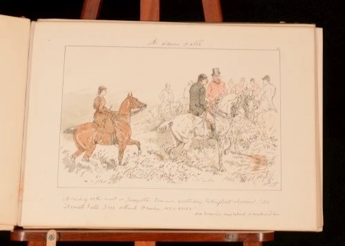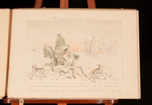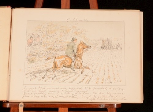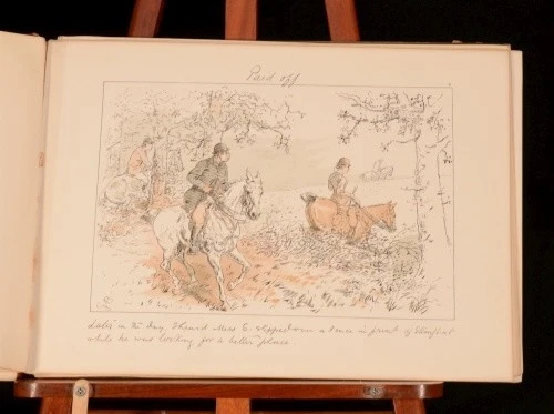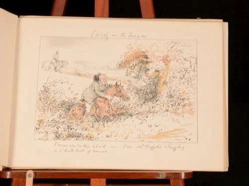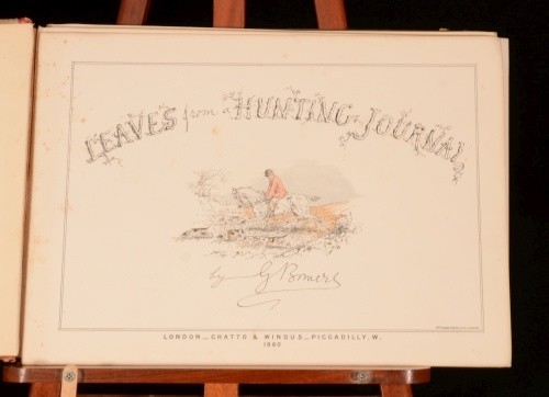 Click here to see our other books! Leaves from a Hunting Journal Georgina Bowers 1880 Chatto and Windus : London 10.5" by 15" xx SUMMARY A first edition of these beautifully drawn and humorous sketches; depicting various hunting scenes. Leather Binding Overall Condition: Good Only This book weighs 1 KG when packed UK Postage: £ 3.99 US Postage: £ 22.99 EU Postage : £ 16.99 European Postage: £ 17.99 Asia Postage: £ 22.99 Worldwide Postage: £ 28.99 DESCRIPTION Collated complete with twenty tinted lithographic plates with lithographed text, interleaved with their original tissue guards. Miss Bowers was a humorist, with very clear and happy notions as to what fun should be, and how it should be transferred to a picture. Her long career began in 1866, and thenceforward, working with undiminished energy, she executed hundreds of initials and vignettes as well as "socials," devoting herself in chief part to hunting and flirting subjects. She states "My 'jokes' all came from incidents I saw out hunting, and from my own varied adventures with horse and hound". With specialist equestrian bookseller; J. A. Allen and Co, bookseller's label to the front pastedown. CONDITION Rebacked in a contemporary quarter crushed morocco binding, with original paper covered pictorial boards. Externally, rubbing to the spine and extremities. Light marks to the boards and with the backstrip slightly lifting to the head of the spine. Internally, binding has failed in places with some leaves detached but, fortunately, present. Bright throughout although with the odd spot, and very light foxing to the last few endpapers. Overall Condition: Good Only GLOSSARY OF TERMS Overall Condition (Dustwrapper condition rating is shown after that for the book itself, where a dustwrapper is present) Fine - Very well preserved copy showing very little wear Very Good Indeed - Only one or two minor faults, really a very attractive copy Very Good - Quite a wide term meaning no major faults but probably several smaller ones often expected given the age of the book, but still a respectable copy Good - Meaning not very good. Some more serious faults as will be described in the condition report under 'condition' Good Only - Meaning one or more faults that could really do with repair Fair - As with good only above but with other faults leaving a compromised copy even after repair Poor - Really bad and possibly seriously incomplete. We only sell books in this condition where their rarity or value makes them attractive none the less. Major defects will be described. GUARANTEE We offer a full money back guarantee on our descriptions. Please ask for details and conditions. We prefer PAYPAL. If you pay via PAYPAL we will post the item off the same or the next working day with the postage you have selected. Please note we cannot accept USD cheques