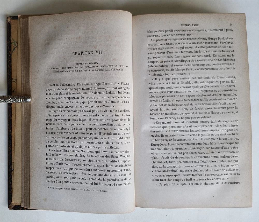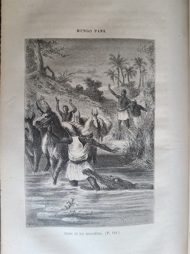 MUNGO PARK SA VIE ET SES VOYAGES by H. FEUILLERET (MUNGO PARK HIS THE LIFE AND TRAVELS) Tours; 1880 Size 6 by 9.5" Half leather over marbled boards Spine with raised boards and gilt title xi, [1], 228 pp Illustrated with frontis and one plate Good condition, some foxing, minor wear of binding Text in French ============== Mungo Park (1771-1806) was the first European to reach the well-nigh fabulous waters of the Niger. He followed the river almost to the Senegal valley. He finally reached Gambia after a lengthy return journey. His journal included a detailed description of travel conditions, the nature of the area, rivers, and customs of various tribes. 'Park's Travels had an immediate success and was translated into most European languages. It has become a classic of travel literature, and its scientific observations on the botany and meteorology of the region, and on the social and domestic life of the negroes, have remained of lasting value. Park's career was short, but he made the first great practical advance in the opening-up of Central Africa' (PMM 253). Written in a straightforward unpretentious, narrative style, it gave readers their first realistic description of everyday life in west Africa, depicting without the censorious, patronizing contempt which so often has disfigured European accounts of Africa. =========================== Please see my other auctions Thank You Refund Policy: We will issue a FULL REFUND, 100% money back if you are not satisfied with your purchase. Items must be returned to us within 20 days in order to receive a refund or replacement. Buyer is responsible for shipping costs. Powered by SixBit's eCommerce Solution