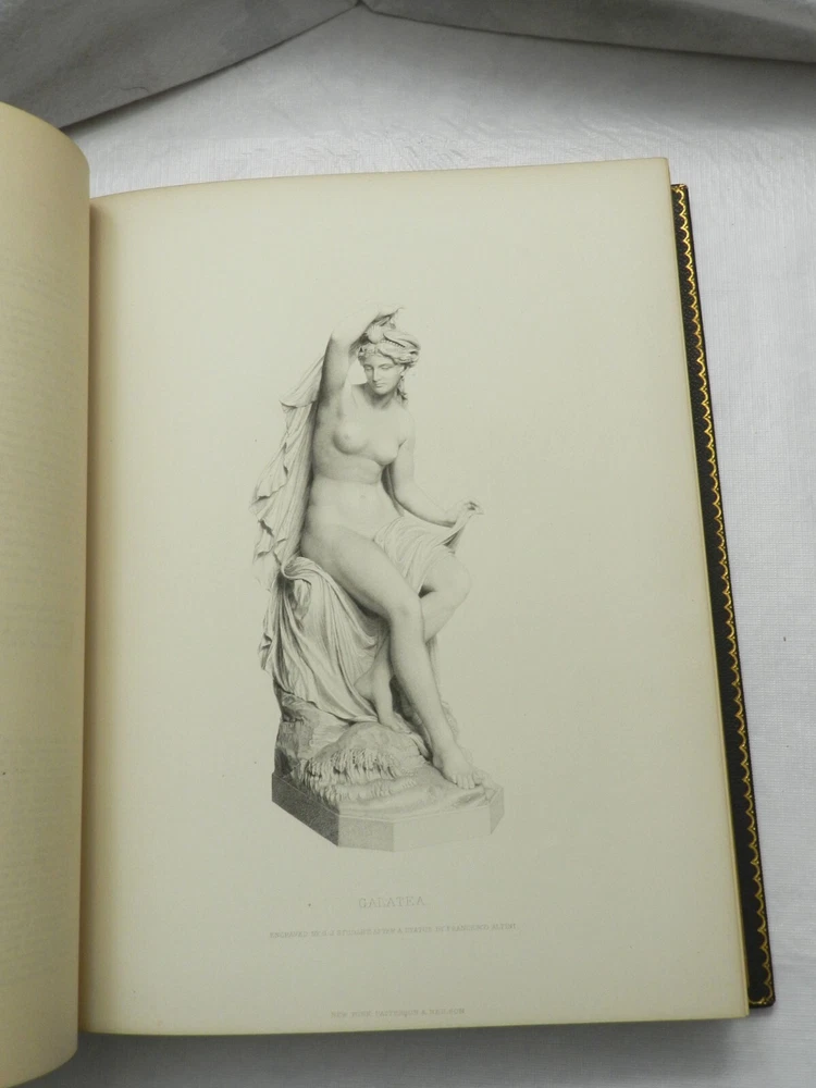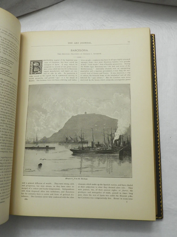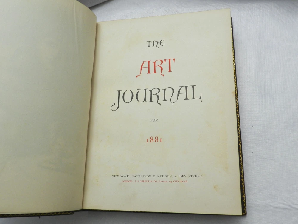 From Wikipedia on the Art Journal, which began as a journal based in London only: "The Art Journal was the most important British 19th-century magazine on art. It was founded in 1839 by Hodgson & Graves, print publishers, 6 Pall Mall, with the title Art Union Monthly Journal (or The Art Union), the first issue of 750 copies appearing 15 February 1839. It was published in London but its readership was global in reach..." From an archive on The Art Journal: "D. Appleton and Co. began The Art Journal in 1875 as an American edition of the older London-based Art Journal. It included original content as well as content from the London journal. The journal was taken over by Patterson and Neilson around 1881, and ceased publication in 1887." I HAVE FOUR VOLUMES OF THE AMERICAN ART JOURNAL FROM 1881 TO 1884. All are described similarly: They are fully restored in their original FULL LEATHER GLORY!! The leather is dark brown towards black. Blind-stamped borders on front and rear boards, UNRUBBED GILT TITLES AND DECORATION on front board and spine. Five raised bands on the spine. Gilt lined board edges, and gilt decoration on the leather borders behind the front and rear boards. Light edge and corner wear on the boards. TREATED LEATHER results in a supple look and feel. Moire endpapers, gilt page edges on the three edges. Moire endpapers, THICK PAPER PLATES THROUGHOUT. I have provided the List of Illustraitons page for each of the volumes. The books have 350-400 pages. They measure about 13" by 10" and weigh 8 lbs 14 oz. THIS LISTING IS FOR THE 1881 VOLUME. It is the only one of the 4 volumes which has a color chromolithograph. Cliff's Books B140