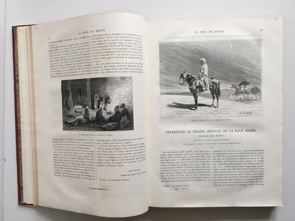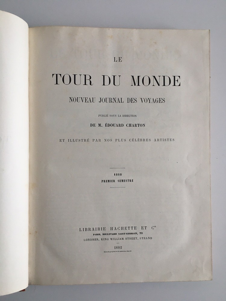Le Tour du Monde, new journal of travel, published under the direction of Mr. Edouard Charton and, illustrated by our most famous artists. First half of 1882. 43rd volume, at Hachette. False title and title, 434 pp. with table. Figures and full page, maps and plans. Red leather back binding ornate, 30.5 x 22 cm. In good condition: minor friction to support; Always lively corners; smooth slice; Solid and clear together. Le Tour du Monde, new journal of travel, published under the direction of Mr. Edouard Charton and, illustrated by our most famous artists. First half of 1882. Â 43rd volume, at Hachette. False title and title, 434 pp. with table. Figures and full page, maps and plans. Red leather back binding ornate, 30.5 x 22 cm. In good condition: minor friction to support; Always lively corners; smooth slice; Solid and clear together.