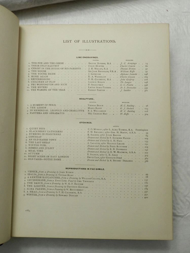 From Wikipedia on the Art Journal, which began as a journal based in London only: "The Art Journal was the most important British 19th-century magazine on art. It was founded in 1839 by Hodgson & Graves, print publishers, 6 Pall Mall, with the title Art Union Monthly Journal (or The Art Union), the first issue of 750 copies appearing 15 February 1839. It was published in London but its readership was global in reach..." From an archive on The Art Journal: "D. Appleton and Co. began The Art Journal in 1875 as an American edition of the older London-based Art Journal. It included original content as well as content from the London journal. The journal was taken over by Patterson and Neilson around 1881, and ceased publication in 1887." I HAVE FOUR VOLUMES OF THE AMERICAN ART JOURNAL FROM 1881 TO 1884. All are described similarly: They are fully restored in their original FULL LEATHER GLORY!! The leather is dark brown towards black. Blind-stamped borders on front and rear boards, UNRUBBED GILT TITLES AND DECORATION on front board and spine. Five raised bands on the spine. Gilt lined board edges, and gilt decoration on the leather borders behind the front and rear boards. Light edge and corner wear on the boards. TREATED LEATHER results in a supple look and feel. Moire endpapers, gilt page edges on the three edges. Moire endpapers, THICK PAPER PLATES THROUGHOUT. I have provided the List of Illustraitons page for each of the volumes. Each volume has 350-400 pages. They measure 13" by 10" and weigh 8 lbs 14 oz. THIS LISTING IS FOR THE 1883 VOLUME. Cliff's Books B140