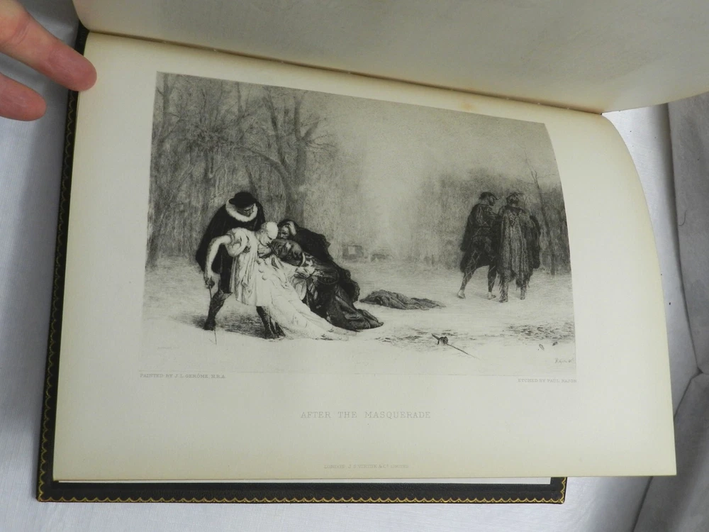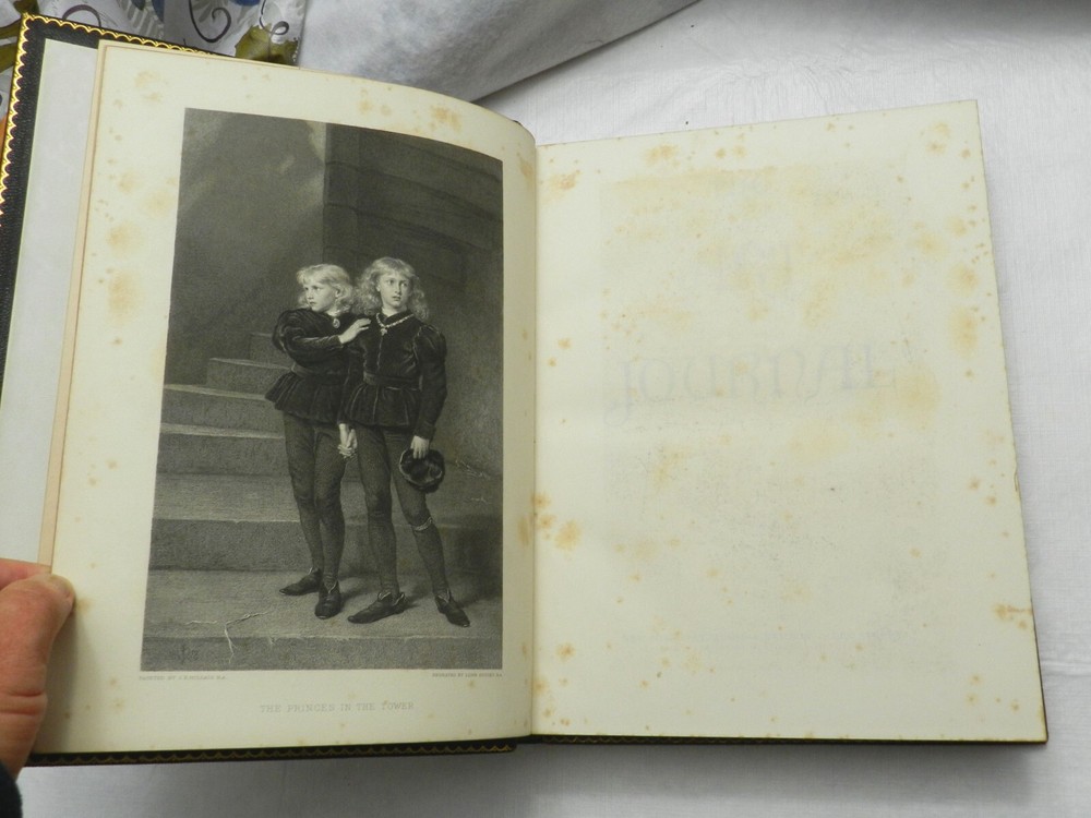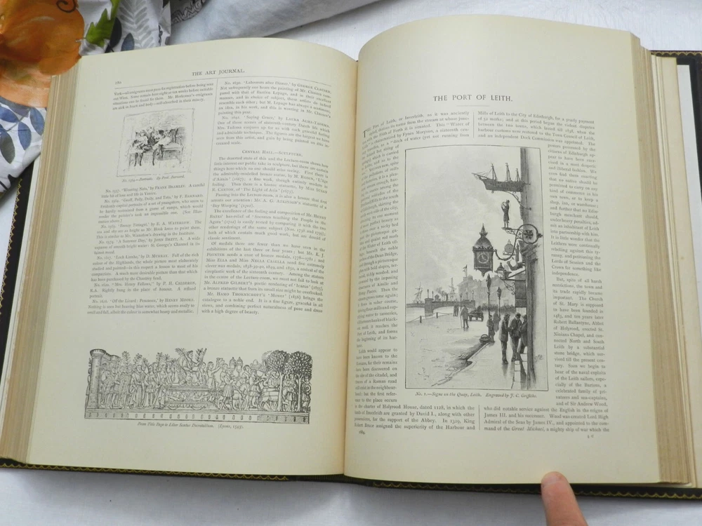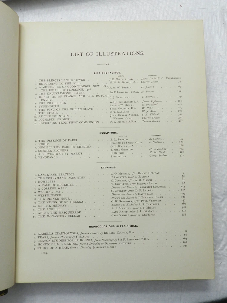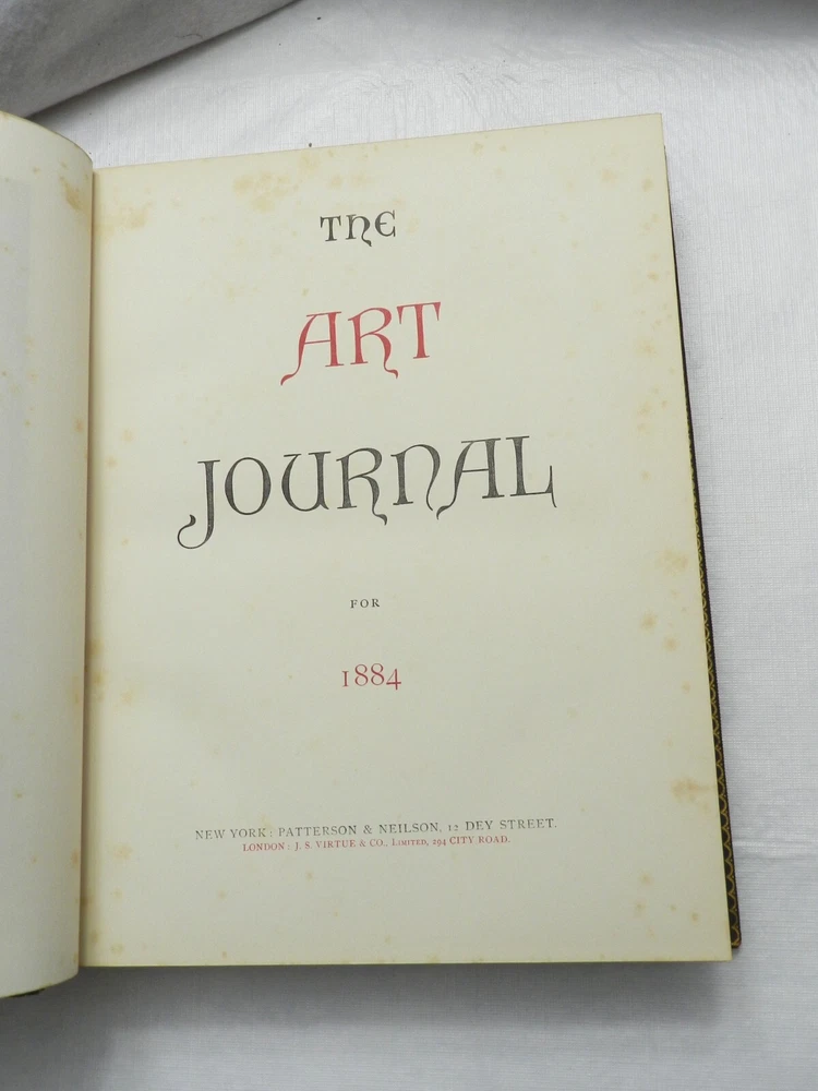 From Wikipedia on the Art Journal, which began as a journal based in London only: "The Art Journal was the most important British 19th-century magazine on art. It was founded in 1839 by Hodgson & Graves, print publishers, 6 Pall Mall, with the title Art Union Monthly Journal (or The Art Union), the first issue of 750 copies appearing 15 February 1839. It was published in London but its readership was global in reach..." From an archive on The Art Journal: "D. Appleton and Co. began The Art Journal in 1875 as an American edition of the older London-based Art Journal. It included original content as well as content from the London journal. The journal was taken over by Patterson and Neilson around 1881, and ceased publication in 1887." I HAVE FOUR VOLUMES OF THE AMERICAN ART JOURNAL FROM 1881 TO 1884. All are described similarly: They are fully restored in their original FULL LEATHER GLORY!! The leather is dark brown towards black. Blind-stamped borders on front and rear boards, UNRUBBED GILT TITLES AND DECORATION on front board and spine. Five raised bands on the spine. Gilt lined board edges, and gilt decoration on the leather borders behind the front and rear boards. Light edge and corner wear on the boards. TREATED LEATHER results in a supple look and feel. Moire endpapers, gilt page edges on the three edges. Moire endpapers, THICK PAPER PLATES THROUGHOUT. I have provided the List of Illustraitons page for each of the volumes. Each volume was 350-400 pages. They measure 13" by 10" and weigh 8 lbs 14 oz. THIS LISTING IS FOR THE 1884 VOLUME. It is the only one of the 4 volumes which has a color chromolithograph. Cliff's Books B140