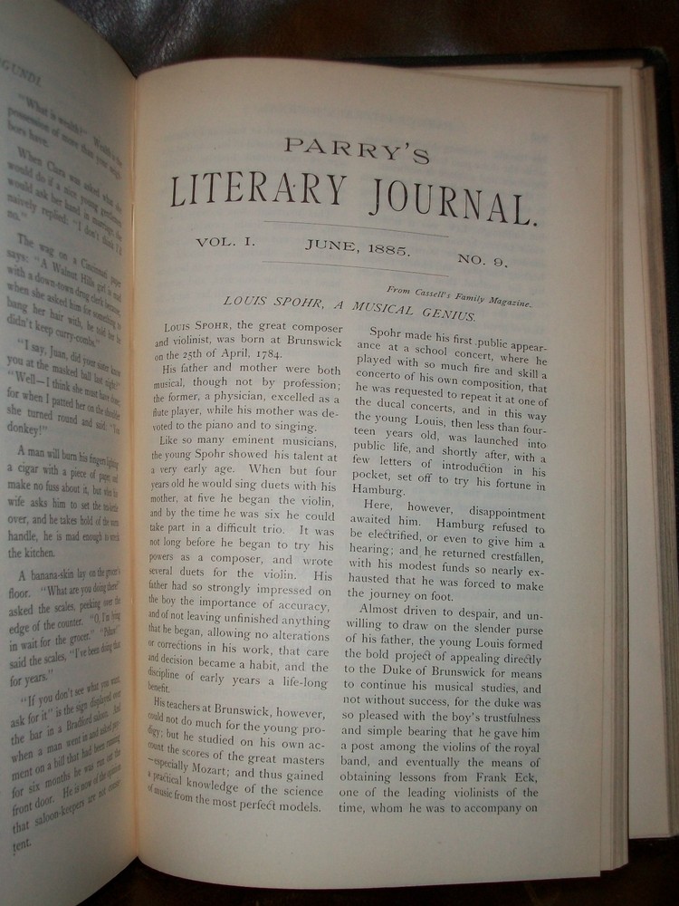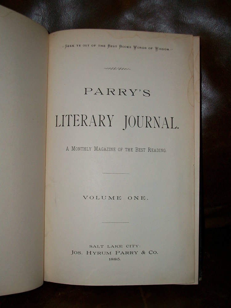 PARRY'S LITERARY JOURNAL A Monthly magazine of the Best Reading Volume One Salt Lake City, Utah Jos. Hyrum Parry & CO. 1885 This book contains every issue of the book from October 1884 to September 1885. It measures about 6 1/4" x 9 3/4" and is aobut 383 pages. Condition: Used, Good The hardback cover has a leather spine and corners. The corners have bumping and wear to the leather. The spine has quite a bit of rubbing and wear. The boards are in very good condition. The interior of the book is breaking loose from the cover but the binding is in very good condition. It has a stamp on the back cover from the LDS Hospital. The title page and the contents page have very minimal and light moisture stains on the very outer page of the top edge (about 1/4"). There is no noticed writing, tears, or creases. SEE MY STORE FOR MORE GREAT ITEMS Please read description carefully and look closely at all pictures. If you have questions or concerns ALWAYS send messages through Ebay messaging and NOT my email address. I am happy to entertain offers but NEVER include shipping in your offer price. Shipping cost is always as stated in item listing. Shipping and Handling Shipping is figured by exact USPS shipping cost, delivery confirmation cost, and $2.00 packaging and handling fee. * I do offer combined shipping based on the weight of the books. To receive the shipping discount items MUST be paid for together. This is an Ebay rule, not mine . To do this, please place items in your Ebay cart and then you will be invoiced for all items together * If item is extremely large or needs special attention the packaging and handling fee might be more, this is very rare!