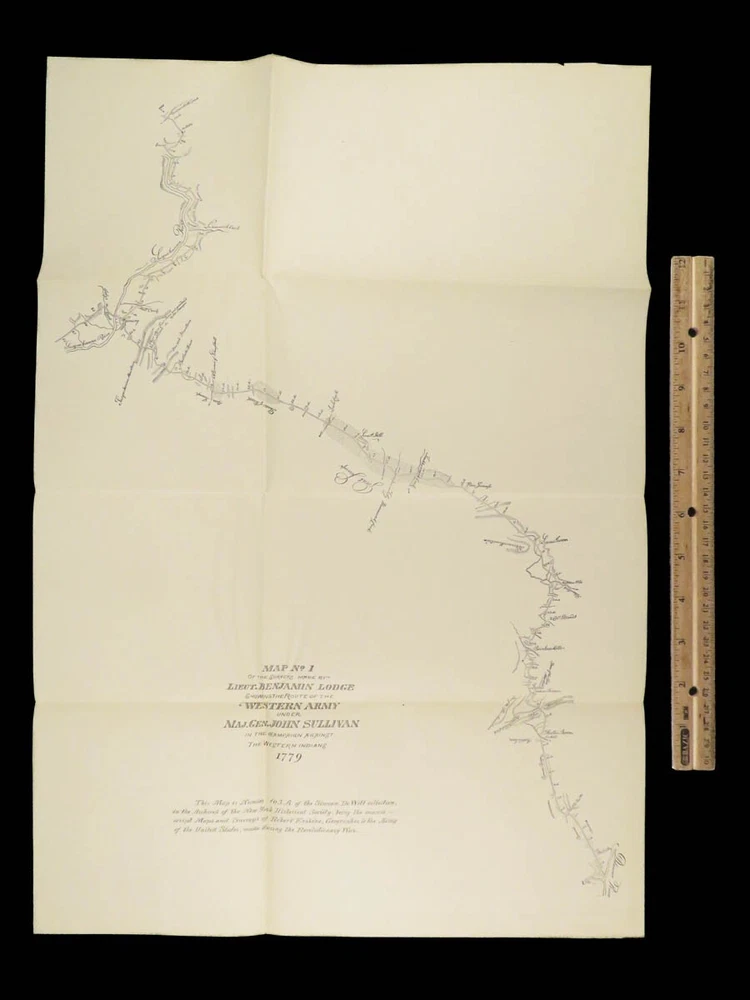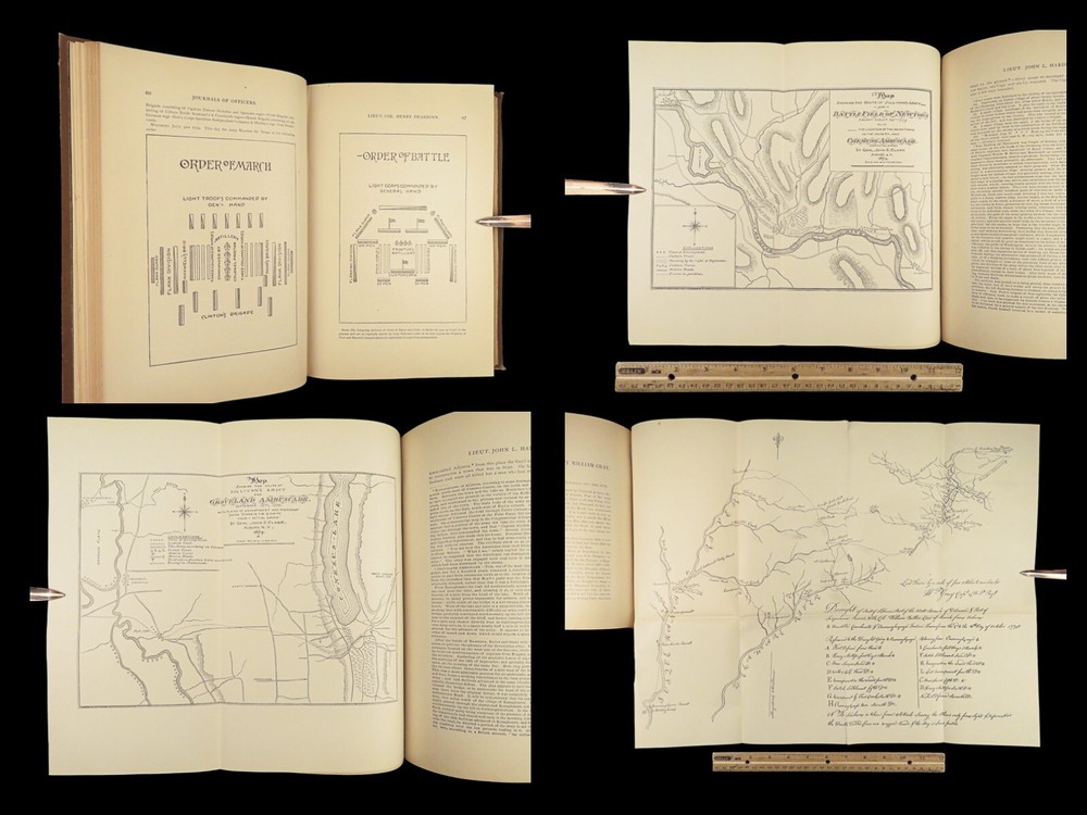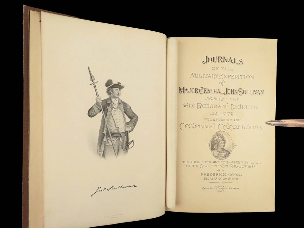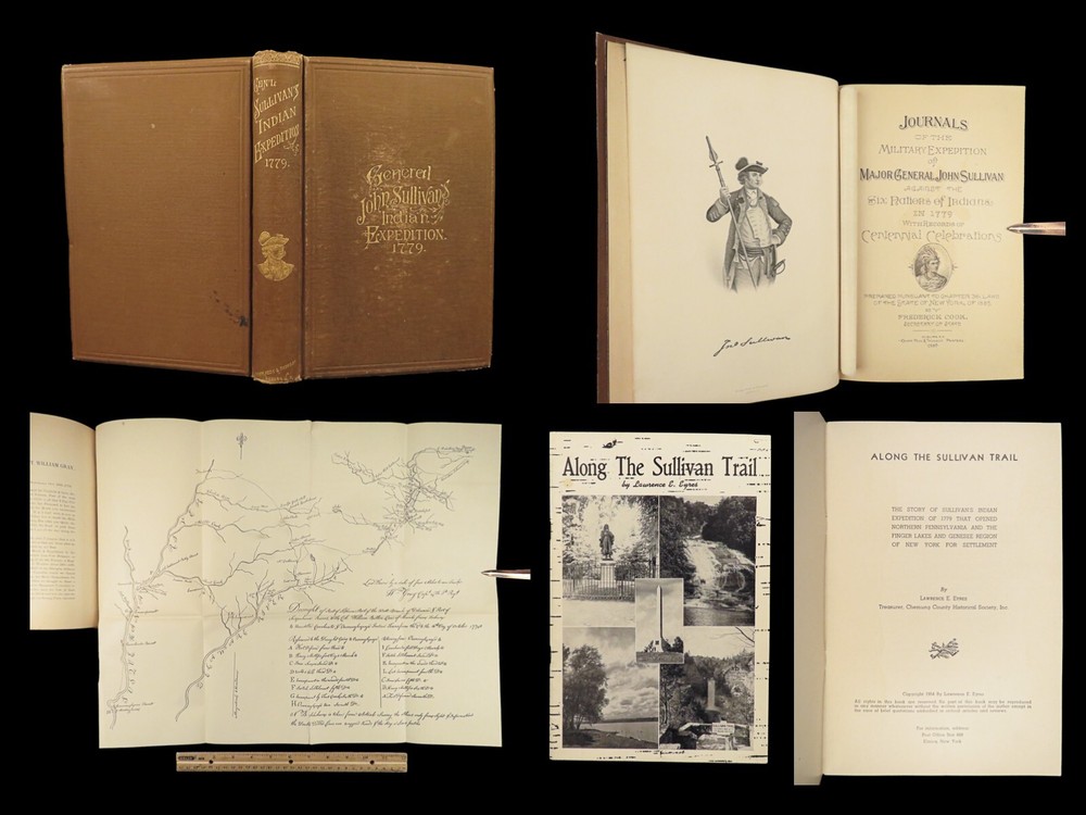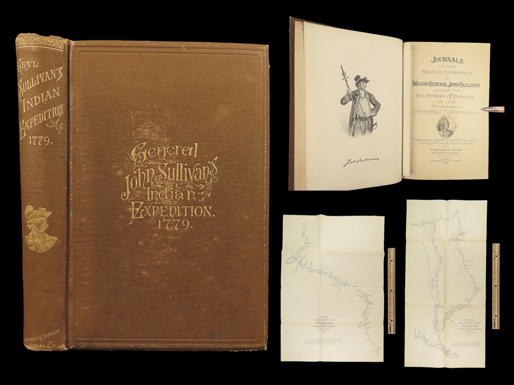 1887 American Revolution 1 ed Sullivan Expedition Journals Iroquois INDIAN War In 1779, General George Washington ordered a military campaigned against the Indian nations of Haudenosaunee – native tribes that had sided with the British in the American Revolution. This campaign was led by General John Sullivan who carried out a scorched earn regime that destroyed dozens of Iroquois villages in New York. The devastation was one of the most notable contributors to Native American hardships following the Revolutionary War. The events of this campaign were written by Frederick Cook, who published a thorough account of the expedition. This first edition features folding maps, including those in the inner-cover pockets. Item number: #24638 Price: $499 COOK, Frederick Albert Journals of the Military Expedition of Major General John Sullivan against the Six Nations of Indians in 1779 Auburn, NY: Knapp, 1887. First edition. Details : · Collation: Complete with all pages o [2], xv, [1], 579, [3] o Illustrated throughout o 4 steel-engraved portraits o 5 folding maps in front and rear board pockets o 6 folding and in-text illustrations · Language: English · Binding: Hardcover; tight and secure · Brown cloth · Size : ~10.25in X 7.25in (26cm x 18cm) Our Guarantee: Very Fast. Very Safe. Free Shipping Worldwide. Customer satisfaction is our priority! Notify us with 7 days of receiving, and we will offer a full refund without reservation! 24638