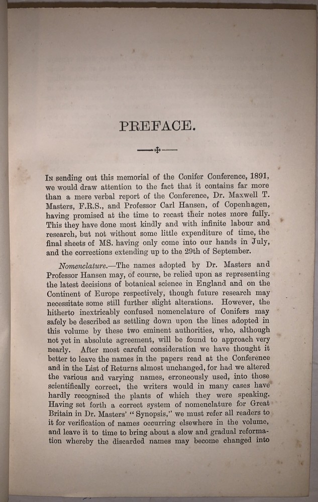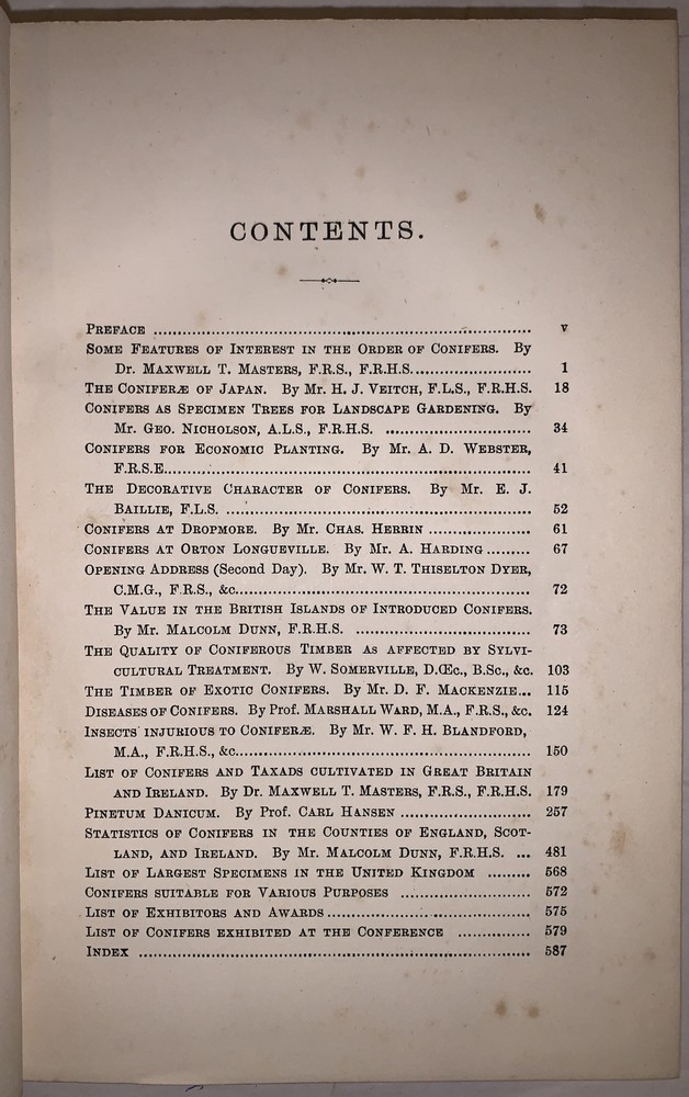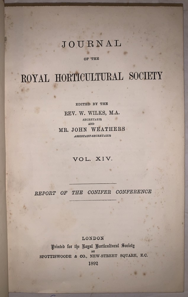 Journal of the Royal Horticultural Society Report of the Conifer Conference Volume XIV Edited by Rev. W. Wilks, M.A. and Mr. John Weathers London Printed for the Royal Horticultural Society 1892 First Edition Octavo, vi, 588 Pages, publishers original black leather over red cloth covered boards lettered in gilt on spine. Some slight rubbing and wear, damage to top of spine, water damage to the exterior of both boards (looks like someone used this book as a drink coaster), minimal light scattered foxing, else in good + condition. If you have any questions feel free to ask and don't forget to check out my other listings.