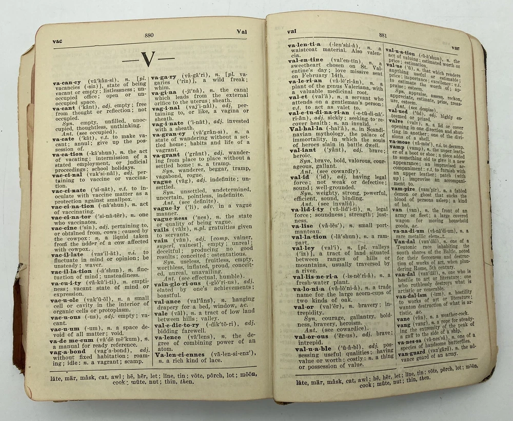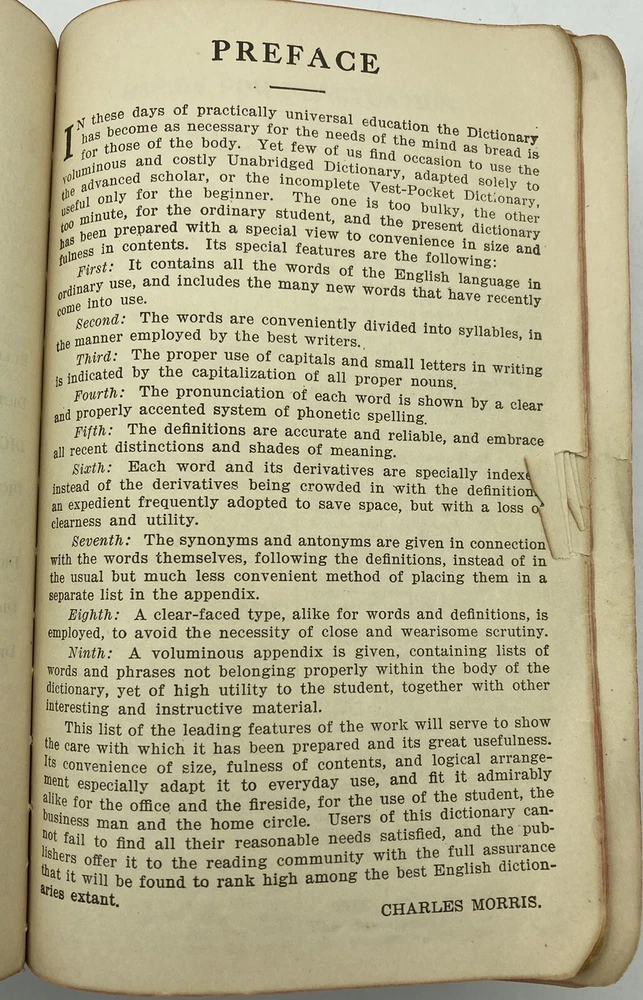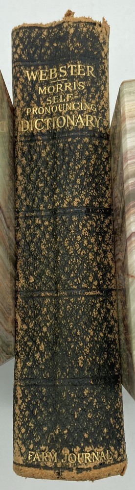 1911 Webster Morris Farm Journal Dictionary Leatherbound Self-Pronouncing. See pictures for condition. The leather is supple and the book feels nice in the hand. There are a few pages missing, but most are intact. Very nice 112 year old dictionary.