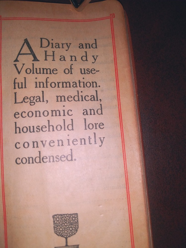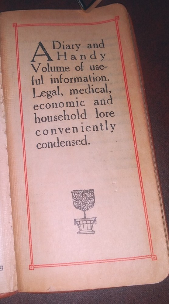 This antique diary, published in 1914, is a unique and valuable piece of history that any collector or enthusiast would be proud to own. With its leather binding and well-preserved pages, this diary is a testament to the quality of craftsmanship and attention to detail of its era. Made for H.G. Behneman , Mfrs Agent, Electrical Specialties, Seattle, the diary contains a wealth of information that is both interesting and informative. This little book boasts a handy volume of useful information that covers a variety of topics including legal, medical, economic and household lore conveniently condensed. The diary is a must-have for anyone interested in diaries and correspondence from the early 20th century. This book is sold "As-Is" (See pics)