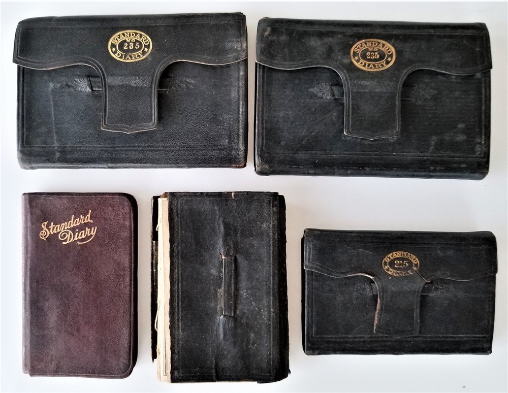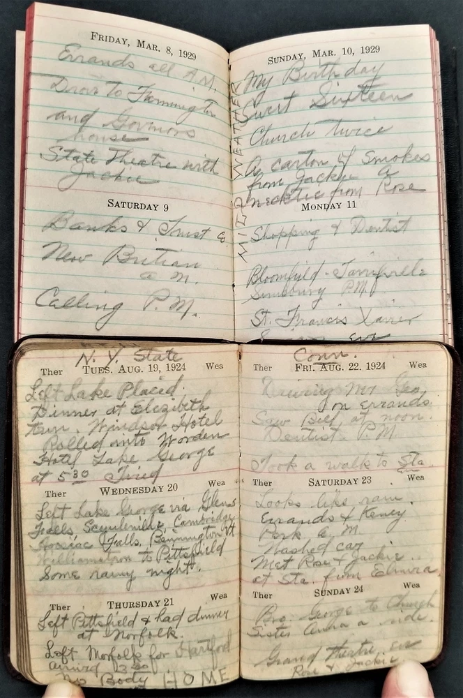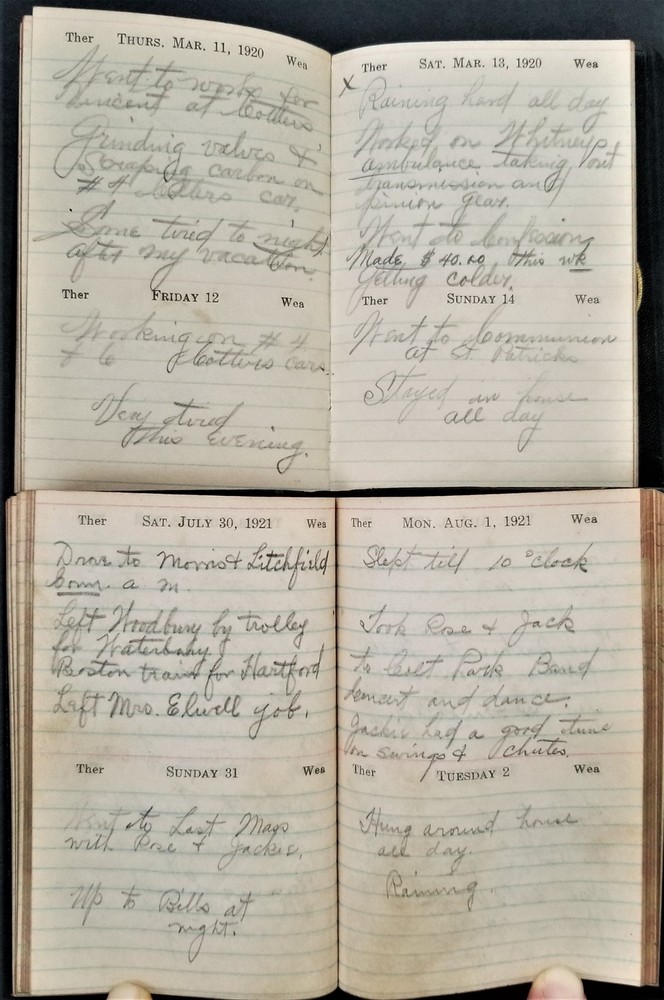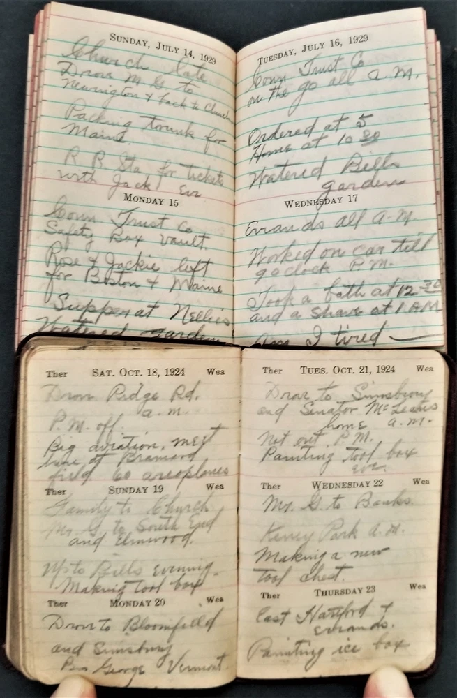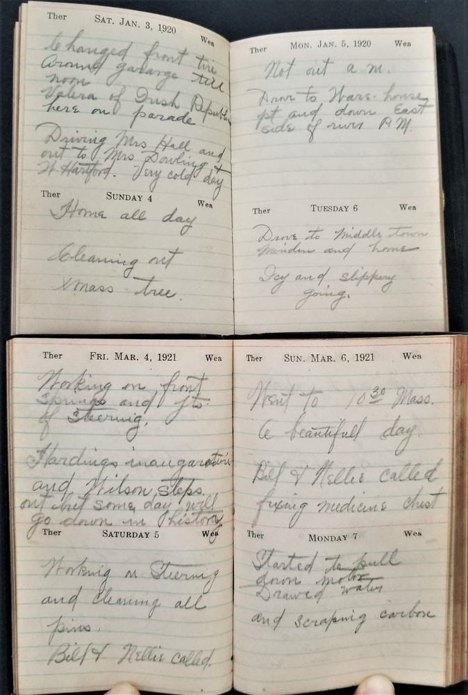 1920s LOT antique DIARY hartford ct GEORGE P MEADE 5pc diaries SCROLL DOWN for MORE PHOTOS in DESCRIPTION Click HERE to view or search ANTIQUE.COTTAGE listings. This listing is for the lot of diaries shown. Looks like most of the dates are filled out. You get the following years: 1920 pretty good cover. 1921 pretty good cover 1924 shiny gold page edges 1925 (cover separated into 3 pieces) 1929 - cover is pretty good with a little tear Name: George P Meade [Geroge P Weade] Birth Year: abt 1885 Gender: Male Race: White Birthplace: New York Marital Status: Married Relation to Head of House: Head Home in 1930: Hartford, Hartford, Connecticut, USA Map of Home: View Map Street address: Albany Avenue Ward of City: 5 Part of Block: 27 House Number: 62 Dwelling Number: 80 Family Number: 172 Home Owned or Rented: Rented Home Value: 25 Radio Set: Yes Lives on Farm: No Age at First Marriage: 30 Attended School: No Able to Read and Write: Yes Father's Birthplace: New York Mother's Birthplace: New York Able to Speak English: Yes Occupation: Chauffeur Industry: Private family Class of Worker: Wage or salary worker Employment: Yes Household Members: Name Age George P Meade 45 Bose E Meade 45 John J Meade 14 Excellent original early family, and/or town genealogy, history, antique, museum, collectible heirloom and/or ephemera. CONDITION : See listing description and photos. Covers are fragile with wear and some tear. - International buyers are responsible to pay VAT or other Taxes to their countries as required. - eBAY collects and remits sales tax on behalf of several states. If you are a dealer, you can write to eBay to file a form to become tax exempt. LOC: LOC2: 78-MULTI-TMK Powered by SixBit's eCommerce Solution