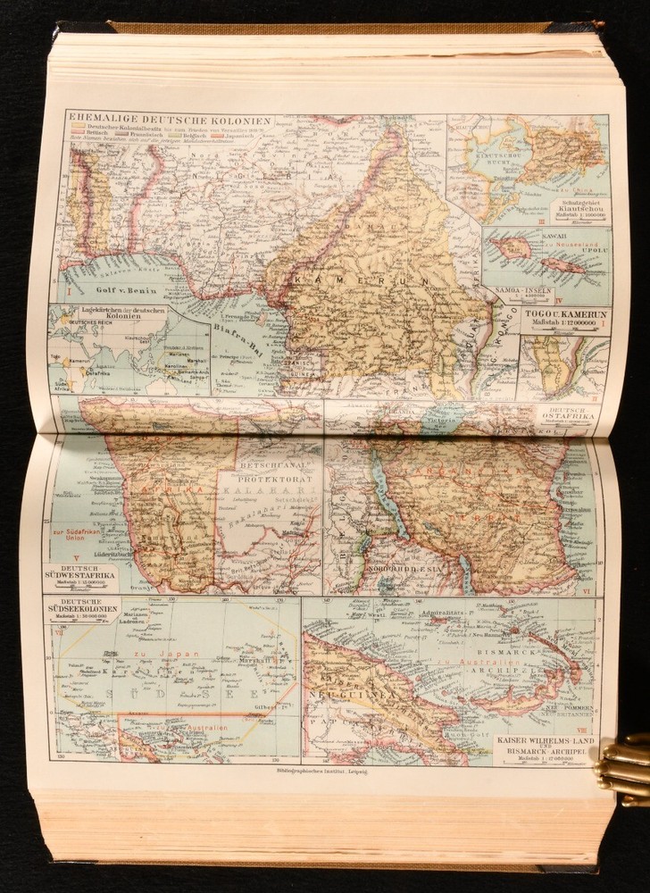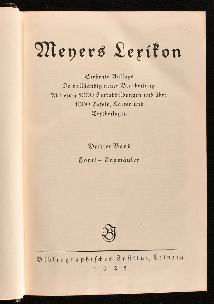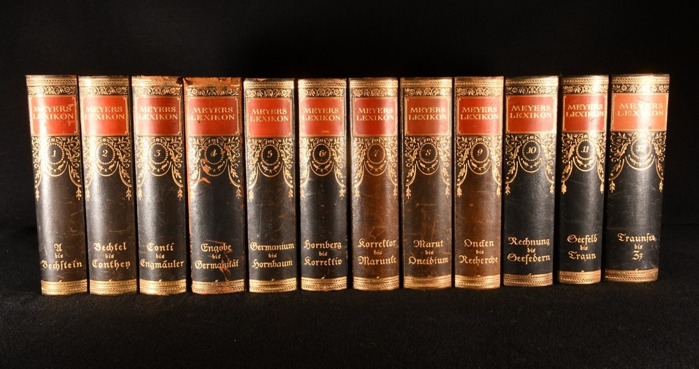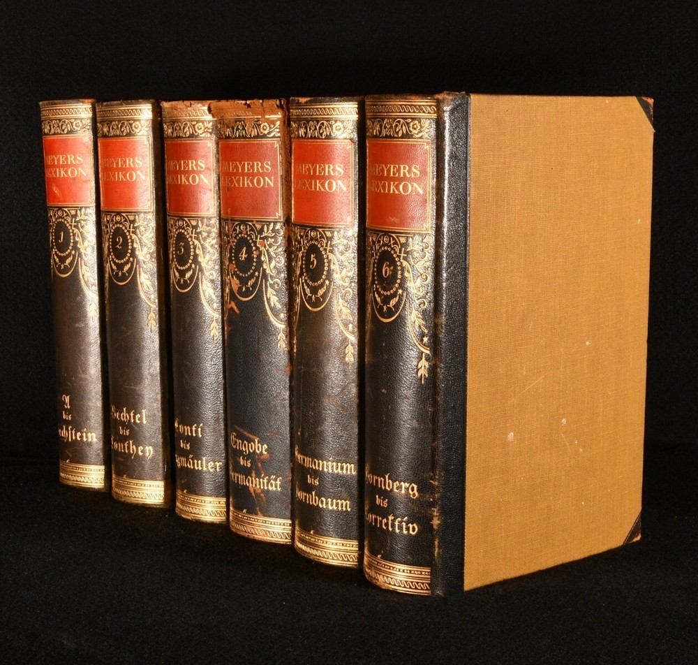 Click here to see our other books! Meyer's Lexikon Anonymous 1924-30 Bibliographisches Institut : Leipzig 10" by 7" SUMMARY A smart and complete collection of Meyer's Lexikon, an important German encyclopaedia, being the seventh edition, richly illustrated with colour plates, in-text illustrations and maps in colour. Decorative Binding Overall Condition: Very Good Indeed This book weighs 30 KG when packed UK Postage: £ 4.49 US Postage: £ 99.99 EU Postage : £ 49.99 European Postage: £ 99.99 Asia Postage: £ 187.99 Worldwide Postage: £ 276.99 DESCRIPTION Meyer's Lexikon was a German encyclopaedia which first appeared in 1839. This is the seventh edition, complete in twelve volumes; this was smaller than previous editions as a result of the economic depression in Germany during the 1920s. Illustrated with around five thousand in-text illustrations, over one thousand plates and maps. This includes plates in colour, folding plates and maps in colour. Collated, complete. In the German language. Complete in twelve volumes. Three supplementary volumes were released later. An excellent collection of the seventh edition of this important German encyclopaedia, the final edition completed before the Second World War and Nazification. CONDITION In a half calf binding. Externally generally smart, with just slight wear to the leather spines of most volumes and some bumping to the extremities. Volumes 3 and 4 have more rubbing to the head of the spine, with volume 4 having some slight rubbing to the tail as well. Volumes 7,8, and 9 are a little more faded than the other volumes. Internally, firmly bound. Pages are bright and clean. Overall Condition: Very Good Indeed GLOSSARY OF TERMS Overall Condition (Dustwrapper condition rating is shown after that for the book itself, where a dustwrapper is present) Fine - Very well preserved copy showing very little wear Very Good Indeed - Only one or two minor faults, really a very attractive copy Very Good - Quite a wide term meaning no major faults but probably several smaller ones often expected given the age of the book, but still a respectable copy Good - Meaning not very good. Some more serious faults as will be described in the condition report under 'condition' Good Only - Meaning one or more faults that could really do with repair Fair - As with good only above but with other faults leaving a compromised copy even after repair Poor - Really bad and possibly seriously incomplete. We only sell books in this condition where their rarity or value makes them attractive none the less. Major defects will be described. GUARANTEE We offer a full money back guarantee on our descriptions. Please ask for details and conditions. We prefer PAYPAL. If you pay via PAYPAL we will post the item off the same or the next working day with the postage you have selected. Please note we cannot accept USD cheques