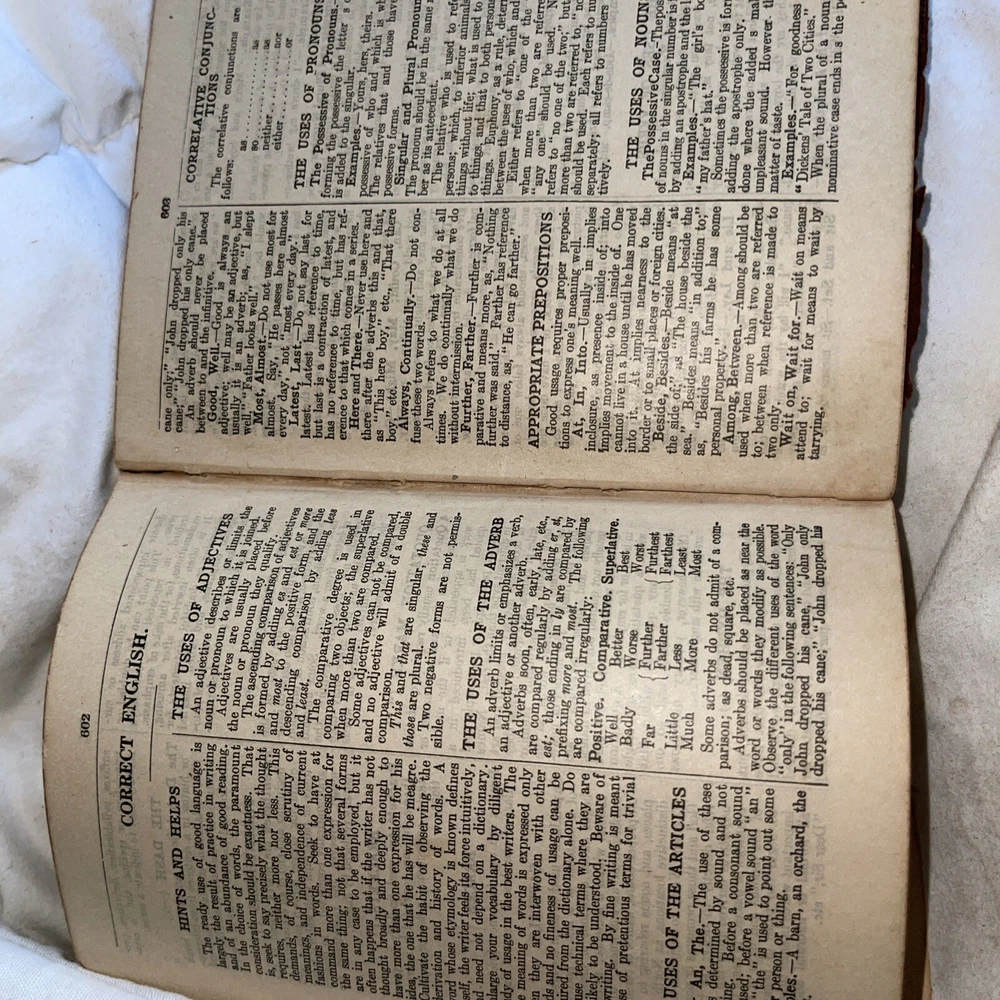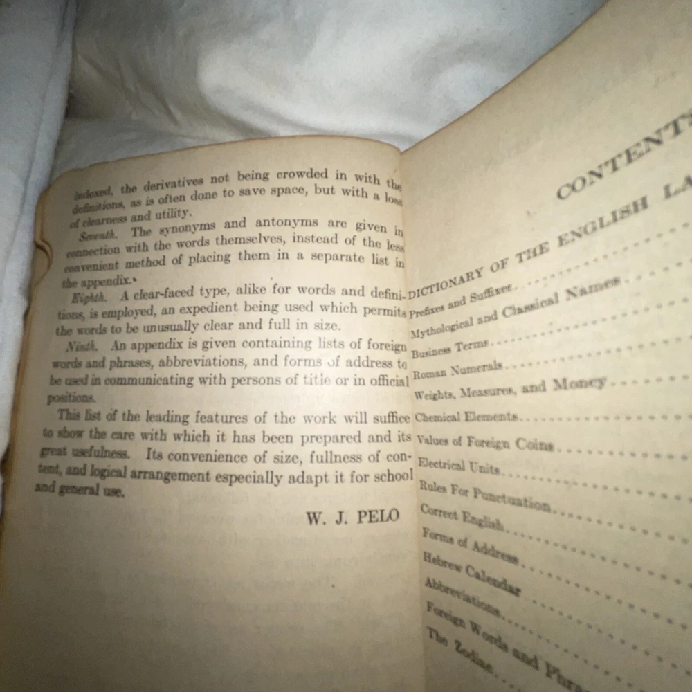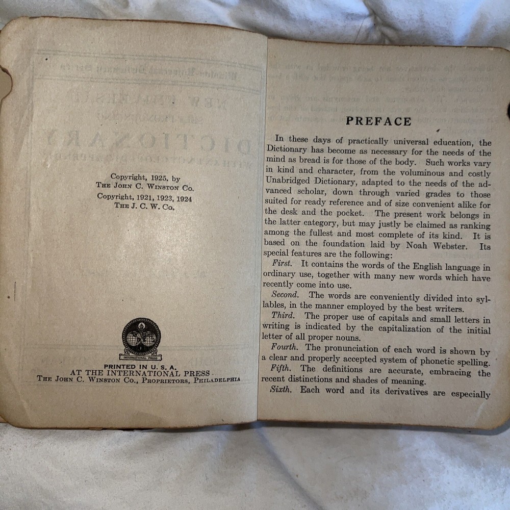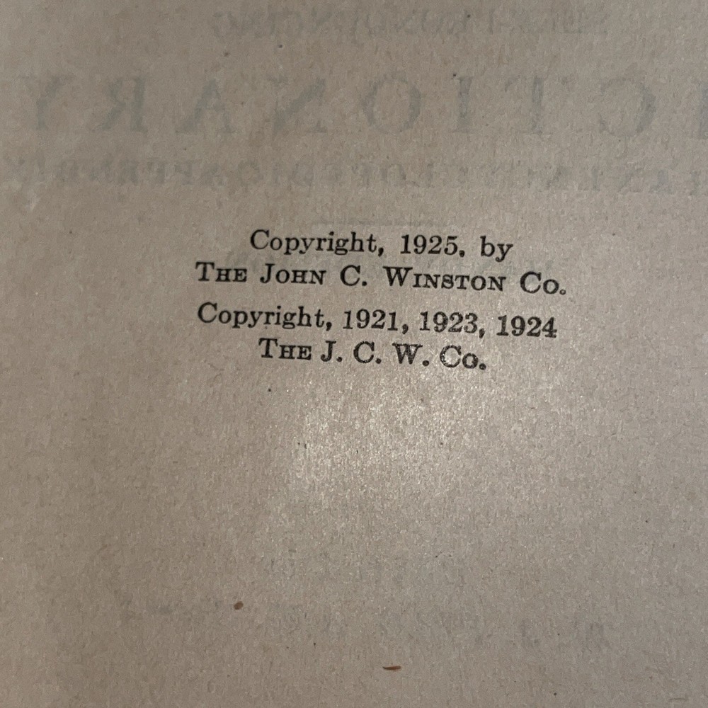 This is a unique piece for avid book collectors and enthusiasts alike. The 1925 THE NEW UNIVERSAL DICTIONARY features a beautiful leather-bound cover from the John C. Winston Company, making it a stunning addition to any collection. Its contents include an extensive list of words and definitions, with a focus on the English language. This antique dictionary covers a range of topics and subjects, making it a valuable resource for anyone interested in language and literature. Don't miss the chance to add this timeless piece to your collection.Handy Edition.Size-height 5 inches Width-4 inches Thickness-1.5 inches This dictionary is almost 100 years old. The dictionary is intact and all pages are readable and not torn. The dictionary shows its age by the loose paper in the beginning of the dictionary. The binding is a little loose. The dictionary is in perfect working condition but you just need to be gentle.See pictures of the dictionary’s condition and I also included what information is contained in the dictionary. This is a great resource for learning or it can be used as a conversation piece.Small enough that it will fit in your purse/backpack or pocket.