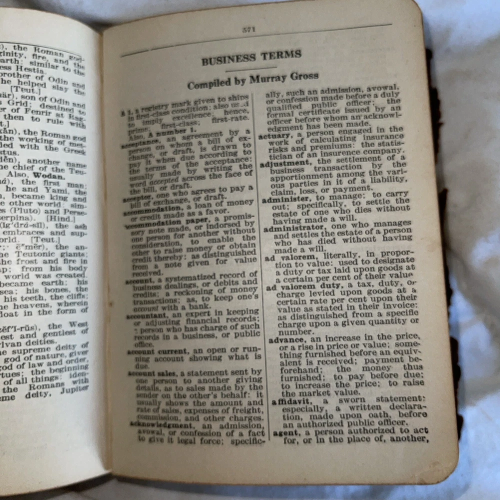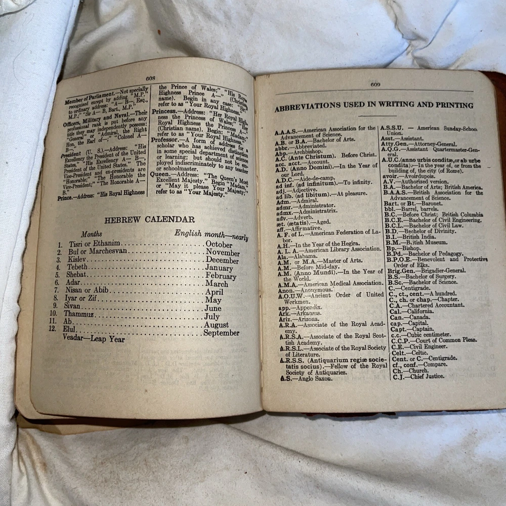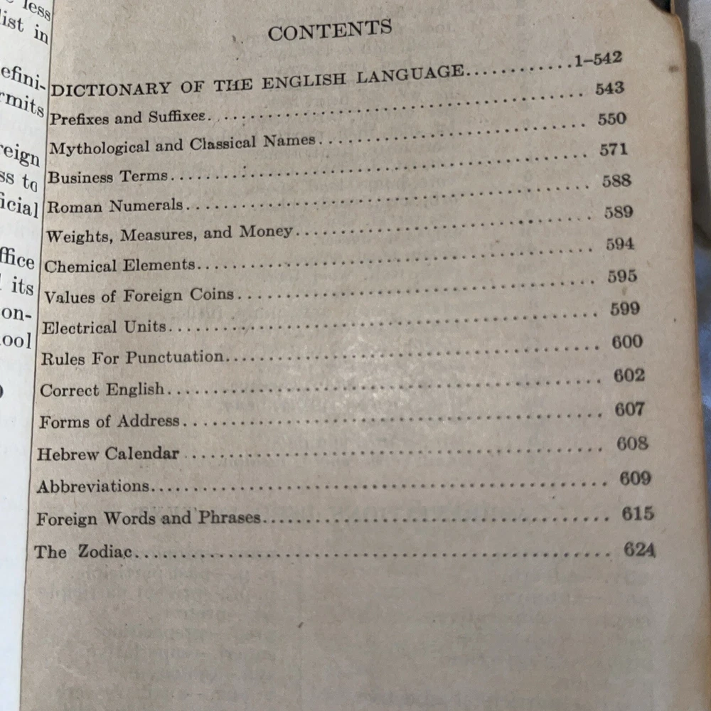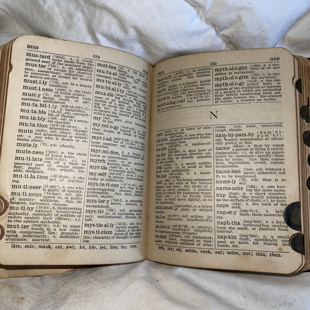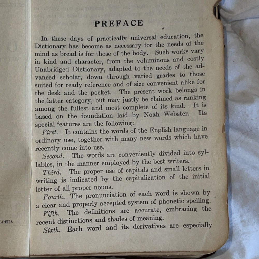 This is a unique piece for avid book collectors and enthusiasts alike. The 1925 THE NEW UNIVERSAL DICTIONARY features a beautiful leather-bound cover from the John C. Winston Company, making it a stunning addition to any collection. Its contents include an extensive list of words and definitions, with a focus on the English language. This antique dictionary covers a range of topics and subjects, making it a valuable resource for anyone interested in language and literature. Don't miss the chance to add this timeless piece to your collection.Handy Edition.Size-height 5 inches Width-4 inches Thickness-1.5 inches This dictionary is almost 100 years old. The dictionary is intact and all pages are readable and not torn. The dictionary shows its age by the loose paper in the beginning of the dictionary. The binding is a little loose. The dictionary is in perfect working condition but you just need to be gentle.See pictures of the dictionary’s condition and I also included what information is contained in the dictionary. This is a great resource for learning or it can be used as a conversation piece.Small enough that it will fit in your purse/backpack or pocket.