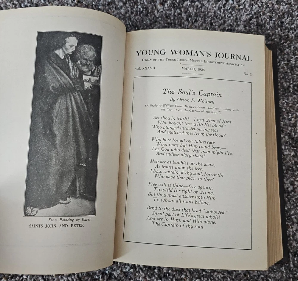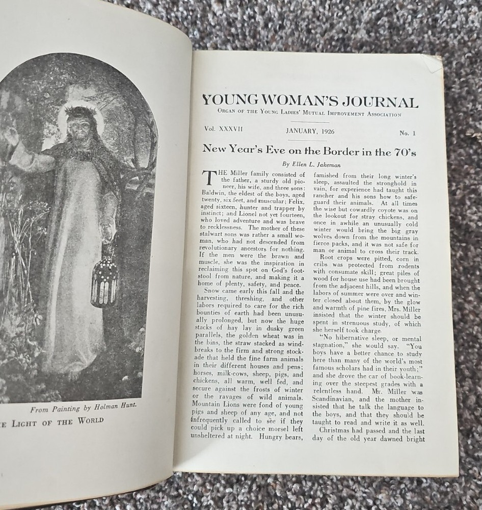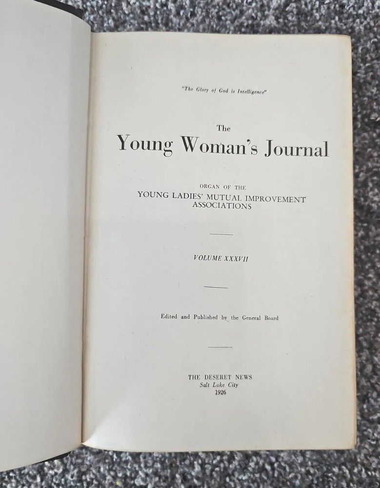 THE YOUNG WOMAN'S JOURNAL Volume 37 The Deseret News 1926 Measures 6" x 9" and is 848 pages Condition: The leather hardcover is very worn. Both spine corner coverings are missing. The boards are still firmly attached to the book with the binding in excellent condition. The interior is in excellent, like-new condition.