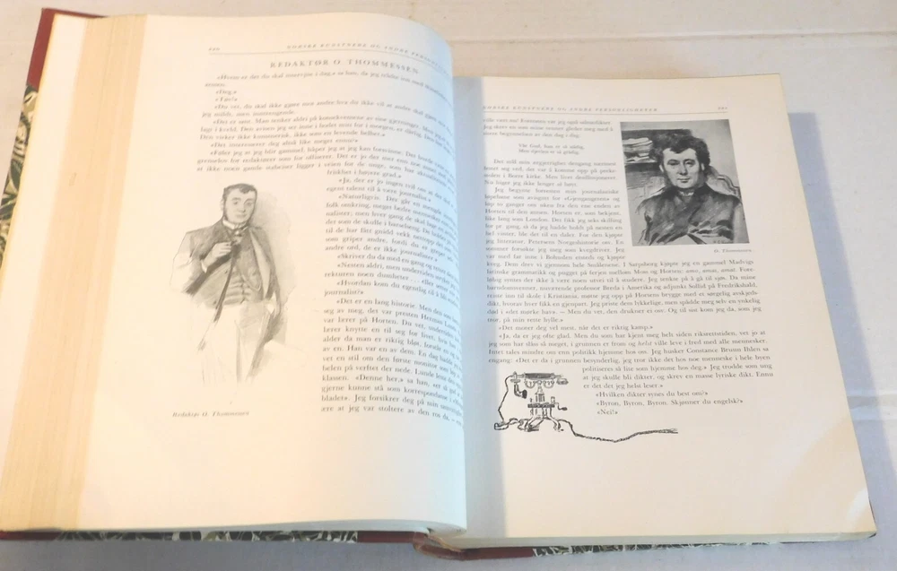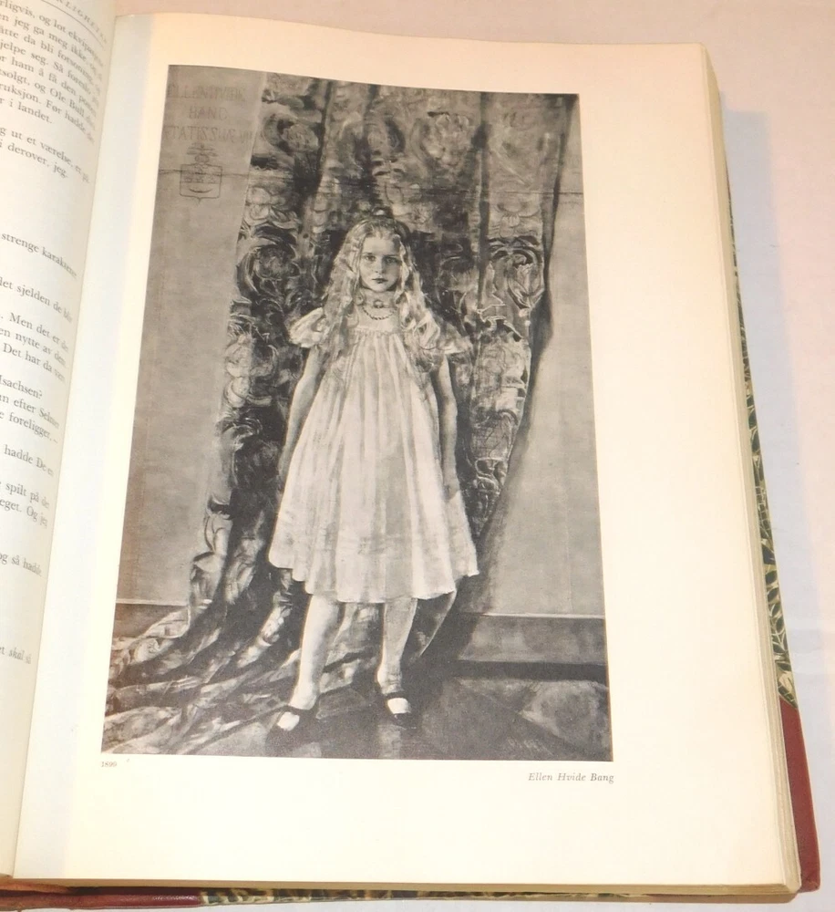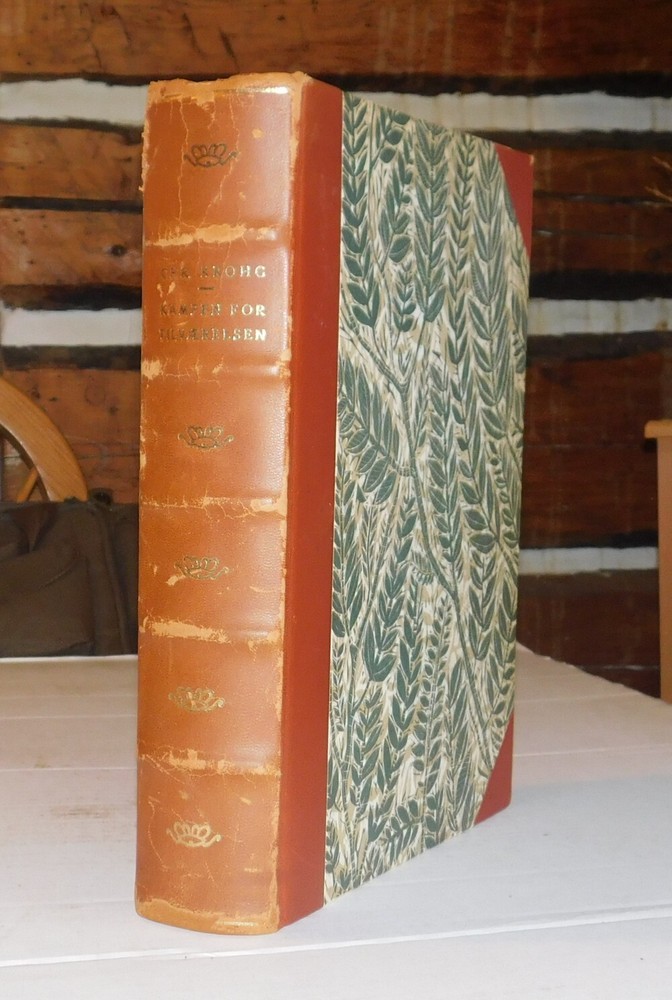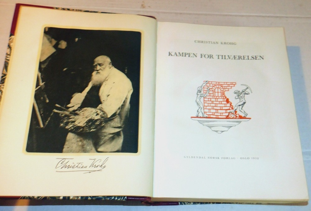 Krohg, Christian. KAMPEN FOR TILVAERELSEN. Oslo: Gyldendal Norsk Forlag, 1952. Quarto [approximately 12-1/4 inches high by 9-1/4 inches wide], three quarters reddish brown calf & decorative boards titled in gilt between raised bands on the spine. The binding is bumped and the spine & the corners of the covers are rubbed. The head of the spine & the top corner of the front cover are lightly chipped. Half-title, title, [iv] & 806 pages. Illustrated with color plates & a black & white portrait frontispiece. Also with full-page & textual illustrations and vignettes in black & white. The bottom page corners are lightly bumped. There is a tiny stain to the fore-edge. There is a small area of rubbing to the margin of the illustration on page 23 with a tiny piece out, which has been partially repaired with tape on the verso. Very good. First edition. A collection of Krohg's artwork, journalism and other writings, edited by Johan Borgen. N.B.: The text is in Norwegian. Christian Krohg [1852-1925] was a Norwegian painter, illustrator, author and journalist. He was a leading figure in the transition from romanticism to naturalism which characterized this period of Norwegian art. He chose subjects from everyday life and was well known for his paintings of prostitutes. His 1886 novel "Albertine" was about a prostitute and caused a scandal when it was published. Krohg was the founding editor of the journal "Impressionisten" in 1886 and was a journalist for the Oslo newspaper "Verdens Gang" from 1890 to 1910, for which he wrote remarkable portrait interviews. TERMS: Shipping charges are calculated based on the total packed weight of this item. New York State residents will be assessed and charged the relevant sales tax. All items are guaranteed authentic and as described. Be sure to add me to your favorites list ! Check out my other items !