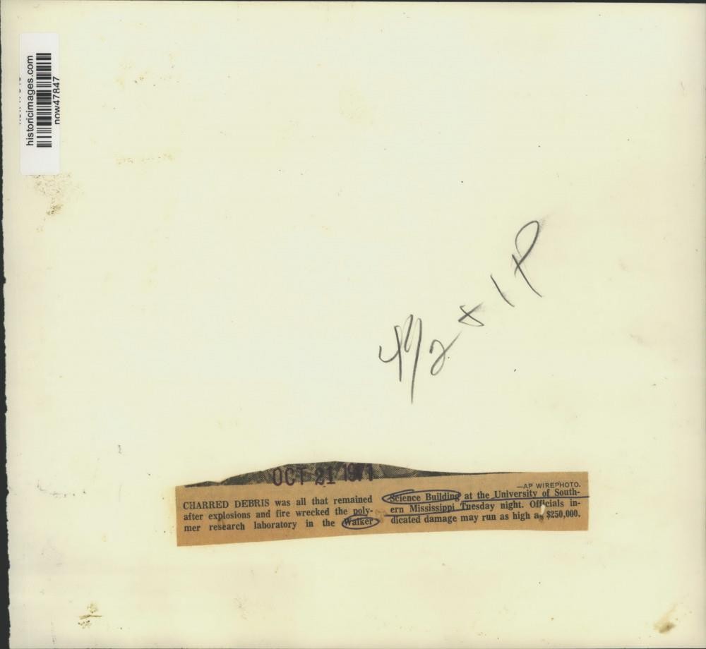 ebay template Note: Please study the images carefully to determine the condition of this vintage photograph, as it may not be in perfect condition. It may contain wrinkles, cracks, and possibly even tears due to its age and how it was handled before it got to us. A scanner may interpret colors and contrast differently than human eyes will, so it is possible that the actual photograph may be slightly darker or lighter in person. This vintage photograph is offered for sale as a collectible item and conveys no transfer of copyright. 1971 Press Photo Walker Science Building at Univ. of Southern Mississippi ruins This is an original press photo. Walker Science Building at Univ. of Southern Mississippi ruins --- Charred debris was all that remained after explosions and fire wrecked the polymer research laboratory in the Walker Science Building at the University of Southern Mississippi Tuesday night. Officials indicated damage may run as high as $250,000. Photo measures 9 x 8 inches. Photo is dated 10-21-1971. PHOTO FRONT PHOTO BACK Historic Images Part Number: now47847 Sell Smarter with Kyozou. Inventory and Ecommerce Management