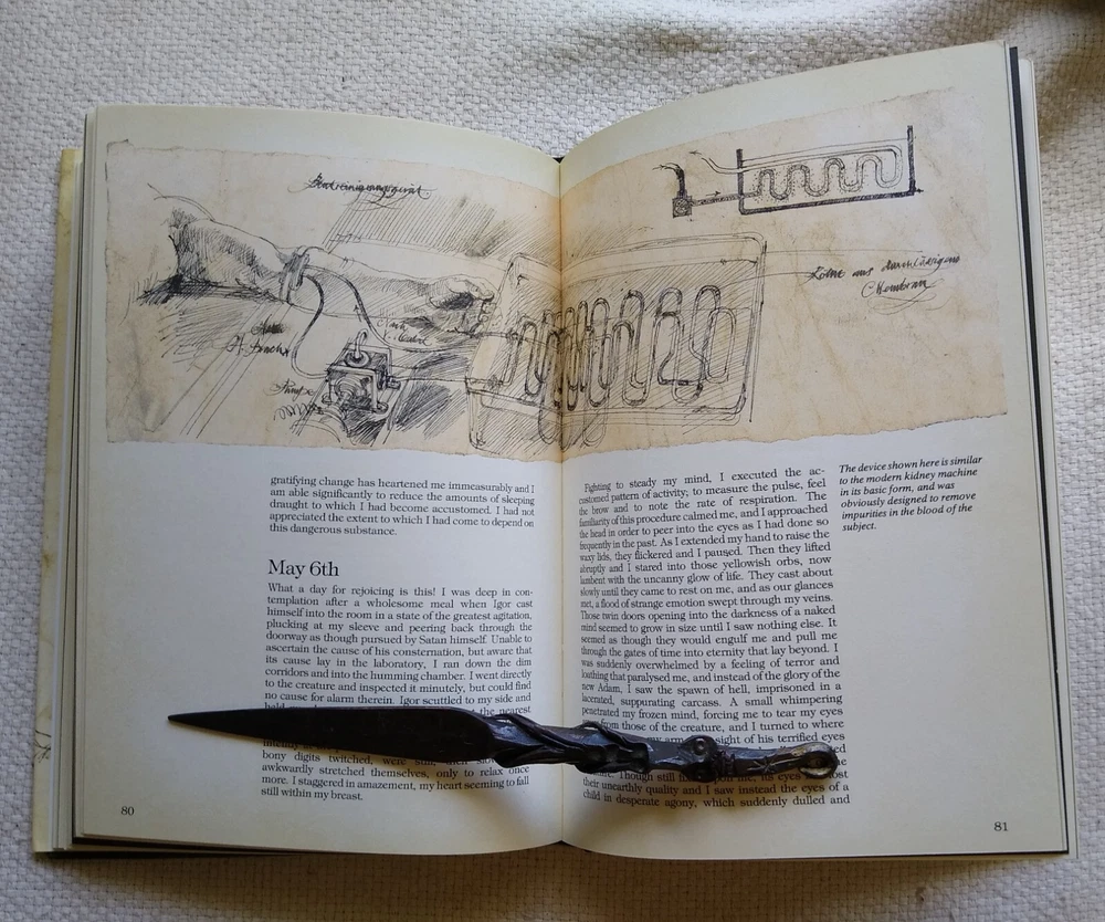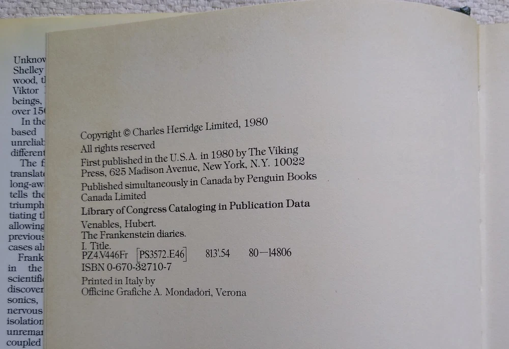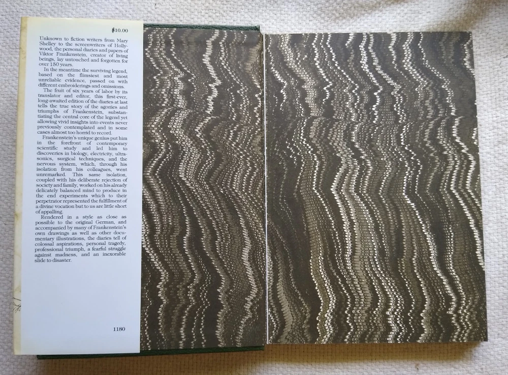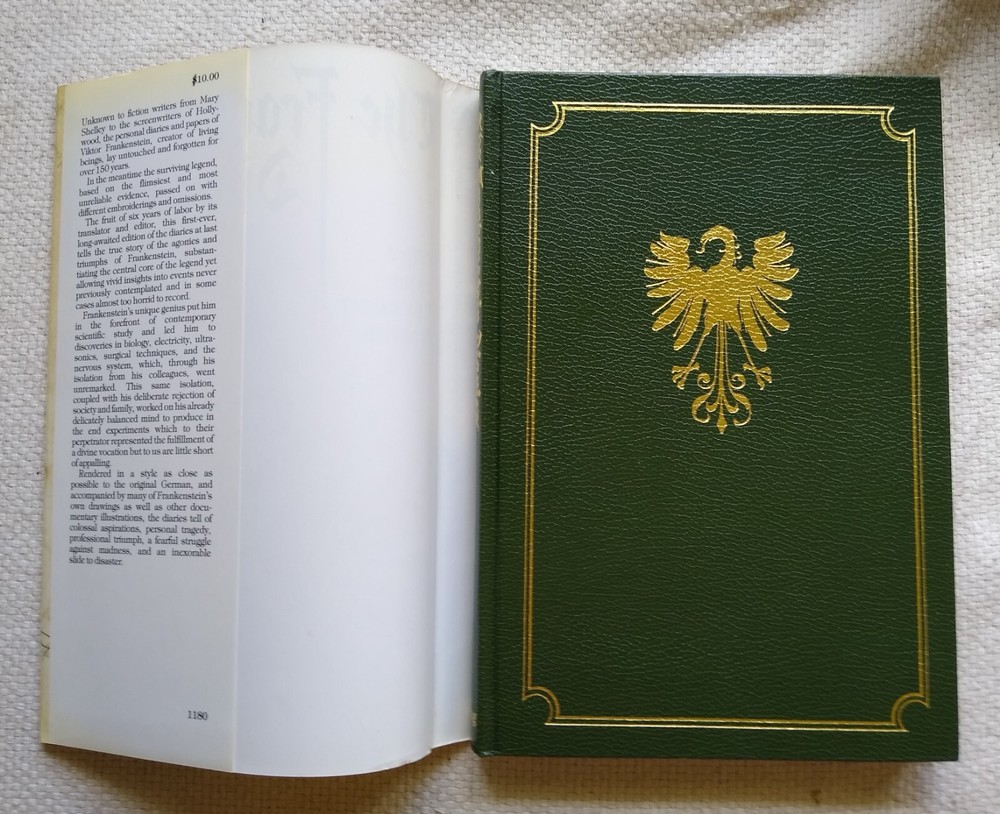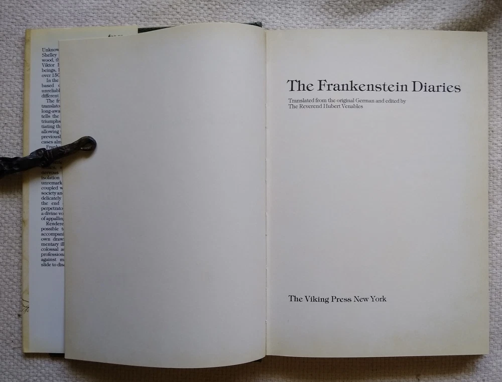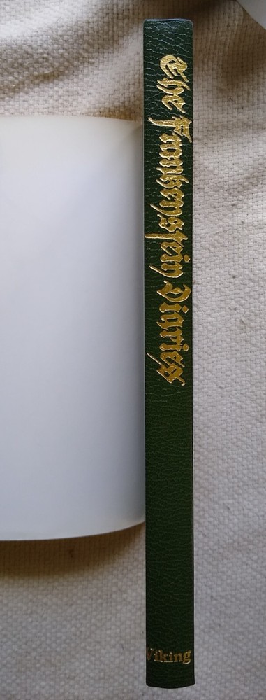 The Frankenstein Diaries Edited by the Rev. Hubert Venables The Viking Press New York 1980 Printed in Italy 0670327107 Leatherette hardcover with dust jacket 9.75 x 6.75 inches Decorated endpapers 120 pp Heavily illustrated throughout Condition: Very Good+. Clean, with some minimal wear. No names or markings. Binding fully intact.