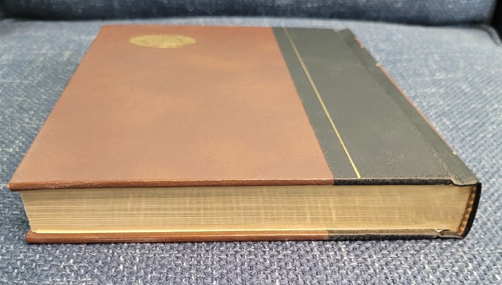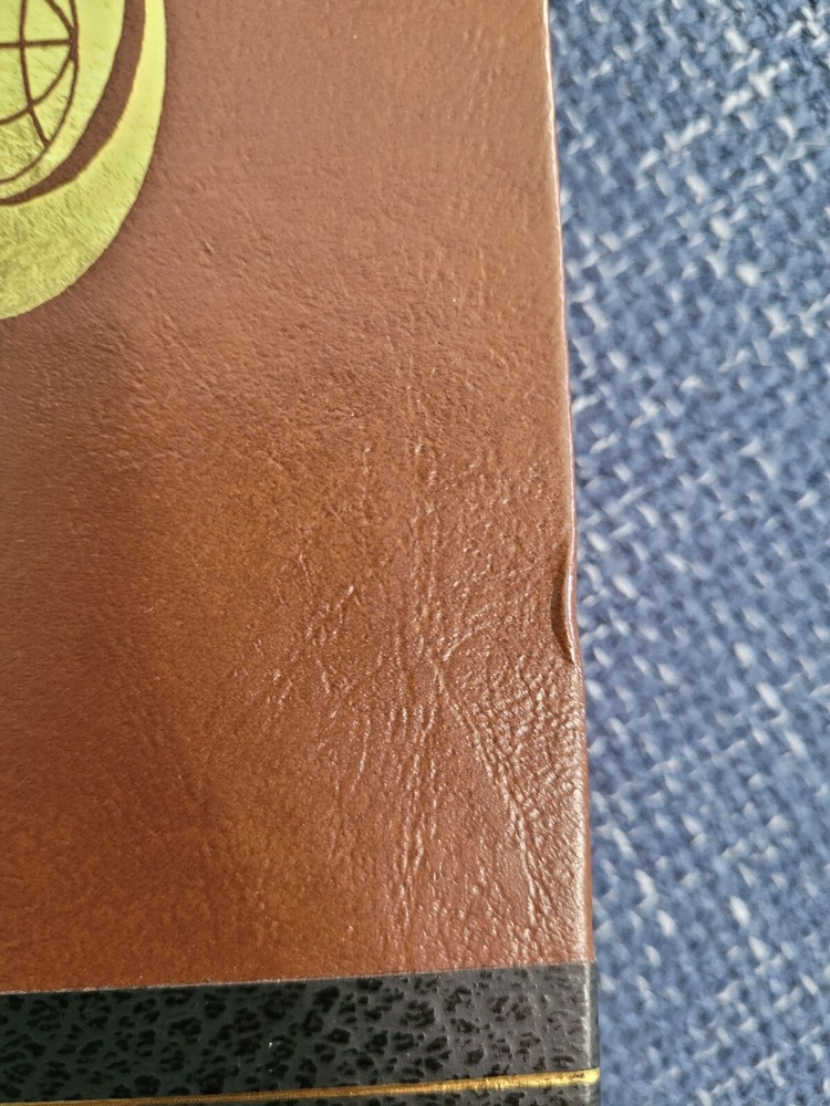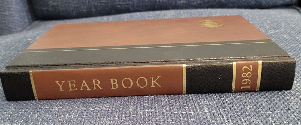 1982 World Book Year Book Encyclopedia. This book is in near perfect condition except for a small ding in the front cover on the bottom center (see picture). The top edge is gilded and the binding has a leather look. Pictures are included. Thanks for looking.
