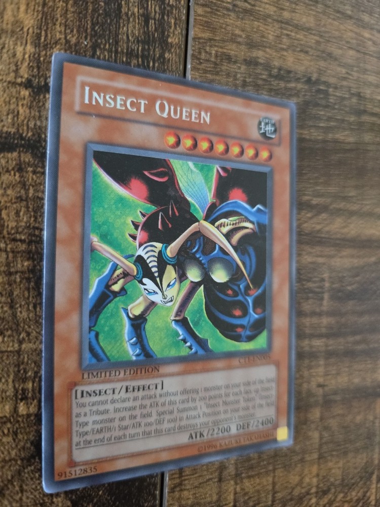 from personal collection. The 1996 Limited Edition Holo Insect Queen CT1-EN005 is a highly sought after Yu-Gi-Oh! TCG card from the 2004 Collectors Tin set. This Secret Rare card features an Insect-Type attribute with a high defense of 2400 and an impressive attack power of 2200. With its special abilities and unique design, this Earth-themed card is a valuable addition to any collector's deck. Konami, the manufacturer behind this limited edition card, ensures quality and authenticity in this collectible piece for fans of the game.