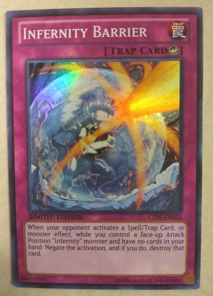 1996 Yu-Gi-Oh! TCG "INFERNITY BARRIER" [TRAP CARD] Limited Edition HOLO FOIL WHITE writing on Title Card CT09-EN023. All item information prefilled by using Ebay's Image Detection App. You will receive the exact car d(s) pictured. FREE SHIPPING & HANDLING!! If you purchase multiple items that include a shipping charge, we offer reduced shipping on items paid for AND shipped on the same invoice. Please request 'combined shipping' prior to paying for your order and we will send an invoice with the correct reduced shipping amount. The more you buy the more you save! WeSellSports has been in the sports novelty and collectible business for over 20 years. Expect many more items to be listed for sale each week as we build our Ebay store. We have thousands of novelty items and trading cards in inventory so you may continue to be surprised at the items that will appear.