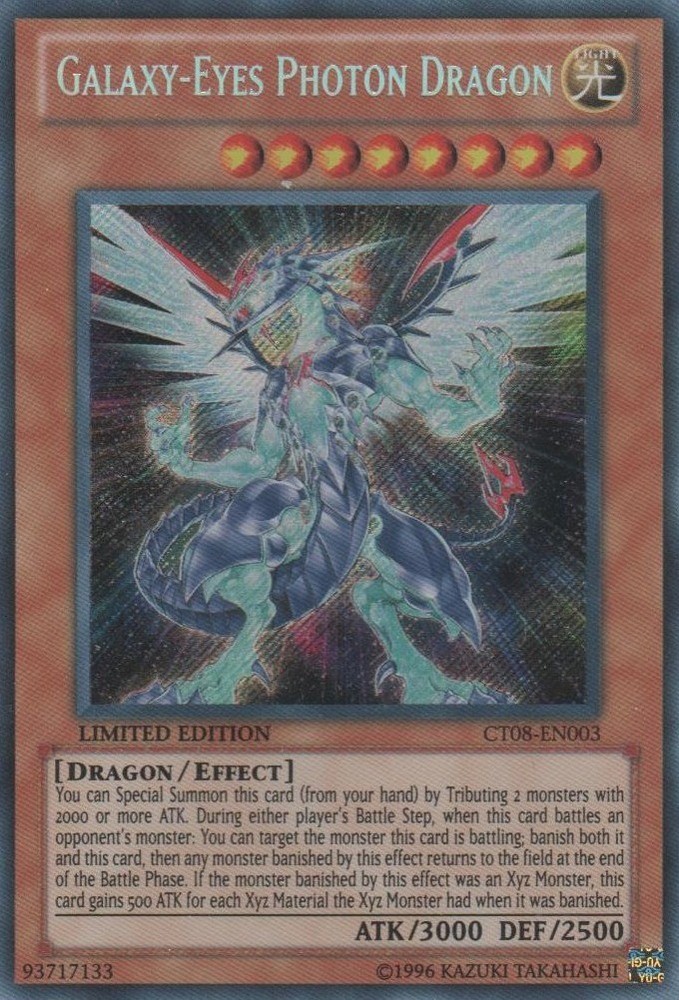 Condition: P Rarity: Secret Rare Limited Edition Galaxy-Eyes Photon Dragon - CT08-EN003 - Secret Rare - Limited Edition IMAGE IS A STOCK IMAGE. PLEASE SEE CONDITION INFO &GRADING DESCRIPTION Domestic Shipping First Class FREE!!! + $0.00 for each additional auction Priority $12.00+ $0.00 for each additional auction International Shipping First Class $7.00+ $0.00 for each additional auction Card Grading Mint/Near Mint (M/NM): Cards in Near Mint condition show minimal to no wear. Excellent (EX): Cards in Excellent condition may have minor wear, or even just slight scuffs or scratches. There are no major defects. Light Played (LP): Cards in Lightly Played condition show moderate wear. Cards in Lightly Played condition may have moderate border wear, mild corner wear, water damage, scratching or scuffing, creases or whitening, minor dirt buildup, or any combination of mild examples of these defects. Played (P): Cards in Played condition show a severe amount of wear. Played condition can include cards that have creasing, border wear. Heavy Play (HP): Cards in Heavily Played condition can exhibit a bend, or crease that may make the card illegal for tournament play, even in a sleeve. Cards in Damaged condition may have extreme border wear, have been written on or major inking extreme corner wear, heavy scratching or scuffing, folds, creases or tears.