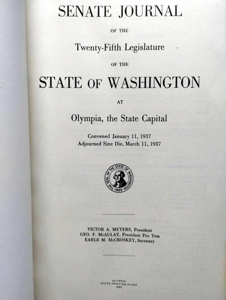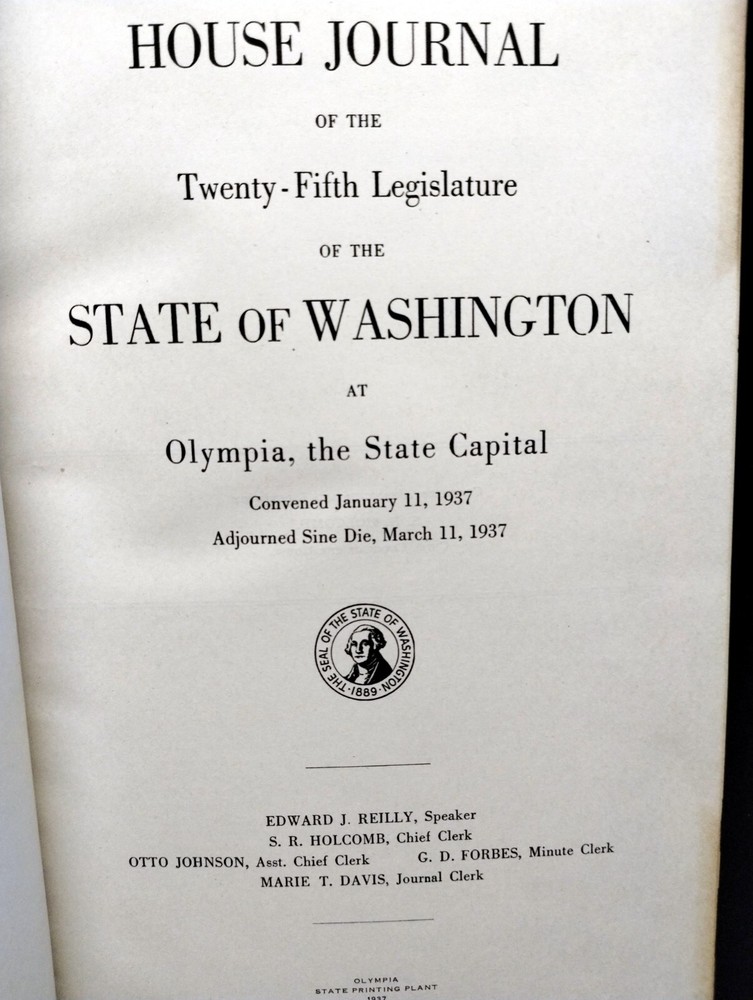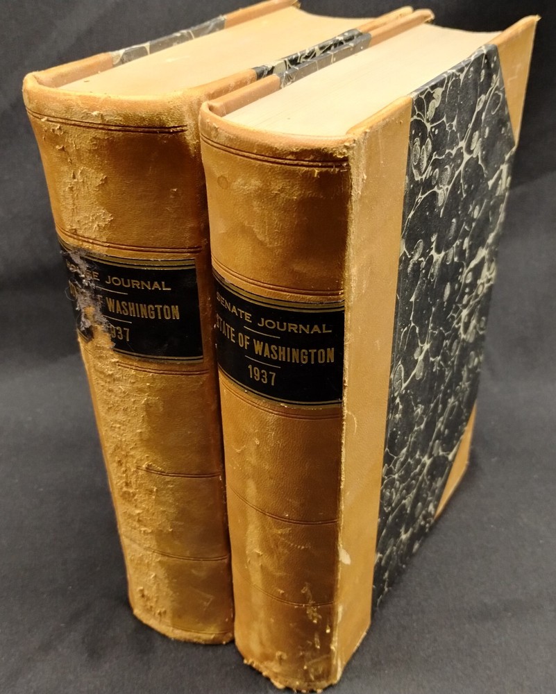 1937 STATE OF WASHINGTON HOUSE JOURNAL & SENATE JOURNAL 3/4 Leather binding (spines and corners). Leather on spines is scuffed some, especially the house journal [see images]. They measure 9 inches by 6 1/4 inches with 1157 and 928 pages. Some foxing but in otherwise GOOD condition. Buying more than one item? We are happy to combine shipping. Be sure to pay for your purchase(s) as soon as possible.We can't ship until you do so. All INTERNATIONAL packages are handled by eBay International Shipping . Buyer is responsible for all taxes and custom fees.