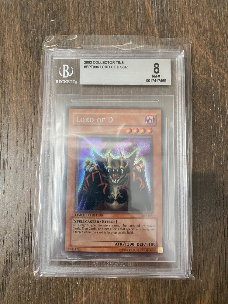 The product is a Yu-Gi-Oh! TCG card from the 2002 Collector Tins series. The card is "Lord of D." with card number 004. It has been graded 8 NM-MT and is a Secret Rare card....