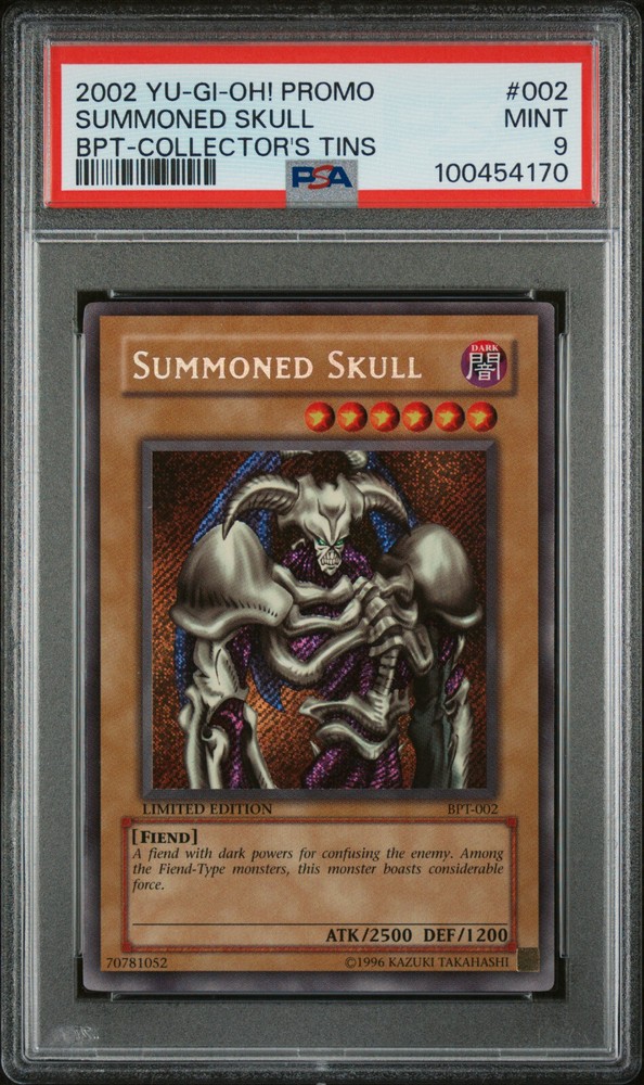 Description Condition: PSA 9 MINT Availability: In Stock You are Purchasing 2002 YUGIOH BPT-002 SUMMONED SKULL SECRET RARE PSA 9 MINT #100454170 Professionally graded by Professional Sports Authenticator (PSA) *PLEASE REVIEW PHOTOS BEFORE BIDDING/BUYING >>MORE GRADED YUGIOH CARDS<< Payment Options Payment is expected within 7 days of your purchase date. We accept all forms of payments through Paypal. Shipping and Handling We ship to all U.S. states, U.S. territories, APO/FPO locations and any international countries listed under our "ship to" heading. Shipping and Handling is calculated based on the combined shipping weight of your item(s). Please use the shipping calculator to estimate your shipping and handling charges. In order to qualify for combined shipping terms, all items must be paid for in one payment; please do not pay until you are done bidding/shopping. Please contact us if you have any questions regarding our shipping and handling terms. Shipping and Delivery Packages are shipped out every Monday, Wednesday, and Friday. Domestic Packages take approximately 2-7 days to arrive. International packages may take a little longer to arrive, typically 1-4 weeks. Please allow ample transit times before inquiring about your package, thank you. Sales Tax All orders shipped to a California address will be subject to Sales Tax. Sales Tax is calculated on the item's price and is not applied to the shipping or other charges. Customer Service We will make every effort to get your purchase is mailed in a timely manner. Please contact us if you have any questions or concerns; we would love to hear any suggestions you have on how we can improve your eBay experience. Thank you for visiting us today.