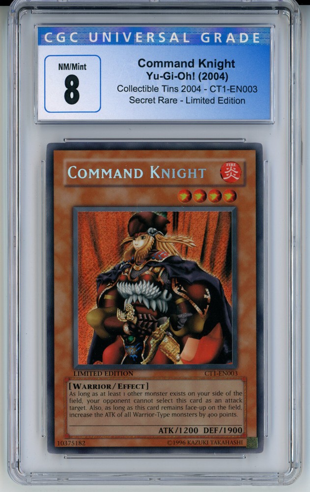 Description Condition: CGC 8 NM Availability: In Stock You are Purchasing 2004 YUGIOH CT1-EN003 COMMAND KNIGHT SECRET RARE CGC 8 NM #4064750014 Professionally graded by Certified Guaranty Company (CGC) *PLEASE REVIEW PHOTO(S) BEFORE PURCHASING >>CHECK OUT OUR OTHER POKEMON<< >>PSA CARDS ON AUCTION<< IG: CARD_RUSH_INC Payment Options Payment is expected within 2 weeks of your purchase date. We accept all forms of payments through Paypal. Shipping and Handling We ship to all U.S. states, U.S. territories, APO/FPO locations and any international countries listed under our "ship to" heading. Shipping and Handling is calculated based on the combined shipping weight of your item(s). Please use the shipping calculator to estimate your shipping and handling charges. In order to qualify for combined shipping terms, all items must be paid for in one payment; please do not pay until you are done bidding/shopping. Please contact us if you have any questions regarding our shipping and handling terms. Shipping and Delivery Packages are shipped out every Monday, Wednesday, and Friday. Domestic Packages take approximately 2-7 days to arrive. International packages may take a little longer to arrive, typically 1-4 weeks. Please allow ample transit times before inquiring about your package, thank you. Sales Tax Sales tax will be automatically collected by Ebay. Customer Service We will make every effort to get your purchase is mailed in a timely manner. Please contact us if you have any questions or concerns; we would love to hear any suggestions you have on how we can improve your eBay experience. Thank you for visiting us today.