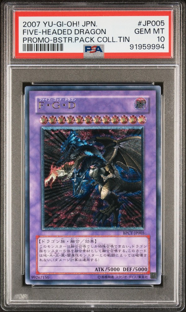 2007 YU-GI-OH! JAPANESE PROMO BOOSTER PACK COLLECTORS TIN #JP005 FIVE-HEADED DRAGON PSA 10 2007 YU-GI-OH! JAPANESE PROMO BOOSTER PACK COLLECTORS TIN #JP005 FIVE-HEADED DRAGON PSA 10 Purchase Info Thank you for your interest in this item consigned with PSA! By purchasing or making an offer on this item, you acknowledge and agree to the following terms: All sales are final. Returns not accepted. Payment must be made upon purchase of the item. All items are sold "as is" and without warranty of Collectors Universe, Inc. (d/b/a PSA), and ANY AND ALL IMPLIED WARRANTIES ARE DISCLAIMED AND EXCLUDED. Sales tax may apply depending on shipping address. PSA does not guarantee that another third-party grading company's authentication or certification of an item as genuine is correct or accurate. Neither a difference of opinion between third-party grading companies about authenticity, nor a company's subsequent reversal of its earlier authentication or certification of an item, will be a basis for rescinding a sale. Any dispute with another third-party grading company relating to the authenticity of an item must be resolved directly with that other company. Collectors' maximum liability in the event of loss or damage to an item during shipping will be the lesser of (a) the price paid for the item and (b) the change in fair market value of the item. You release Collectors from all other liability including for any claims of punitive damages, emotional distress, consequential damages, lost profits, or lost interest, except as prohibited by law. Shipping Purchased Items will be shipped directly from PSA Vault. You stay hands-free. PSA Vault When you purchase this item, you can save on sales tax and selling fees by keeping it in the PSA Vault, official Vault of eBay. Items already in PSA Vault and will be sent to PSA Vault will have no shipping charge Storage of any items with the PSA Vault will be subject to the PSA Vault Terms of Service. Consignment PSA has competitive rates on the world's largest collectibles marketplace with the option to list from the PSA Vault or immediately after PSA authentication and grading. Sale Price Under $100 $100 - $499 $500 - $999 $1,000 - $2,499 $2,500 - $4,999 $5,000+ Seller Fee 16% 14% 13% 10% 9% 7% Sellers pay a single fee as reflected above; no additional eBay fees are incurred. There is a $5 minimum fee on sold items.