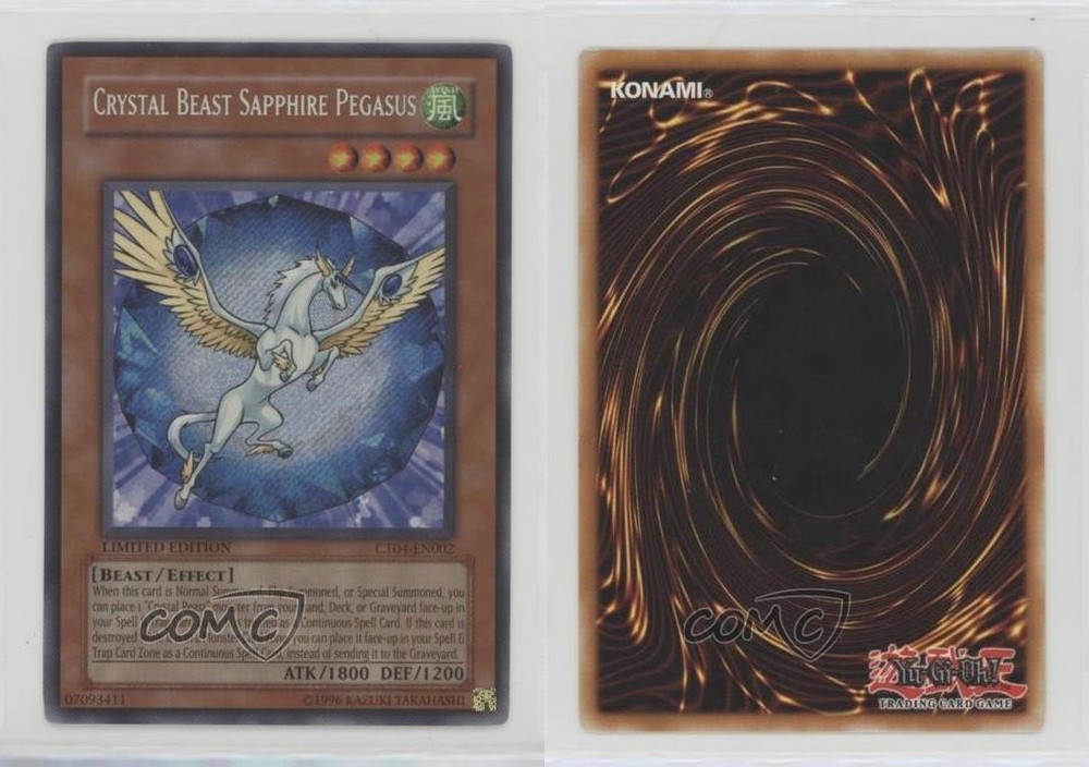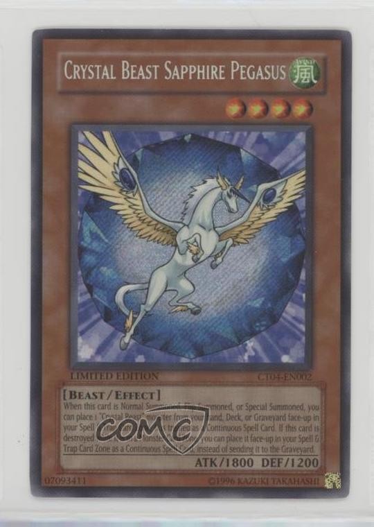 2007 Yu-Gi-Oh! Series 4 - Collectors Tins Limited Edition Promos #CT04-EN002 Crystal Beast Sapphire Pegasus COMC Item: 133807907 - YuGiOh Card - Featuring Crystal Beast Sapphire Pegasus Search for more: 2007 Yu-Gi-Oh! Series 4 Search for more: 2007 Yu-Gi-Oh! Series 4 - Collectors Tins Limited Edition Promos View all of our Listings Auctions Buy It Now About Us Located in the beautiful Pacific Northwest, COMC (Check Out My Cards) is the world's largest consignment service for trading card singles. More than 10,000 people have used our consignment service to list over 50 million trading cards. Find out how we can help you consign your items on eBay by contacting us through eBay messaging. COMC -- "The Safe & Easy Way to Buy & Sell" Raw Condition for Modern Cards Unless otherwise noted, raw modern cards are listed in Near Mint-Mint condition or better. A NM-MT card appears to be Mint at first glance, but upon closer inspection, may exhibit some of the following: minor print defects (e.g. roller marks, print line, dimple), minor scratches, slight edge wear, and slight corner wear. Centering is clearly visible in the images provided and does not factor into our condition assessment. Raw Condition for Vintage Cards Unless otherwise noted, raw vintage cards are listed in Excellent condition or better. An EX card may exhibit some of the following: minor rounding of corners, surface wear, print defects, light scratches, and slight edge wear/chipping. Centering is clearly visible in the images provided and does not factor into our condition assessment. Domestic Shipping Combined shipping for multiple items is available. To receive combined shipping, please ensure all desired items are in your eBay shopping cart before proceeding to checkout. eBay limits orders to 40 items per order. We automatically combine multiple orders placed on the same day. If you place multiple orders on the same day, please contact us to request a refund of applicable shipping costs. Signature confirmation may be required on invoices over $400. All cards are protected and shipped securely. International Shipping COMC offers eBay's International Shipping (EIS) for international orders under $2,500* (see country exceptions below). All duties and import fees are paid at checkout; in the rare event that there are additional import fees upon delivery, these are borne by the buyer. EIS packages route through a shipping hub in Erlanger, KY before shipping to their final destination. Please note that EIS does not allow for combined shipments. The shipping rates are determined by eBay and cannot be adjusted. *Maximum sale price exceptions: Colombia, Kuwait ($2,000); Taiwan ($1,539); Chile, Costa Rica, Guatemala, Honduras, Trinidad and Tobago ($1,000); Antigua and Barbuda, Aruba, Belize, Dominica, Grenada, Philippines, Saint Kitts and Nevis, Saint Lucia, Montserrat, Turks and Caicos Islands ($500); Dominican Republic, El Salvador ($200). Please request a shipping quote through eBay messaging for orders that exceed the maximum sale price supported by eBay's International Shipping. You will be responsible for all duties and import fees for international orders shipped outside the EIS. All cards are protected and shipped securely. Payment COMC does not accept offers on our cards through our eBay storefront. COMC utilizes eBay’s managed payments system. If you are experiencing difficulties making a payment, please contact eBay for assistance. Return Policy Returns are only accepted on the rare occasion the item is not as described. If you are making a return, please initiate the return process through eBay so a mailing label can be provided for you. Prior to listing, our expert team carefully assessed this item to represent it accurately. Please review the description and high-definition images prior to purchasing to ensure this item meets your satisfaction. We welcome you to contact us if you have further questions about this item. Trust and Integrity COMC carefully assesses each item consigned to us to prevent fraudulent items from entering the marketplace. If you believe an item offered on COMC may be fraudulent, please contact us with details so we can investigate the issue. Items we determine are outside our supported items policy may be removed. Last Modified: 5/26/2025 8:42:48 PM PDT