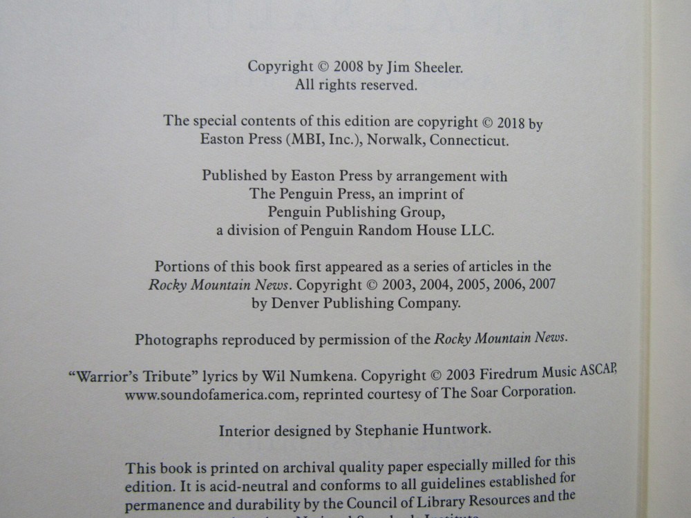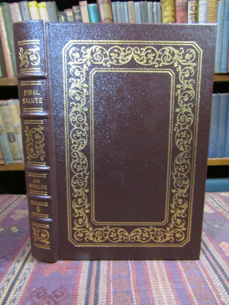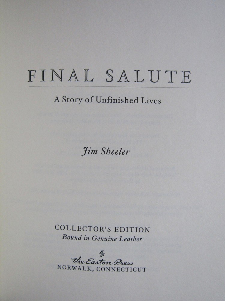 ~~Easton Press Leatherbound Collector's Edition~~ ~ The Center of the Text Block is a Little Uneven ~ Final Salute A Story of Unfinished Lives By Jim Sheeler Norwalk, Connecticut: The Easton Press ~ (2008) ~ ************************************************* Octavo. 280 pages. Hardcover bound in full brown leather with gilt embossing. All edges gilt. There is light wear to the binding, however the text block is slightly uneven with a break in the center (near the photographs), possibly from pressure exerted on the spine. Contains a gold ribbon bookmark. Silk moire send papers. The text is clean and sound. Illustrated with color photographs in the center of the book. ***************************************** We Always Accept Returns if the Item Does Not Match the Description. If You Have any Questions, Please Do Not Hesitate to Ask! *************************************************** Come visit our OPEN SHOP in Greensboro, North Carolina. Shop Hours: 10-6 Mondays ~~ Saturdays ~~Closed on Sundays~~ Pages Past -- Used & Rare Books / 1837 Spring Garden St. / Greensboro, N.C. 27403 We are proud to have serviced the Greensboro area with an open bookshop since 1996 !